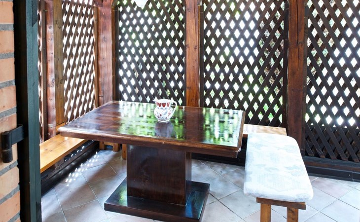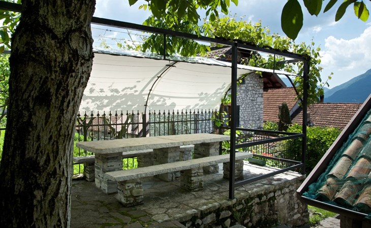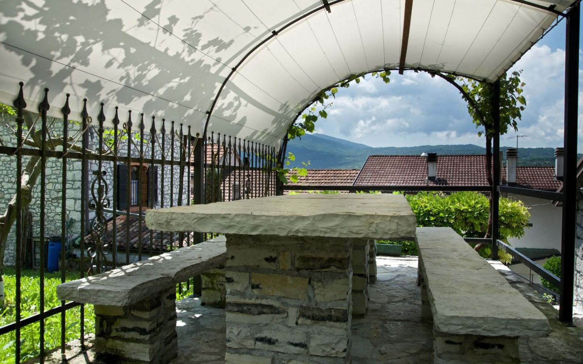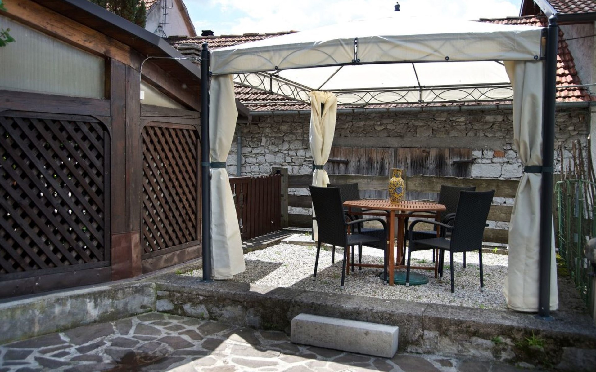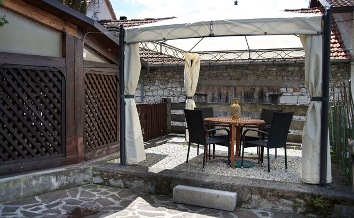 Außen präsentiert sich das Haus mit einem komplett umzäunten Bereich, der Privatsphäre und Sicherheit gewährt. Direkt vor der Haustür stehen Ihnen ein privater Parkplatz sowie ein einladender Essplatz unter einer Zeltüberdachung mit Außenlicht zur Verfügung. Die obere Terrasse verwöhnt mit einem großen Grill und einem malerischen, überdachten Steintisch – perfekt für Mahlzeiten im Freien oder entspannende Stunden unter dem Himmel der Dolomiten.