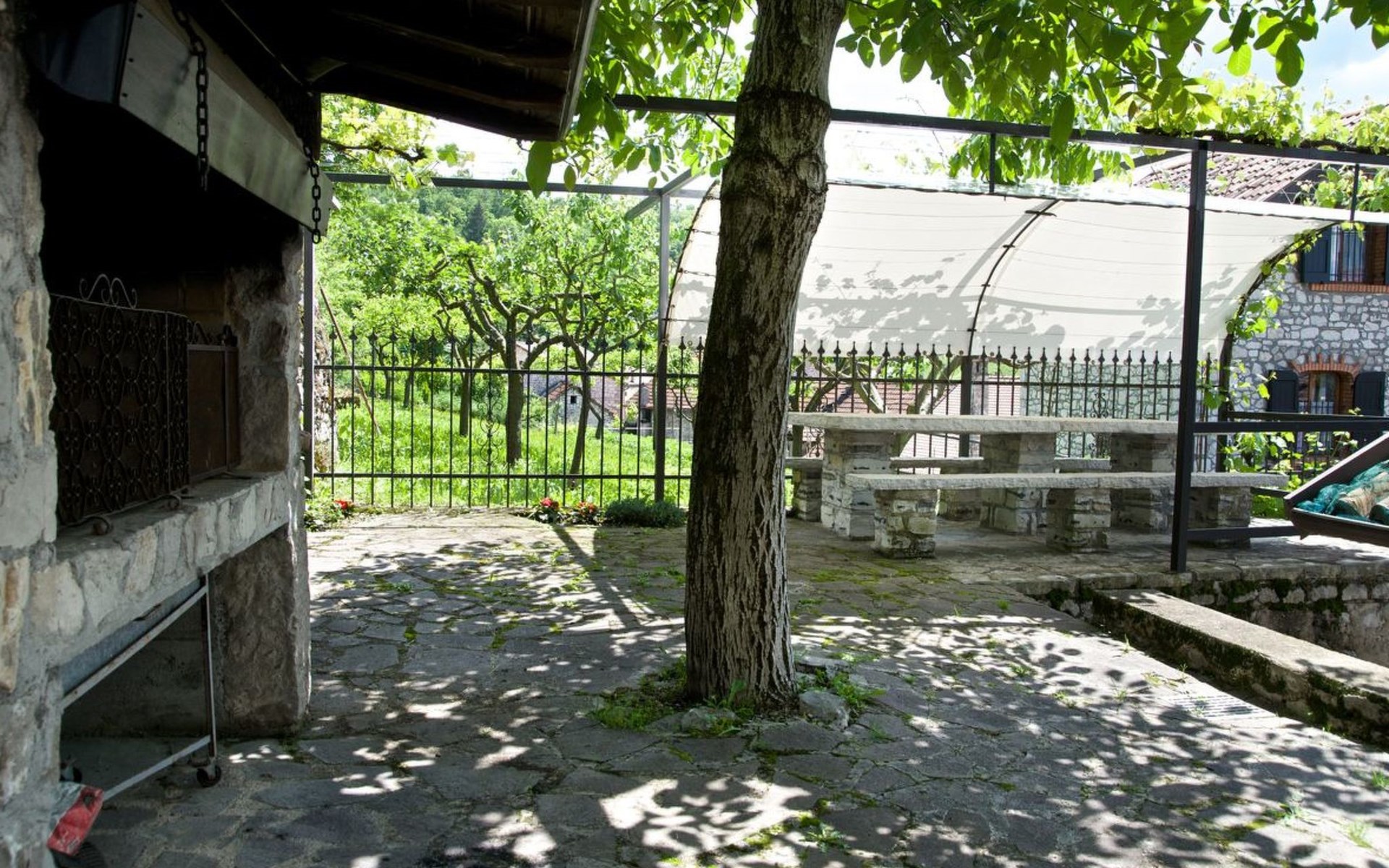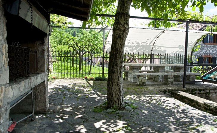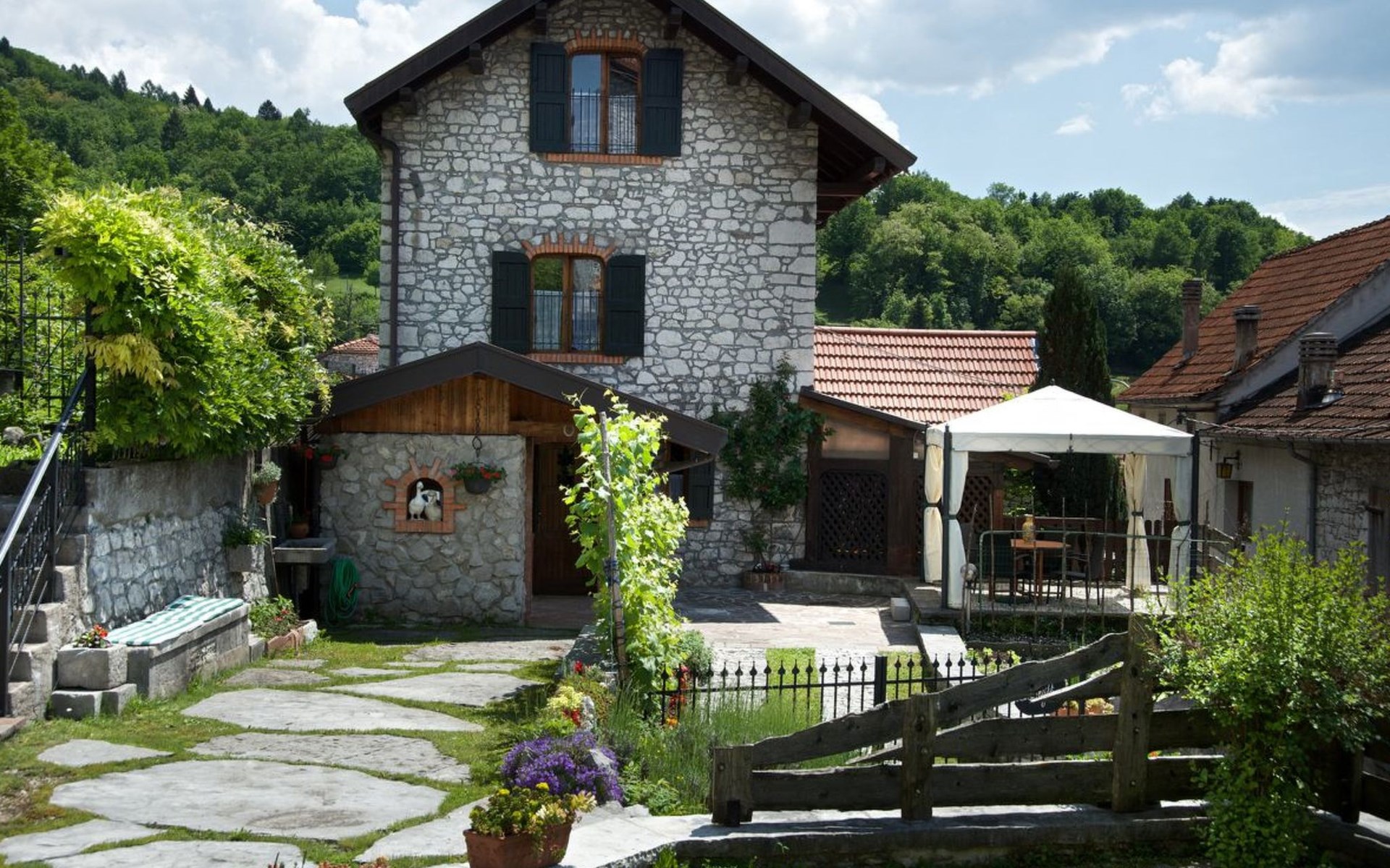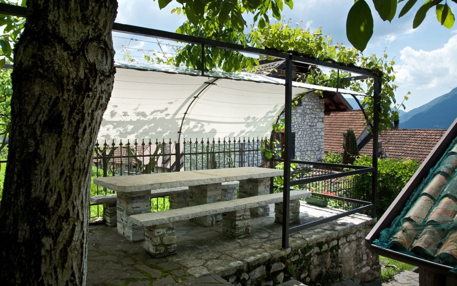 Außen präsentiert sich das Haus mit einem komplett umzäunten Bereich, der Privatsphäre und Sicherheit gewährt. Direkt vor der Haustür stehen Ihnen ein privater Parkplatz sowie ein einladender Essplatz unter einer Zeltüberdachung mit Außenlicht zur Verfügung. Die obere Terrasse verwöhnt mit einem großen Grill und einem malerischen, überdachten Steintisch – perfekt für Mahlzeiten im Freien oder entspannende Stunden unter dem Himmel der Dolomiten.
