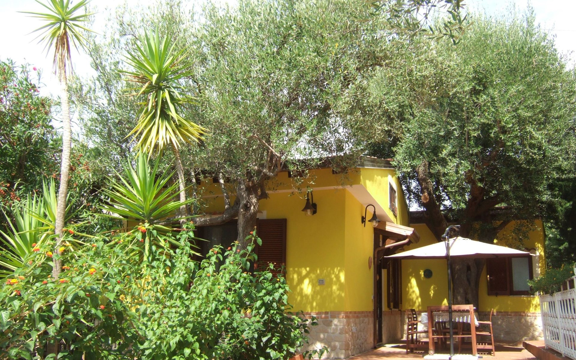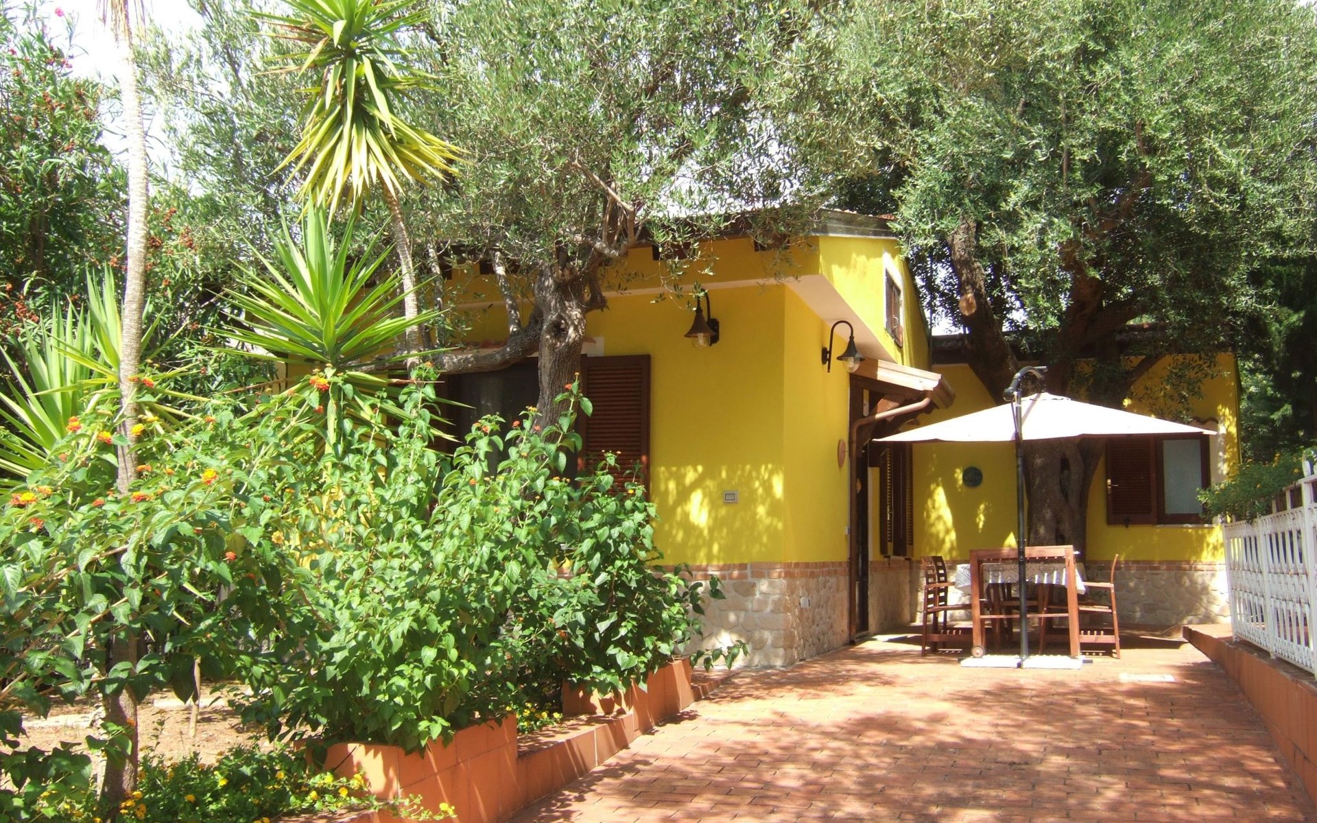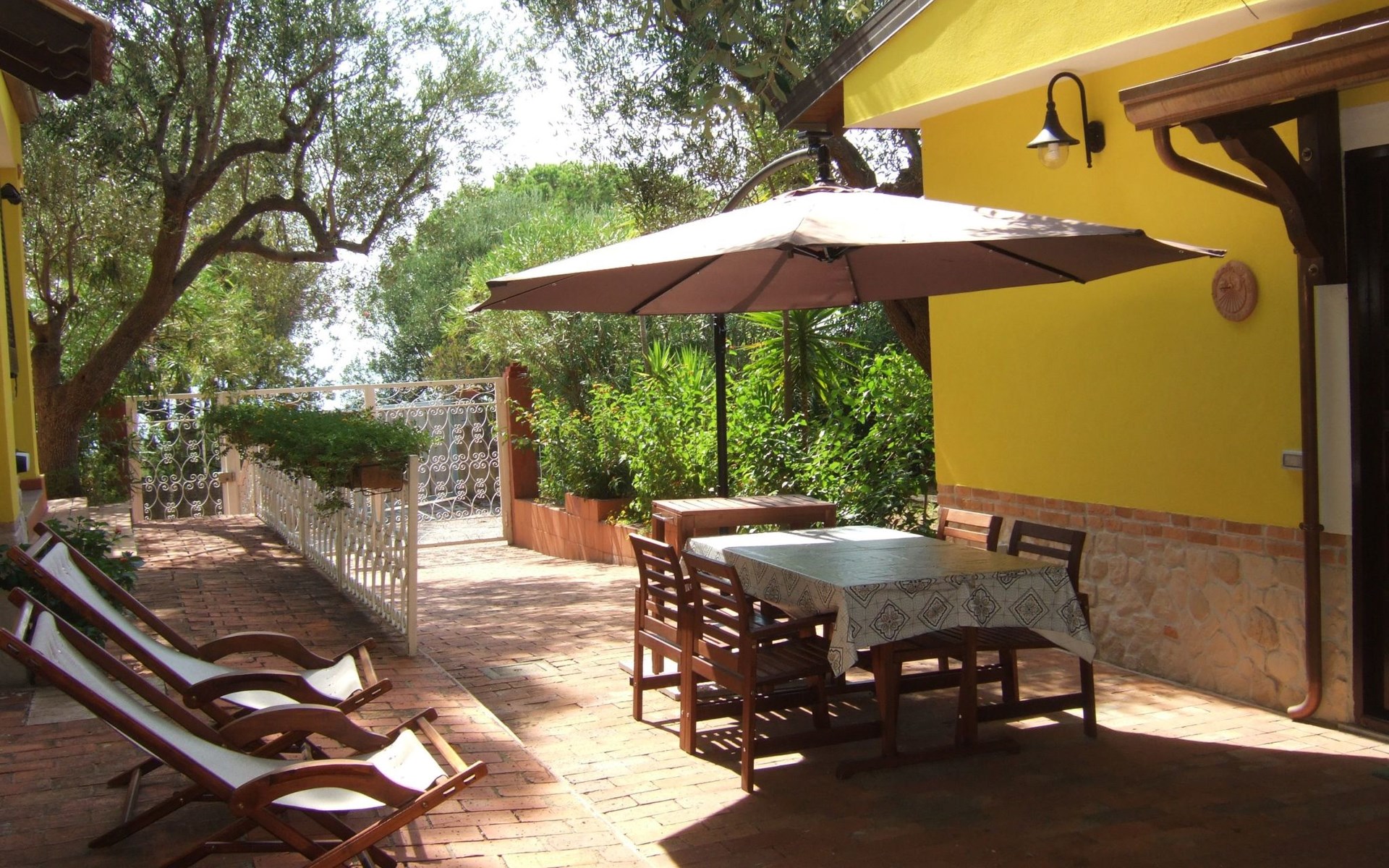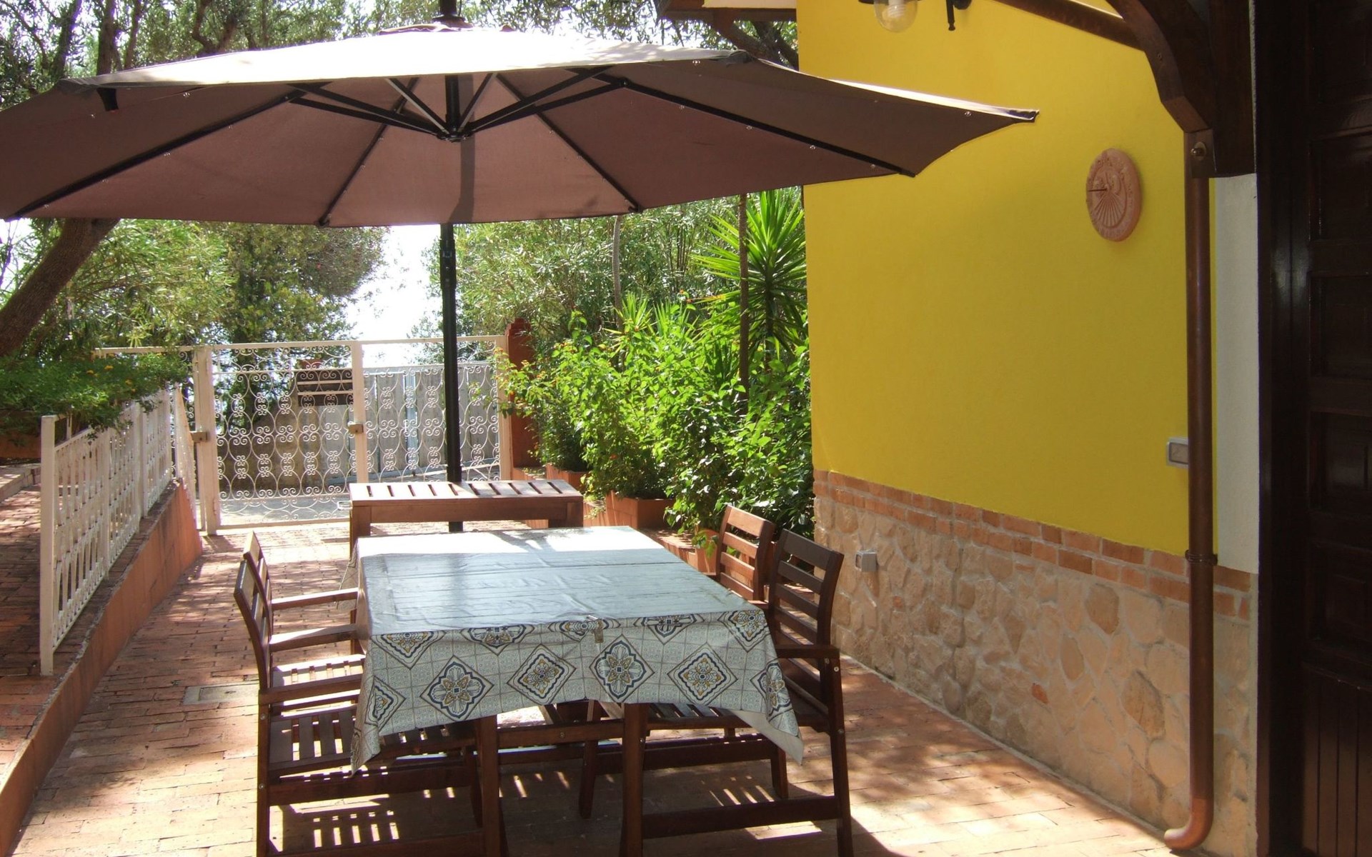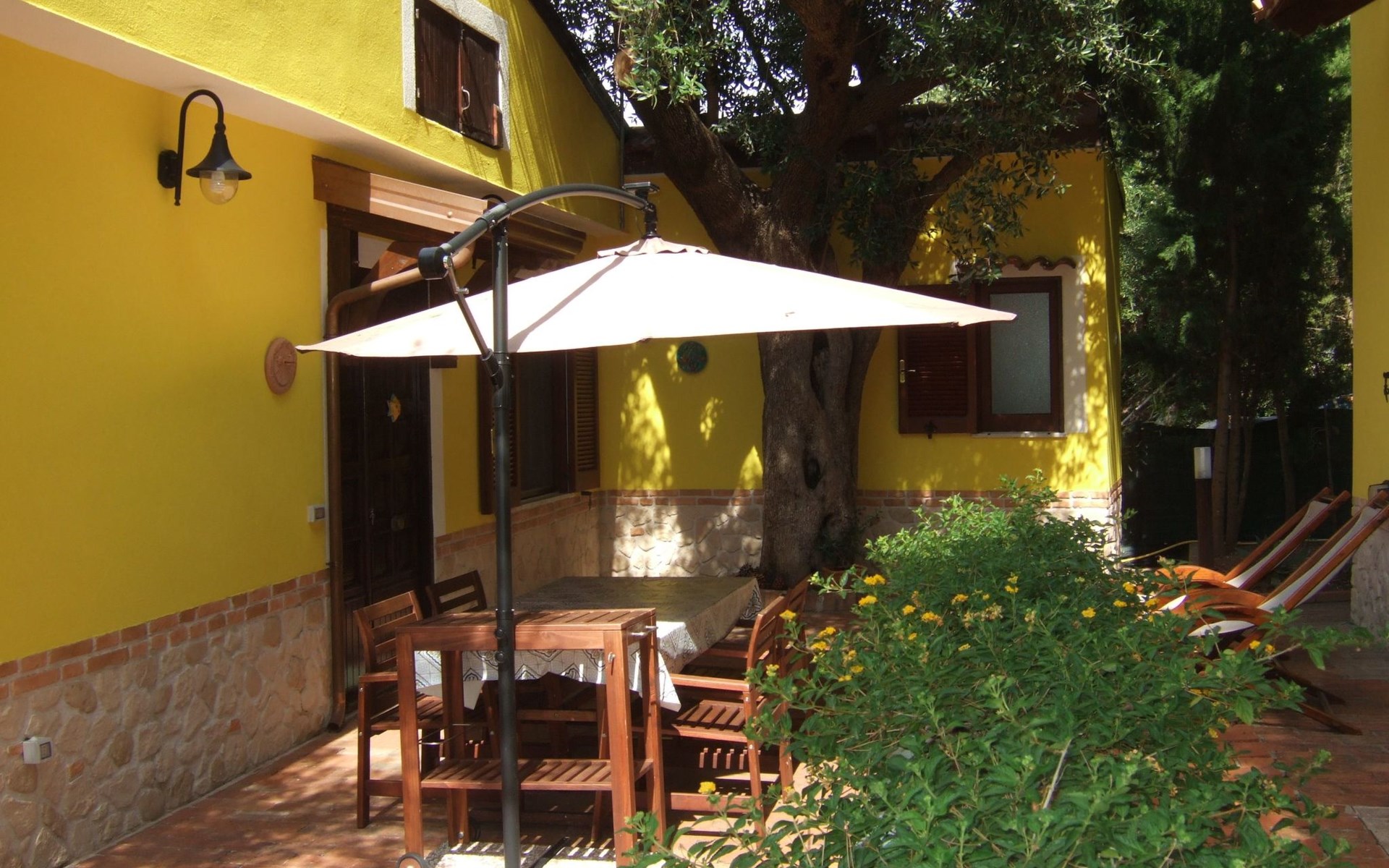 Die Wohnung blickt auf einen gepflegten Garten voller Grün und Blumen, wo es einen Tisch mit vier Stühlen und einen großen Sonnenschirm gibt.