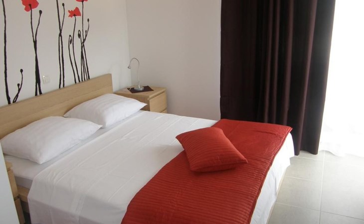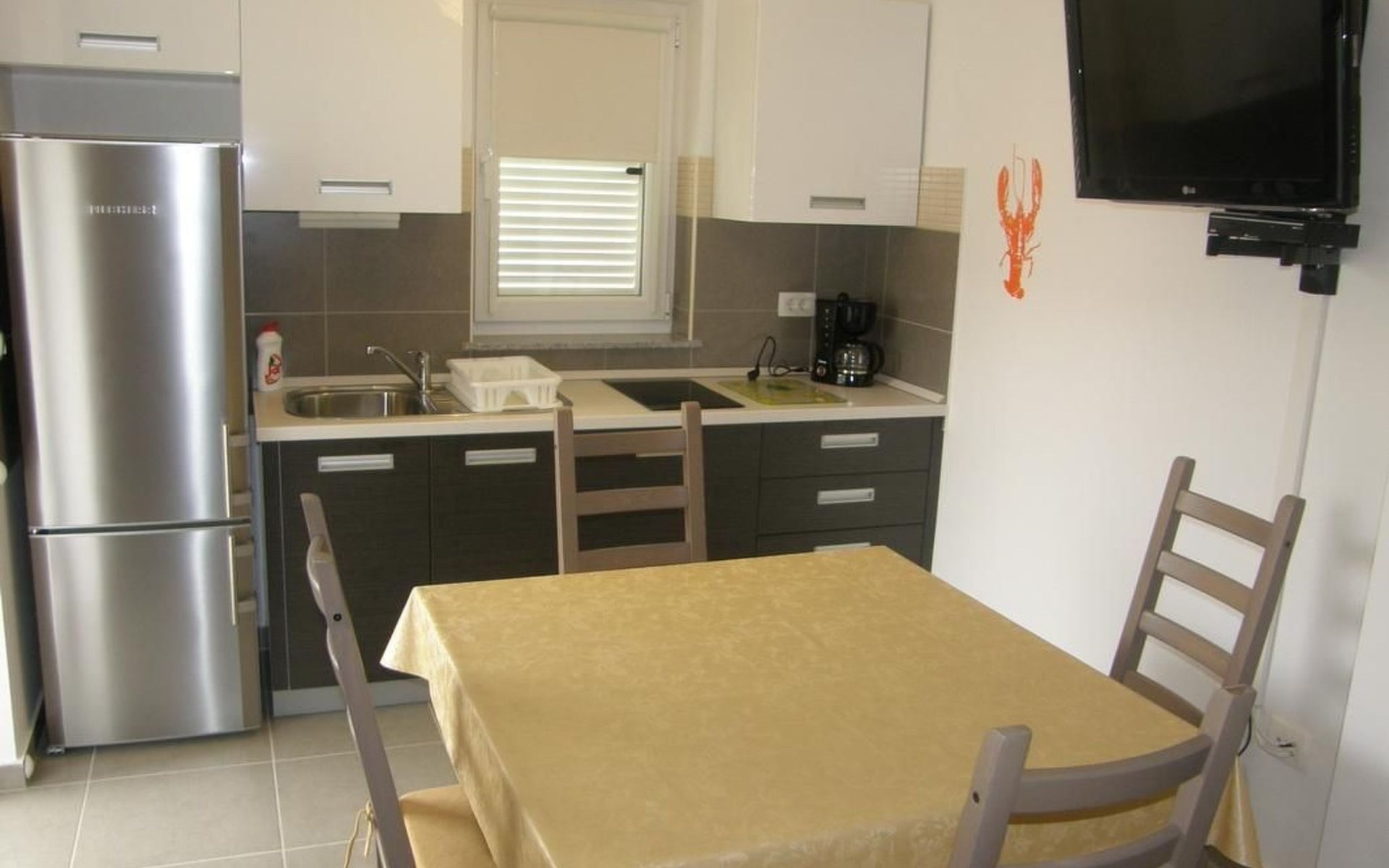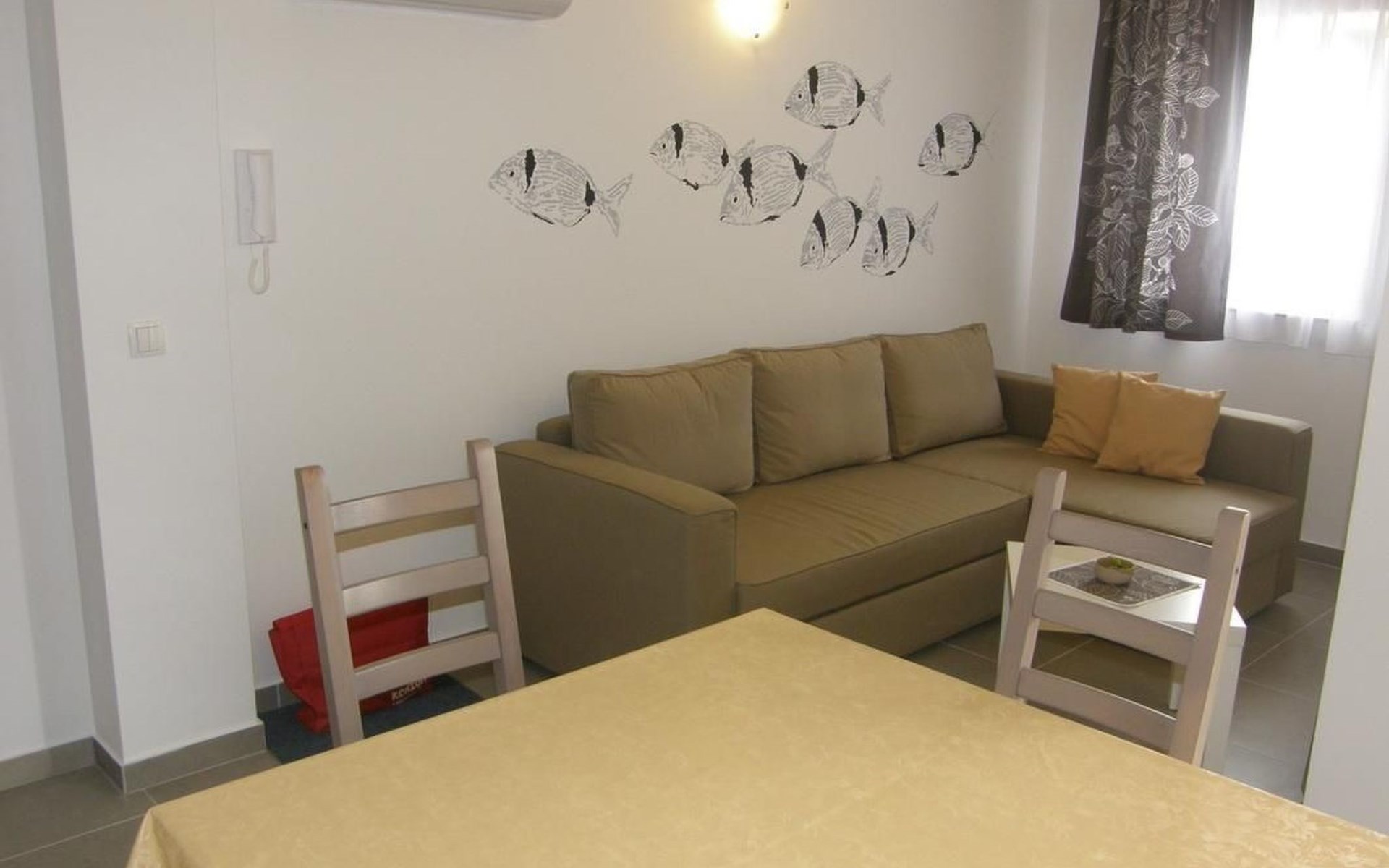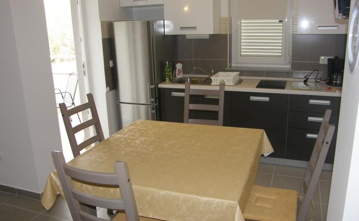 Die Ferienwohnung bietet ein gefliestes Doppelzimmer mit einem komfortablen Doppelbett, ideal für erholsame Nächte. Der Wohnbereich, der gleichzeitig als Esszimmer und Küche dient, bietet nicht nur eine Einheitlichkeit des Raums, sondern auch eine zusätzliche Schlafmöglichkeit auf einer Schlafcouch. Ausgestattet mit einem Esstisch und genügend Sitzgelegenheiten für alle Gäste, verspricht dieser Bereich gemütliche Stunden. Der Balkon, direkt zugänglich vom Wohnbereich, ist mit Tischen und Stühlen ausgestattet – perfekt, um die angenehme Außenatmosphäre zu genießen.