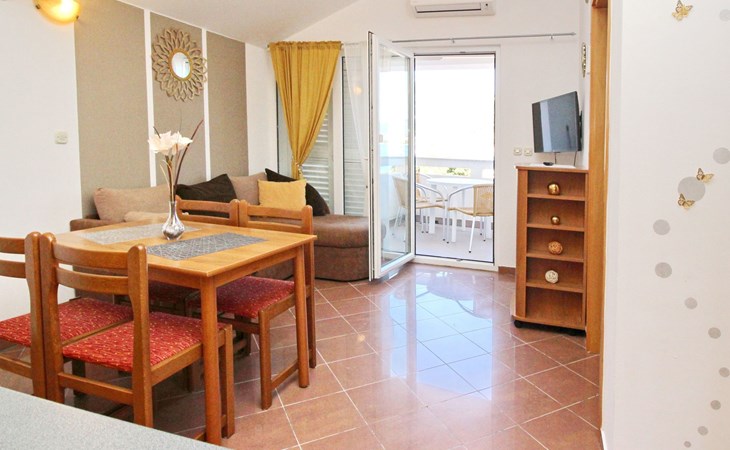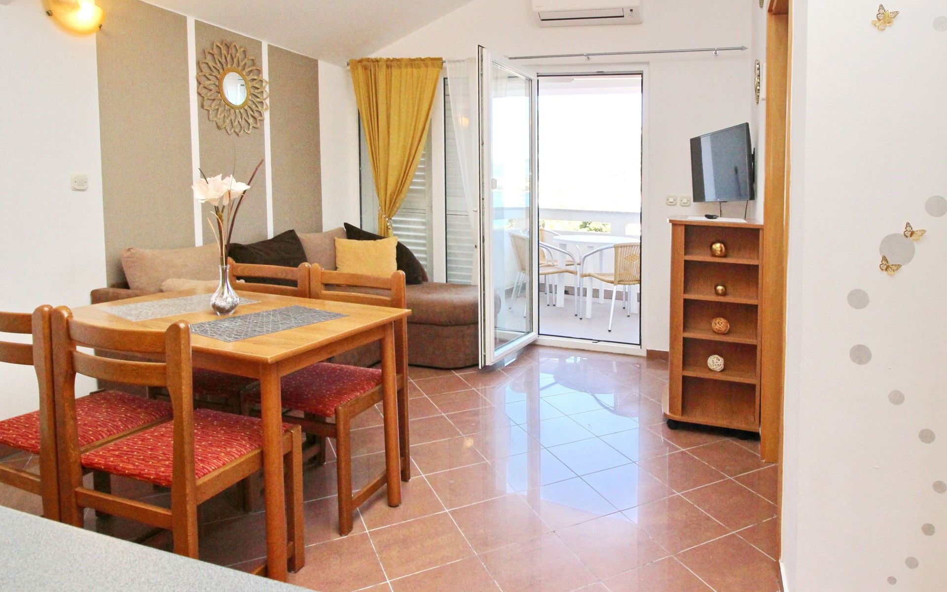 Wohnzimmer : Wohnzimmer, Esszimmer und Küche sind ein Raum, Tabelle für Lebensmittel und Stühle für alle Personen, mit Balkon, Fliesen.