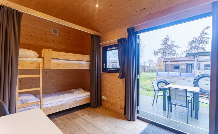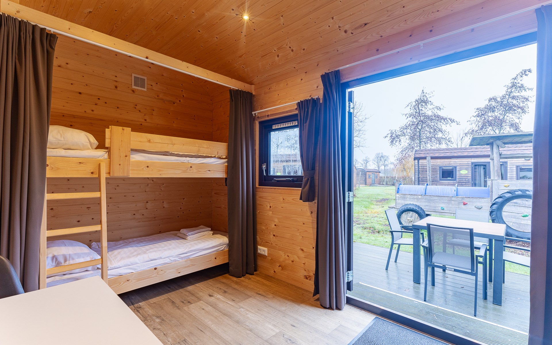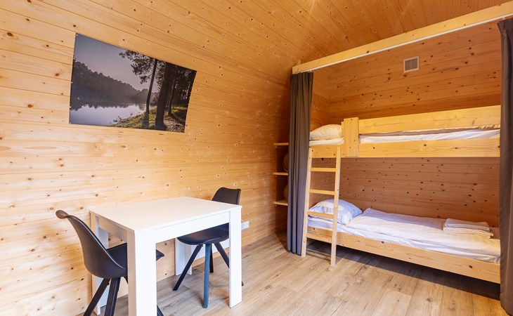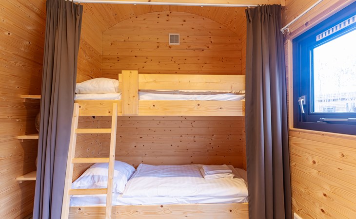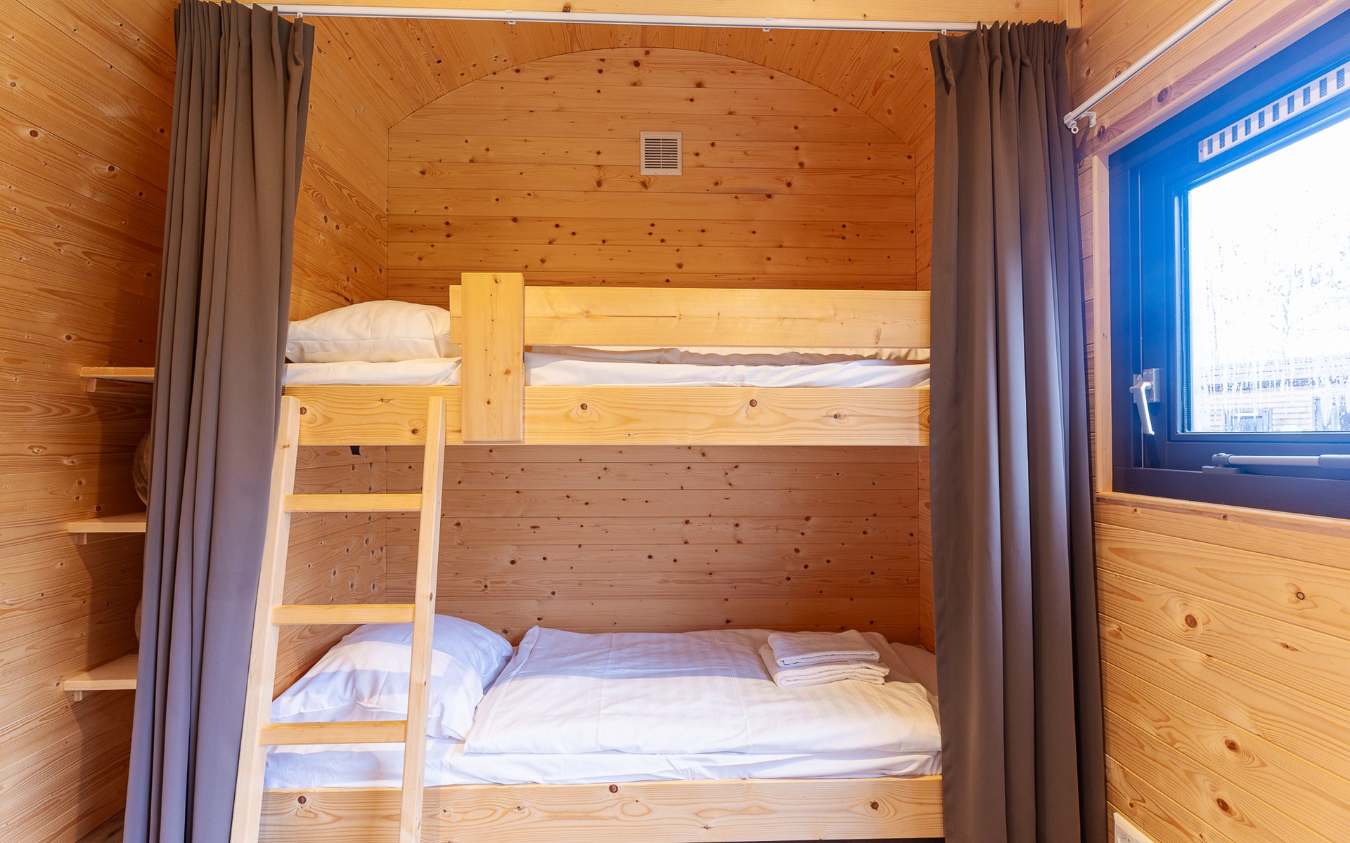 Auf der einen Seite der Lodge befindet sich ein komfortables Doppelbett, auf der anderen Seite ein Etagenbett: perfekt für Kinder oder Freunde.