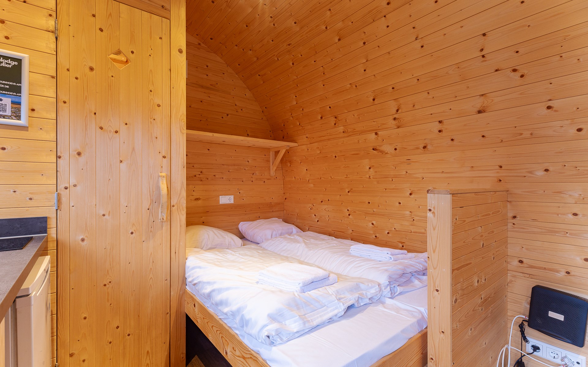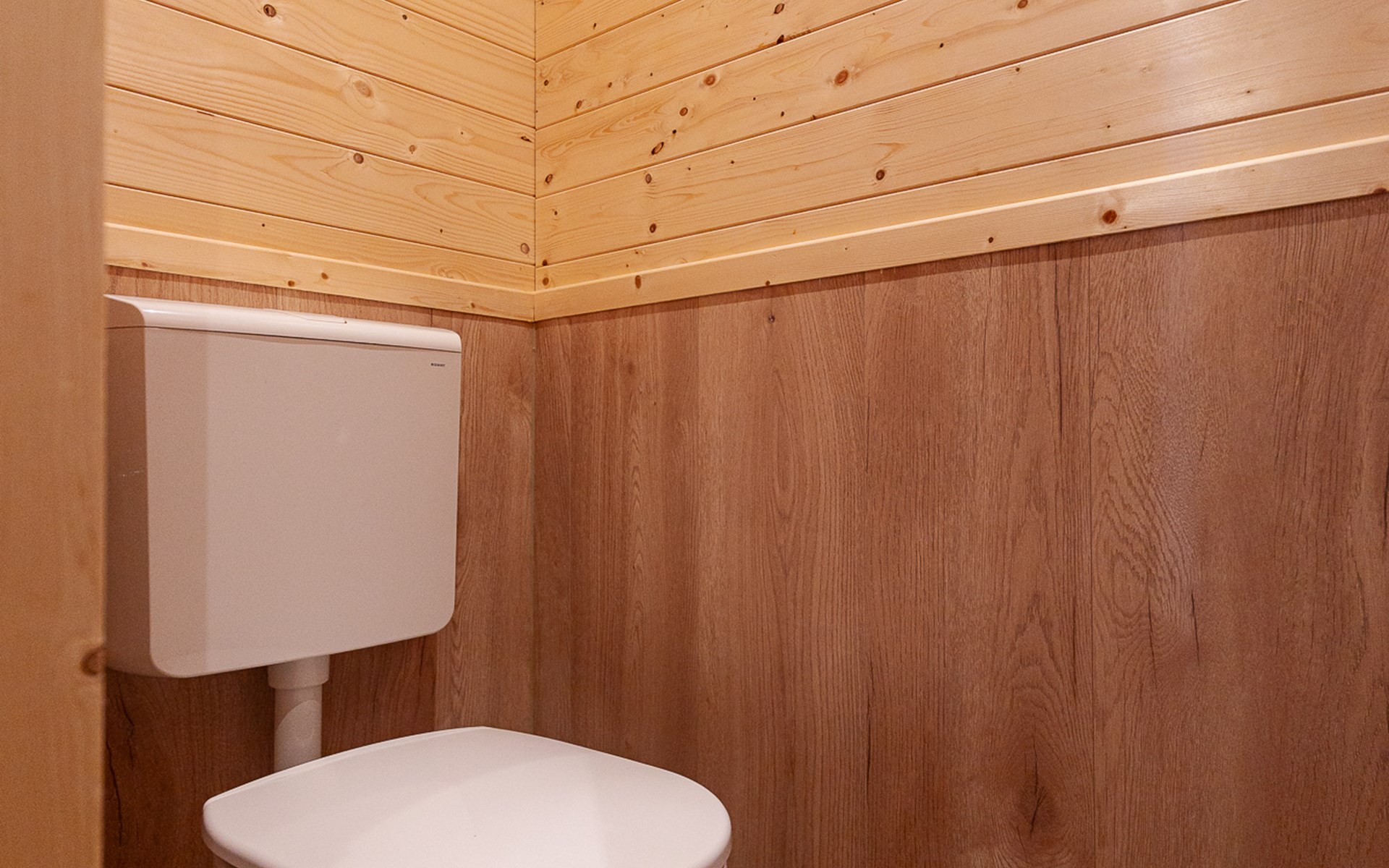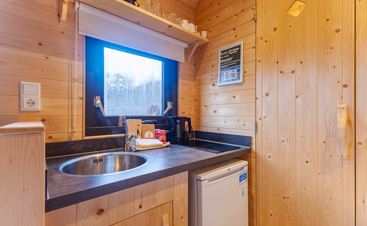 Die praktische Kitchenette ist mit Kochfeld, Kühlschrank, Wasserkocher, Kaltwasseranschluss und allen notwendigen Küchenutensilien ausgestattet, sodass Sie problemlos eine Tasse Kaffee oder eine schnelle Mahlzeit zubereiten können. Die eigene Toilette befindet sich im hinteren Teil der Lodge, und für zusätzliche Wärme sorgt eine elektrische Heizung. Duschen? In wenigen Minuten erreichen Sie das Sanitärgebäude, das Sie kostenlos nutzen können.