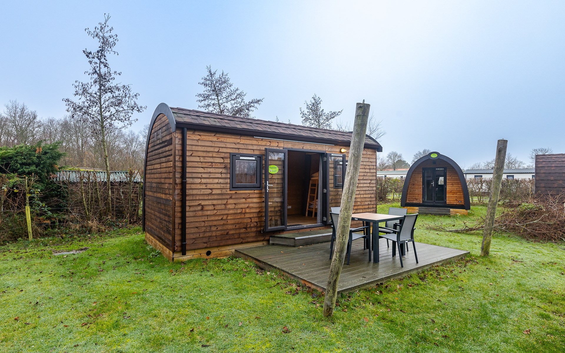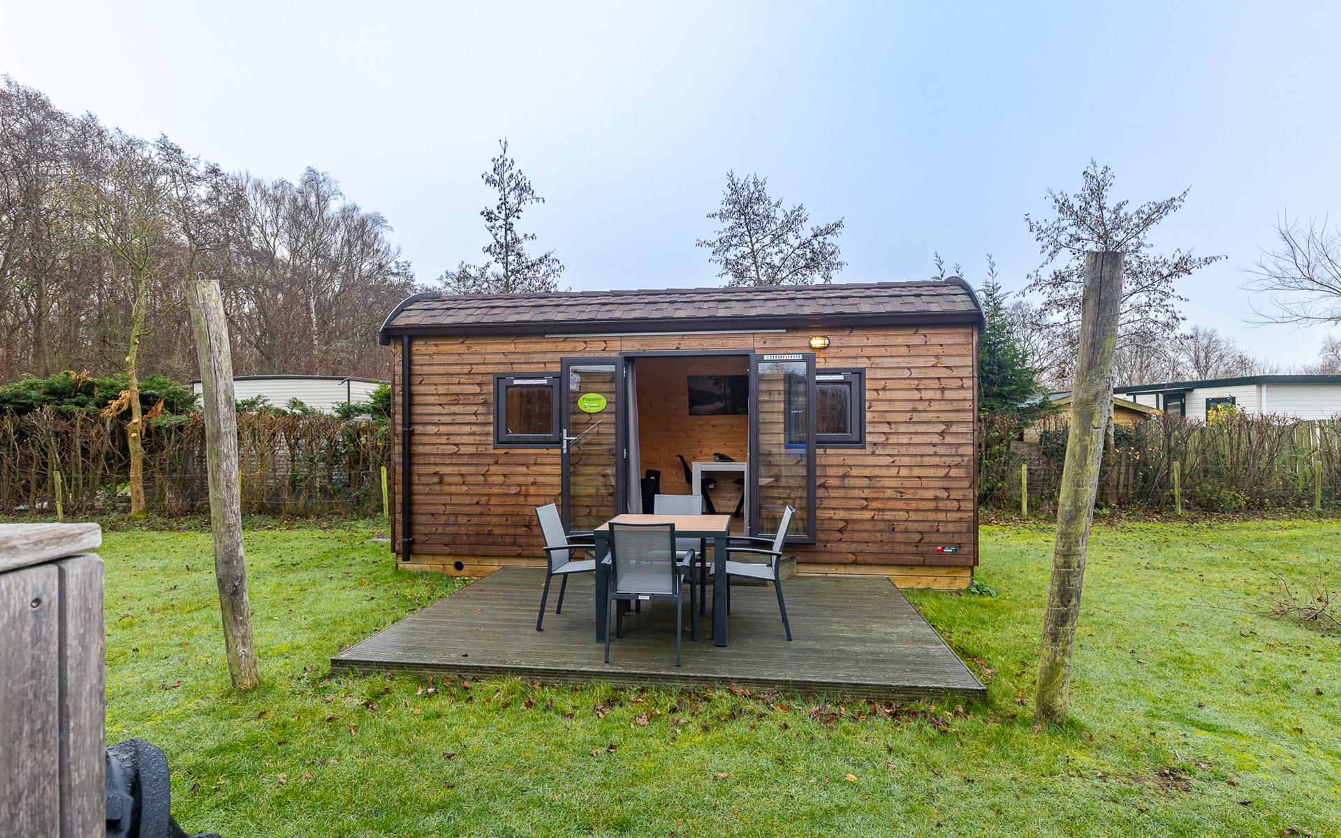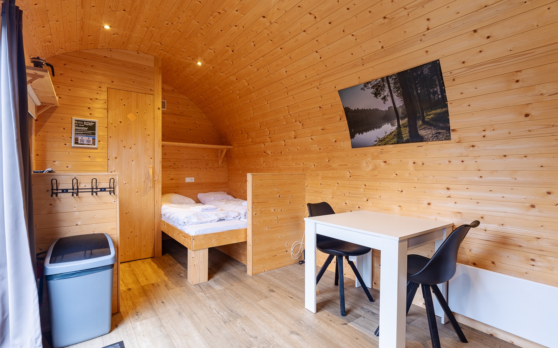 Die praktische Kitchenette ist mit Kochfeld, Kühlschrank, Wasserkocher, Kaltwasseranschluss und allen notwendigen Küchenutensilien ausgestattet, sodass Sie problemlos eine Tasse Kaffee oder eine schnelle Mahlzeit zubereiten können. Die eigene Toilette befindet sich im hinteren Teil der Lodge, und für zusätzliche Wärme sorgt eine elektrische Heizung. Duschen? In wenigen Minuten erreichen Sie das Sanitärgebäude, das Sie kostenlos nutzen können.