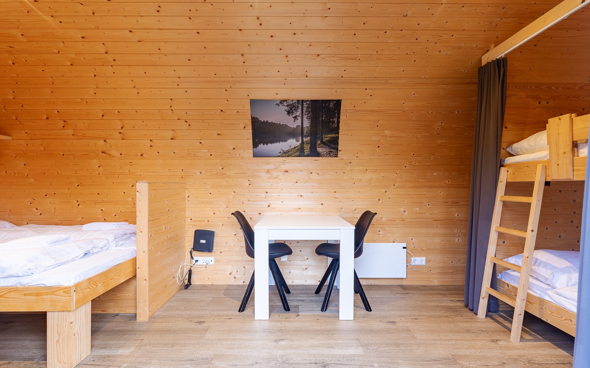 Die Lodge bietet überraschend viel Komfort für vier Personen. Im Wohnbereich steht ein Tisch mit zwei Stühlen: ideal für ein gemeinsames Frühstück, Spiele oder die Planung des Tages.