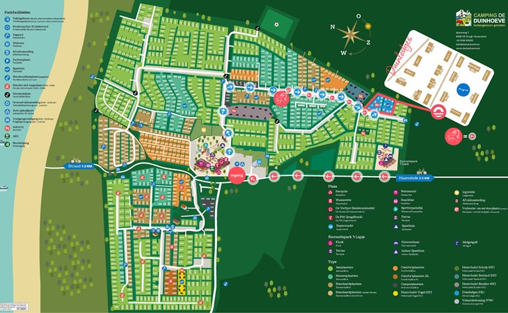 Auf Camping Duinhoeve finden Sie alles, was Sie für einen gelungenen Urlaub brauchen. Der Park bietet Spaß und Entspannung für alle: von einem Wasserspielplatz und Animation bis hin zu einem Mini-Kino sowie verschiedenen Spielplätzen drinnen und draußen. Starten Sie den Tag mit frischen Croissants aus dem Duinshop, leihen Sie ein Fahrrad und erkunden Sie die schöne Umgebung über die zahlreichen Wander- und Radwege. Für zusätzlichen Komfort gibt es einen Supermarkt, ein Restaurant, eine Snackbar, eine Wäscherei und einen Souvenirshop. Auch moderne Einrichtungen wie kostenloses WLAN und EcoTap-Ladestationen sind vorhanden.