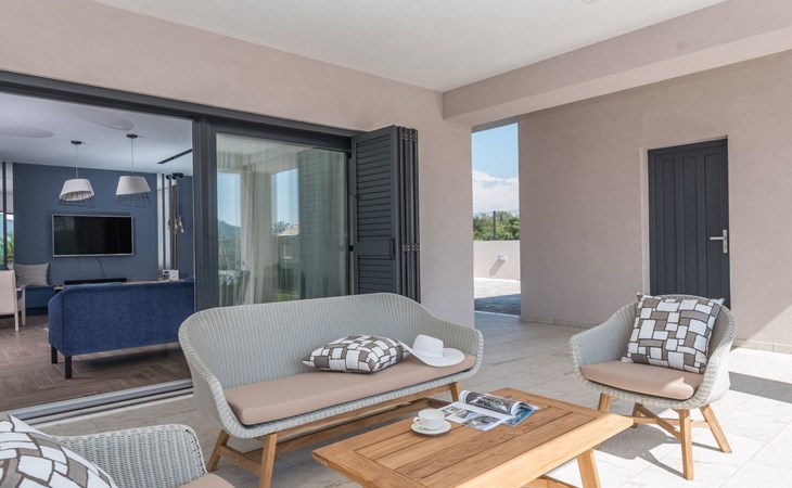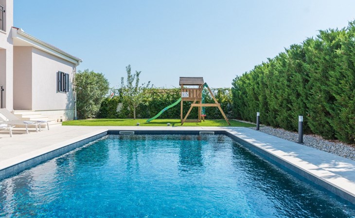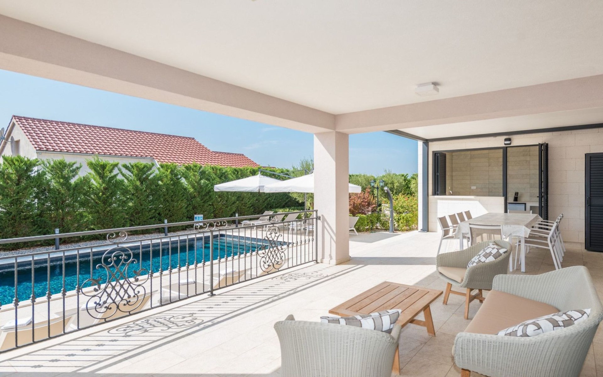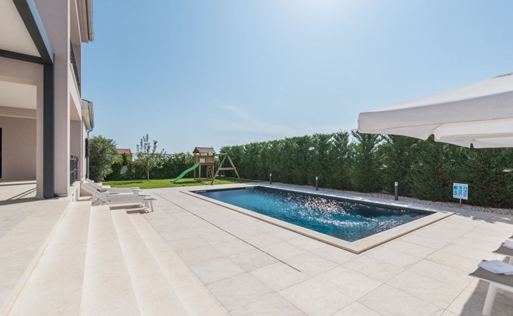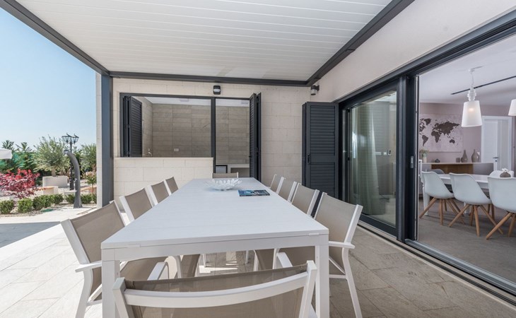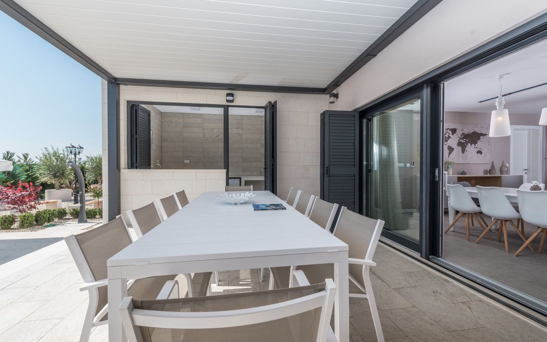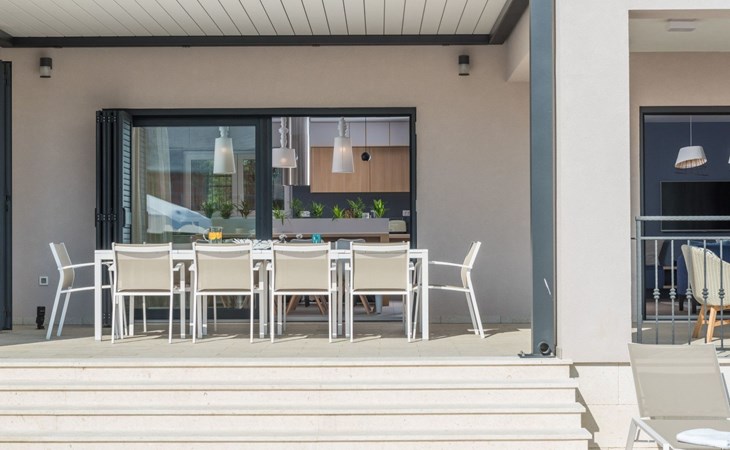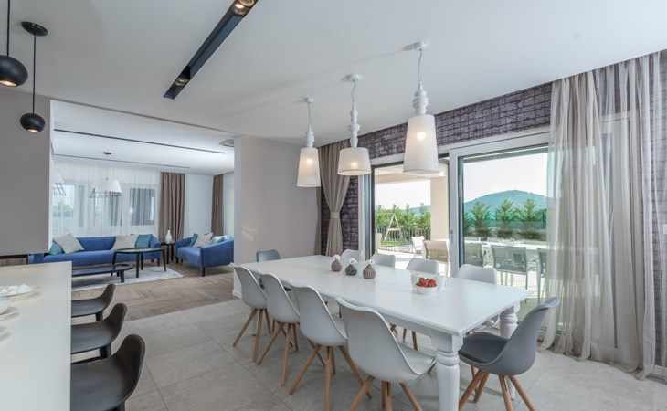 Diese geräumige, modern gestaltete Villa bietet Platz für bis zu 10 Gäste in 5 Doppelzimmern mit eigenem Bad. Eine voll ausgestattete Küche steht für Sie bereit. Das Wohnzimmer ist mit einem großen Essbereich verbunden, in dem alle Gäste Platz finden.