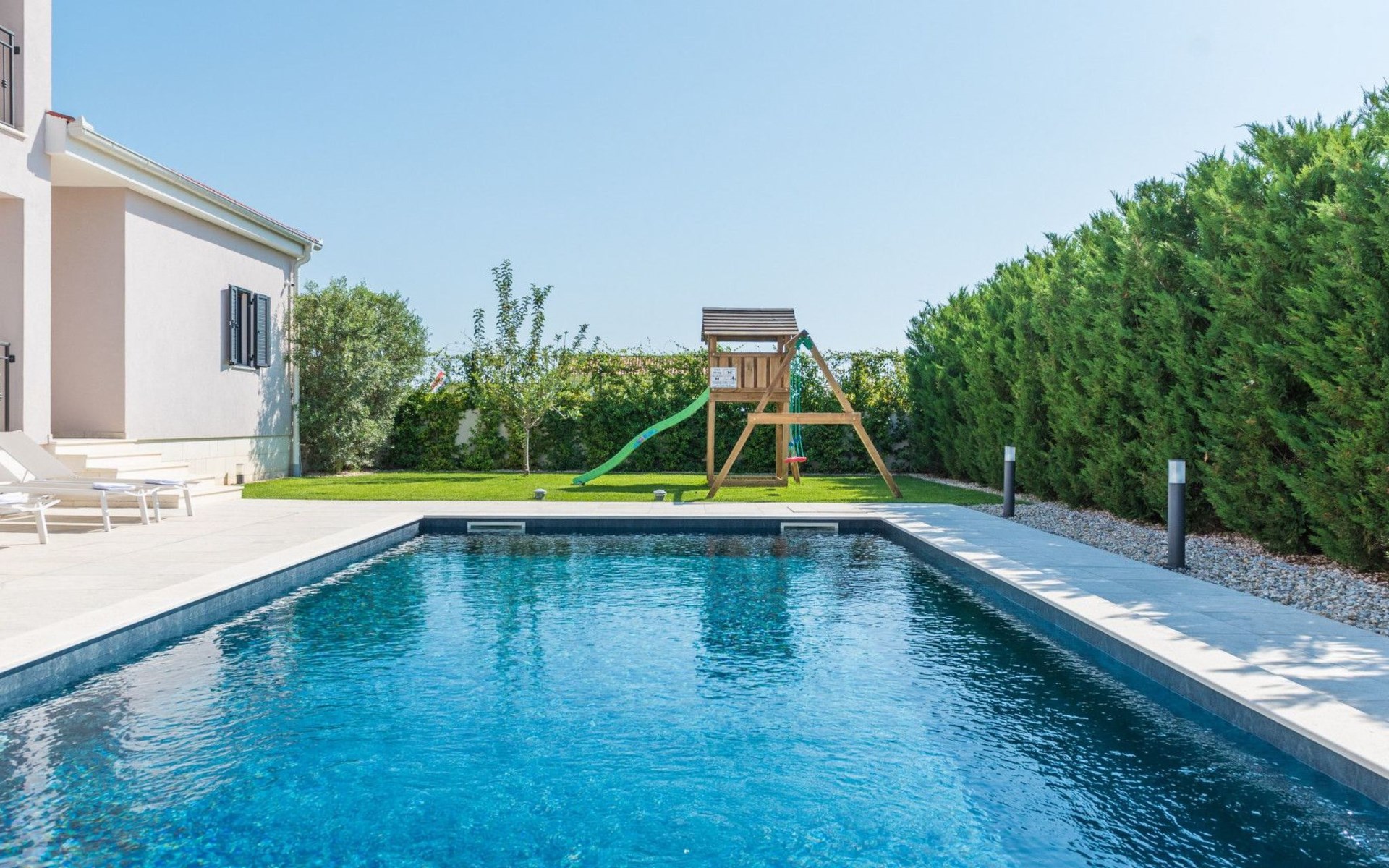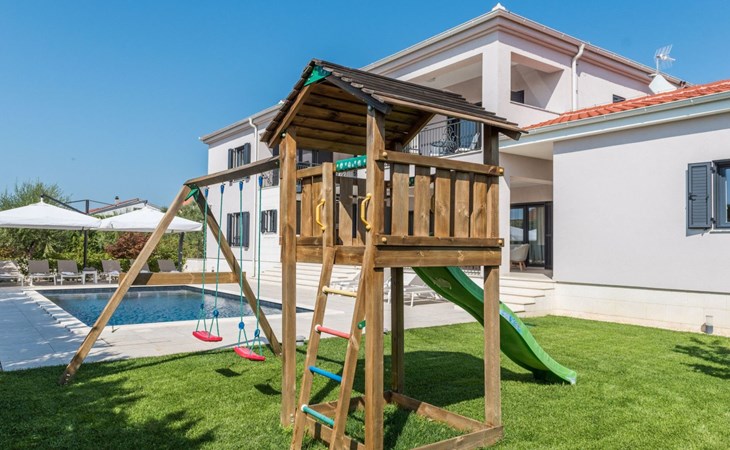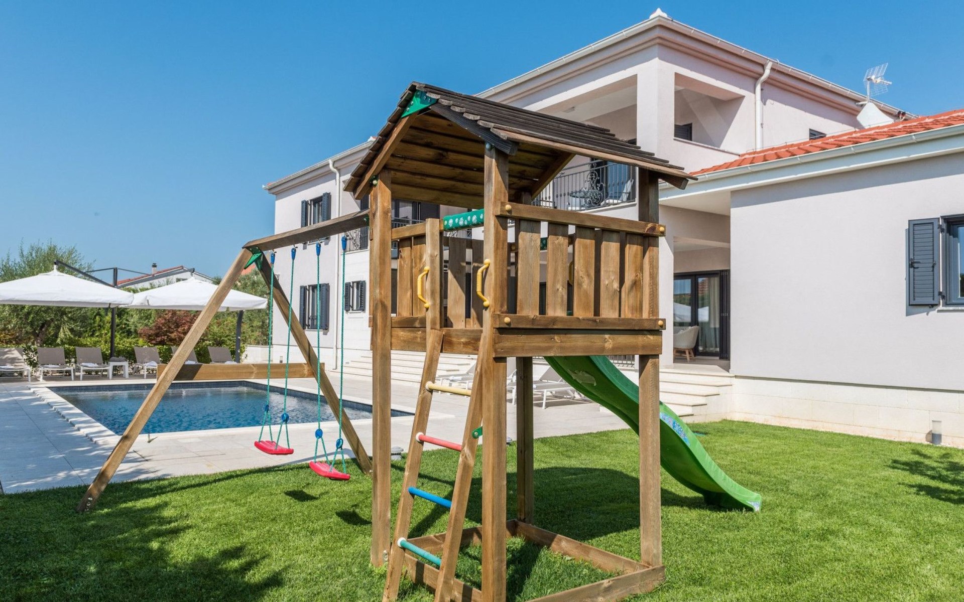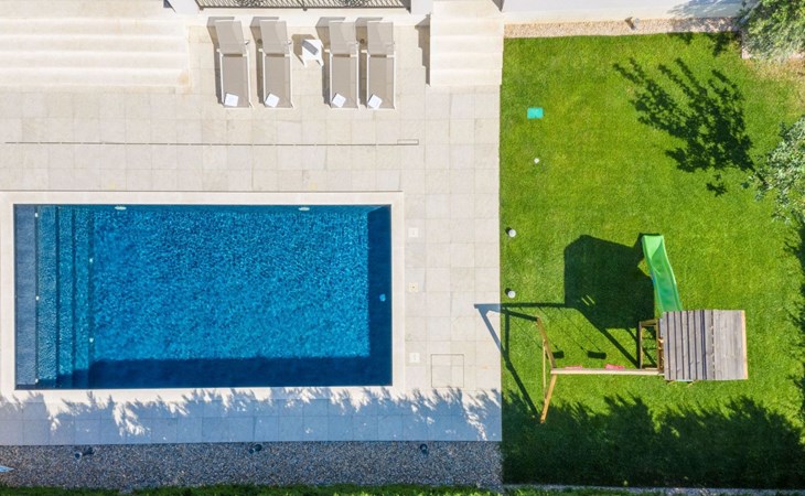 Im Hof befindet sich ein großer privater Swimmingpool, der von Sonnenliegen umgeben ist. Der Pool kann beheizt werden. Die Villa verfügt über einen Basketballplatz für verschiedene Aktivitäten, sowie einen Kinderspielplatz.