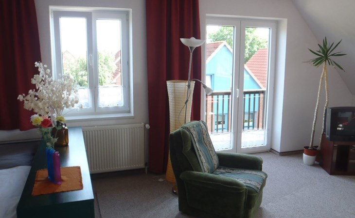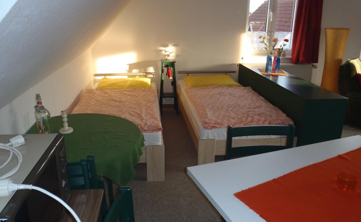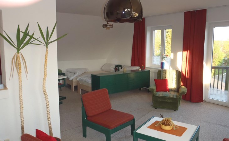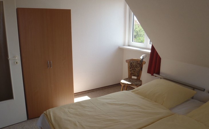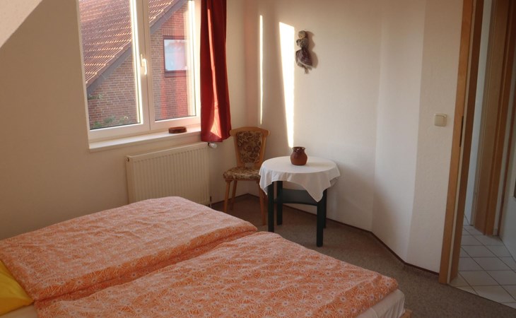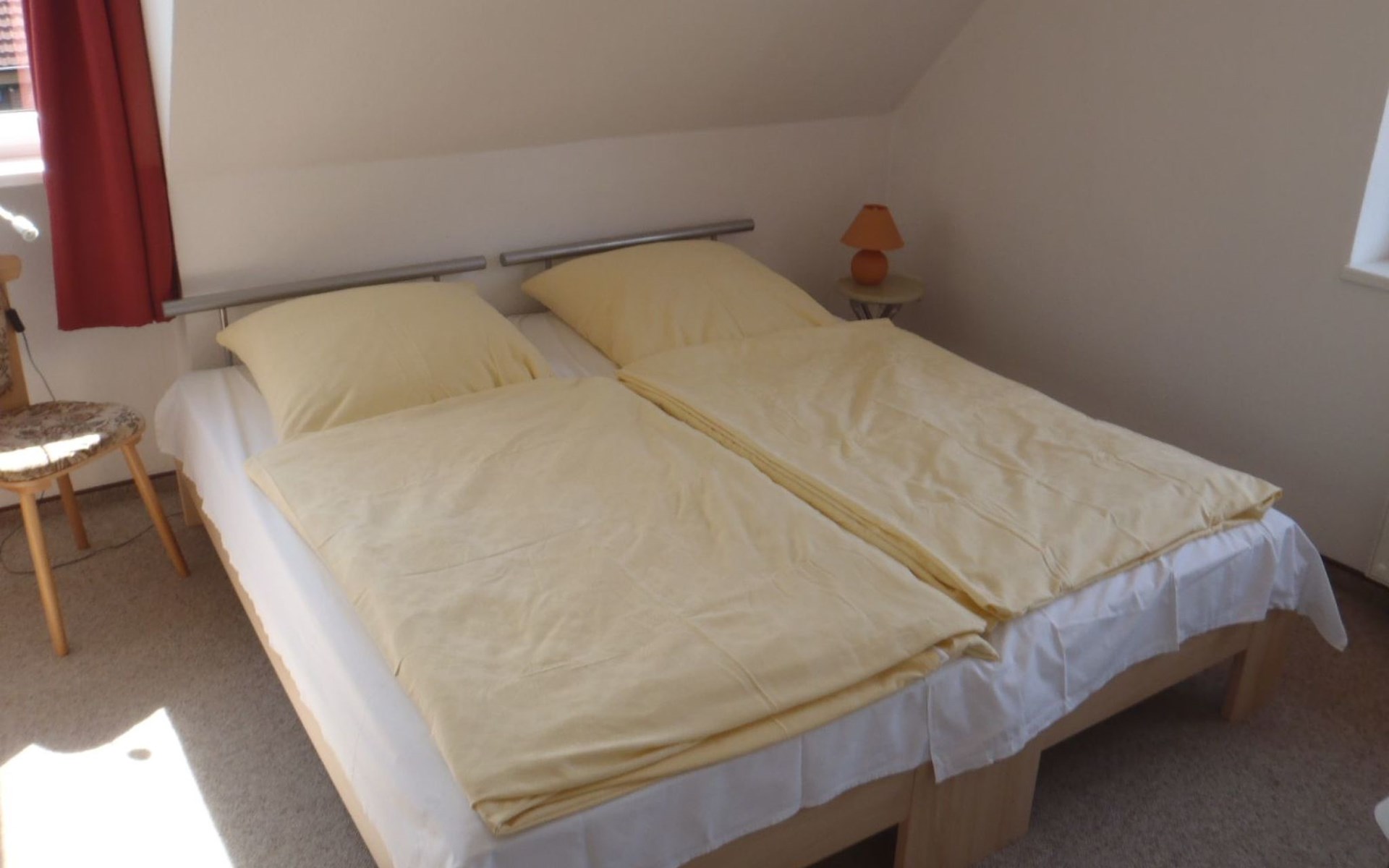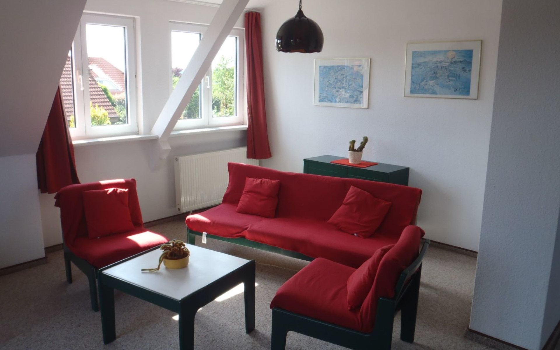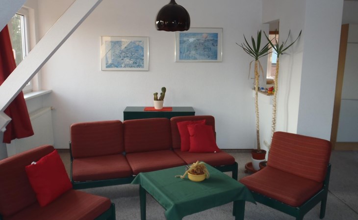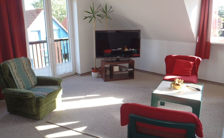Im Erdgeschoss des im Jahre 1993 gebauten Hauses liegt die zeitweise genutzte Wohnung des Vermieters. Nach dem Hauseingang gelangen Sie direkt über einen Treppenaufgang zur Wohnungstür Ihrer Ferienwohnung. Im Inneren wirkt die Wohnung mit einer Wohnfläche von 64 m² großzügig und wohnlich, da durch die Gaubenfenster sonniges Tageslicht ins Innere gelangt und die Deckenhöhe durch den Einbau eines Mauerdrempels angenehm hoch ausfällt. Im Inneren wird Ihnen ein Schlafzimmer, ein Badezimmer und ein offener Wohn-, Koch- und Schlafbereich geboten. Das Schlafzimmer ist auf 12 m² Wohnfläche mit zwei nebeneinander stehenden Einzelbetten einer Maße von jeweils 200 cm x 90 cm und einem Kleiderschrank eingerichtet. Das Badezimmer verfügt über eine Badewanne mit Duschfunktion, ein Handwaschbecken mit Spiegel, ein WC und ein Badezimmerfenster auf 9 m². Der große Wohnraum unterteilt sich auf 43 m² in eine voll ausgestattete Küchenzeile, eine separater Sitz- und Schlafecke mit zwei verschiebbaren Einzelbetten (jeweils 200 cm x 90 cm), sowie den gemütlichen Wohnbereich mit einem Dreisitzer und zwei gepolsterten Stühlen. In diesem Raum besteht ein schöner Rundumblick um ziehende Vögel aus den beiden Binnenseenaturschutzgebieten zu verfolgen. Auch zum Nachgoogeln der verschiedenen Vogelarten ist kostenloses W-LAN vorhanden. Aus dem Wohnzimmer gelangen Sie durch die Balkontür auf den ca 2 m² großen Südbalkon.