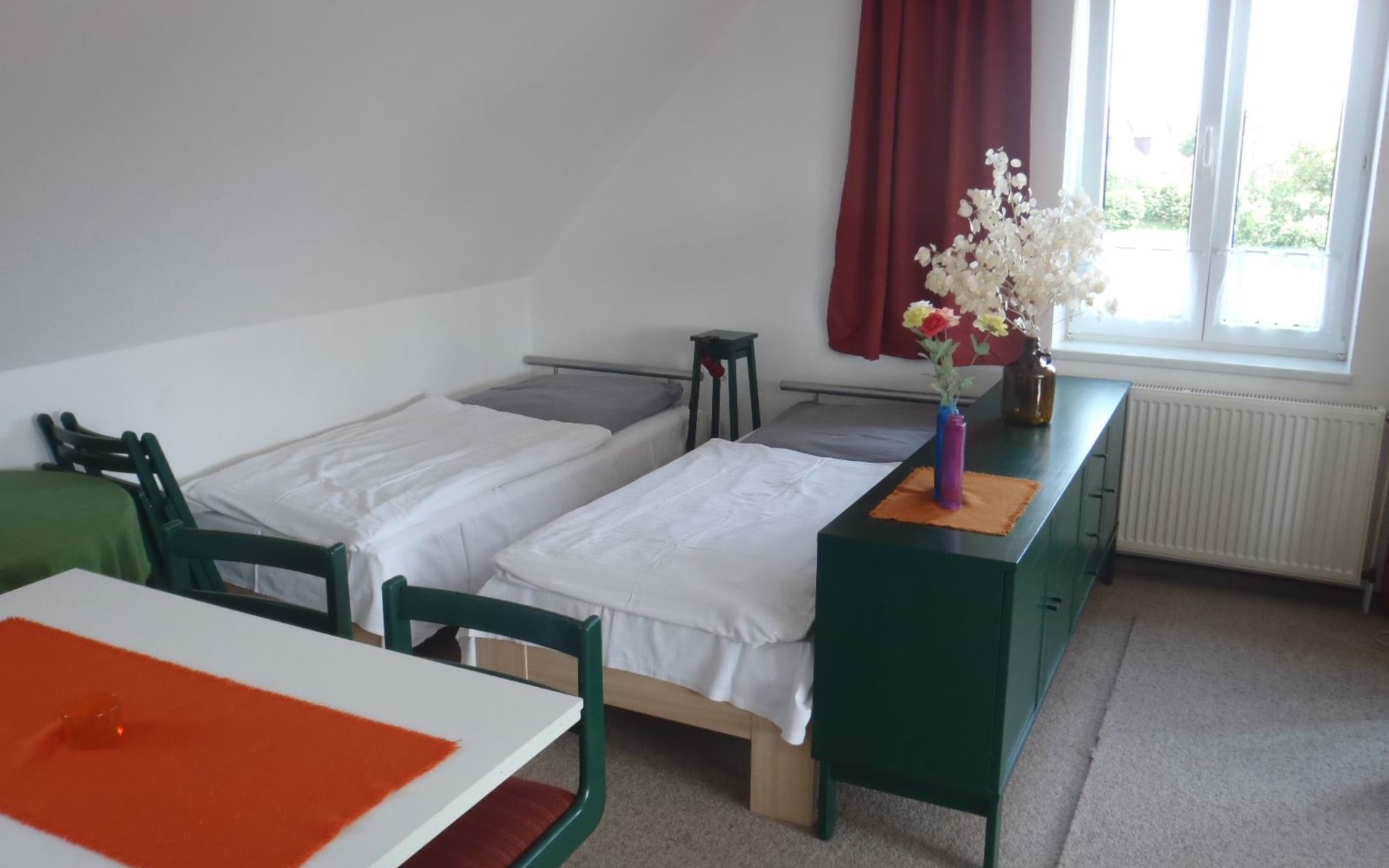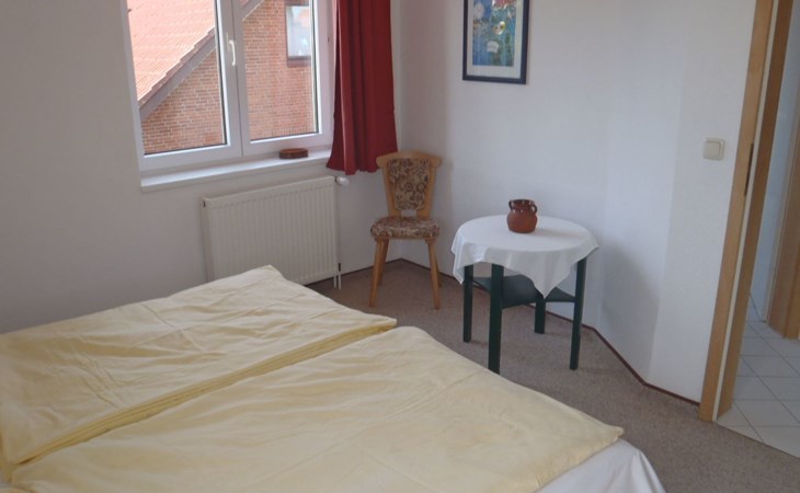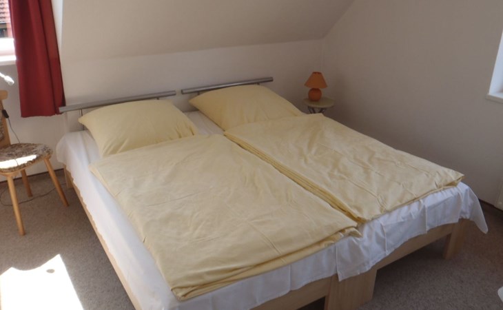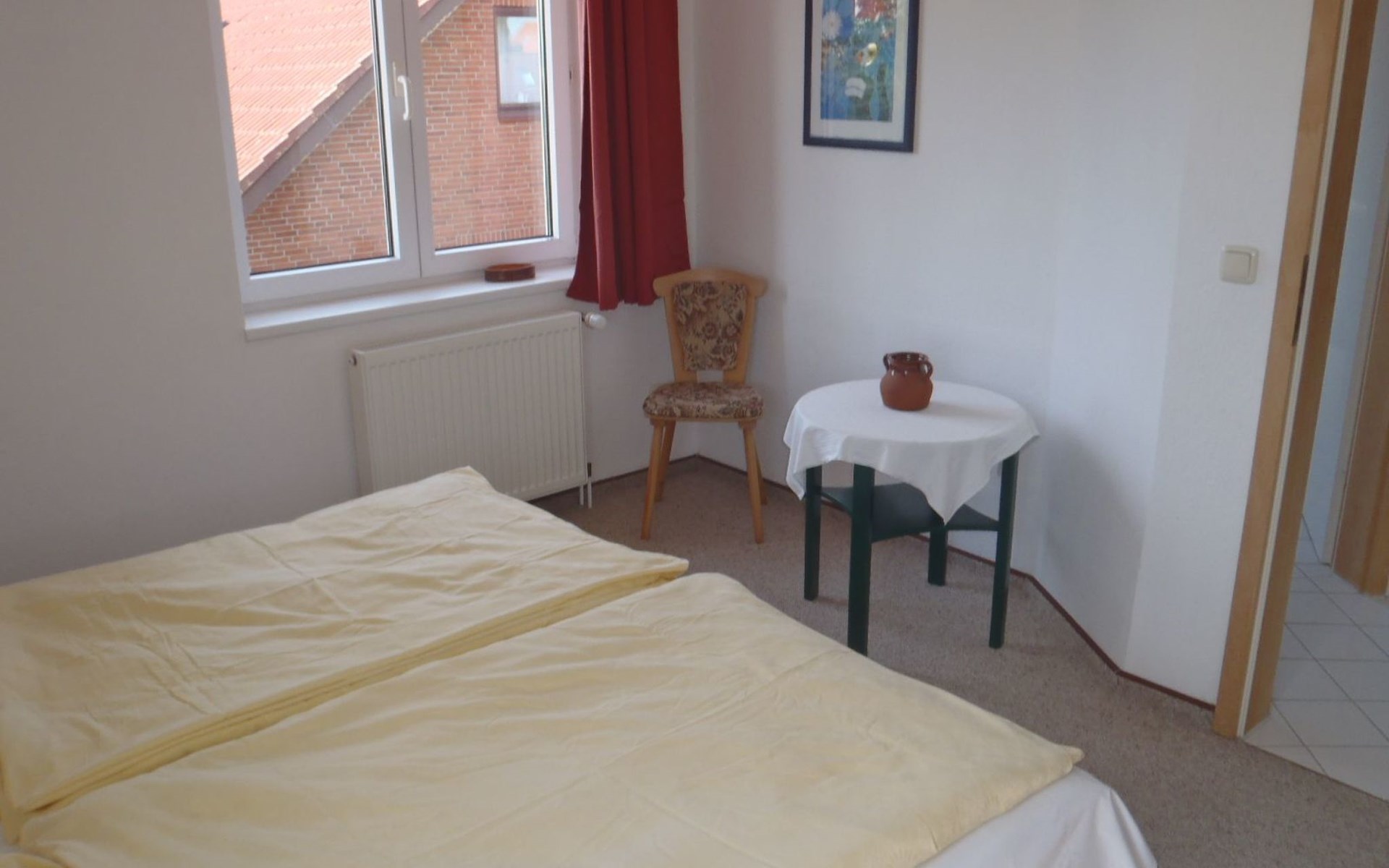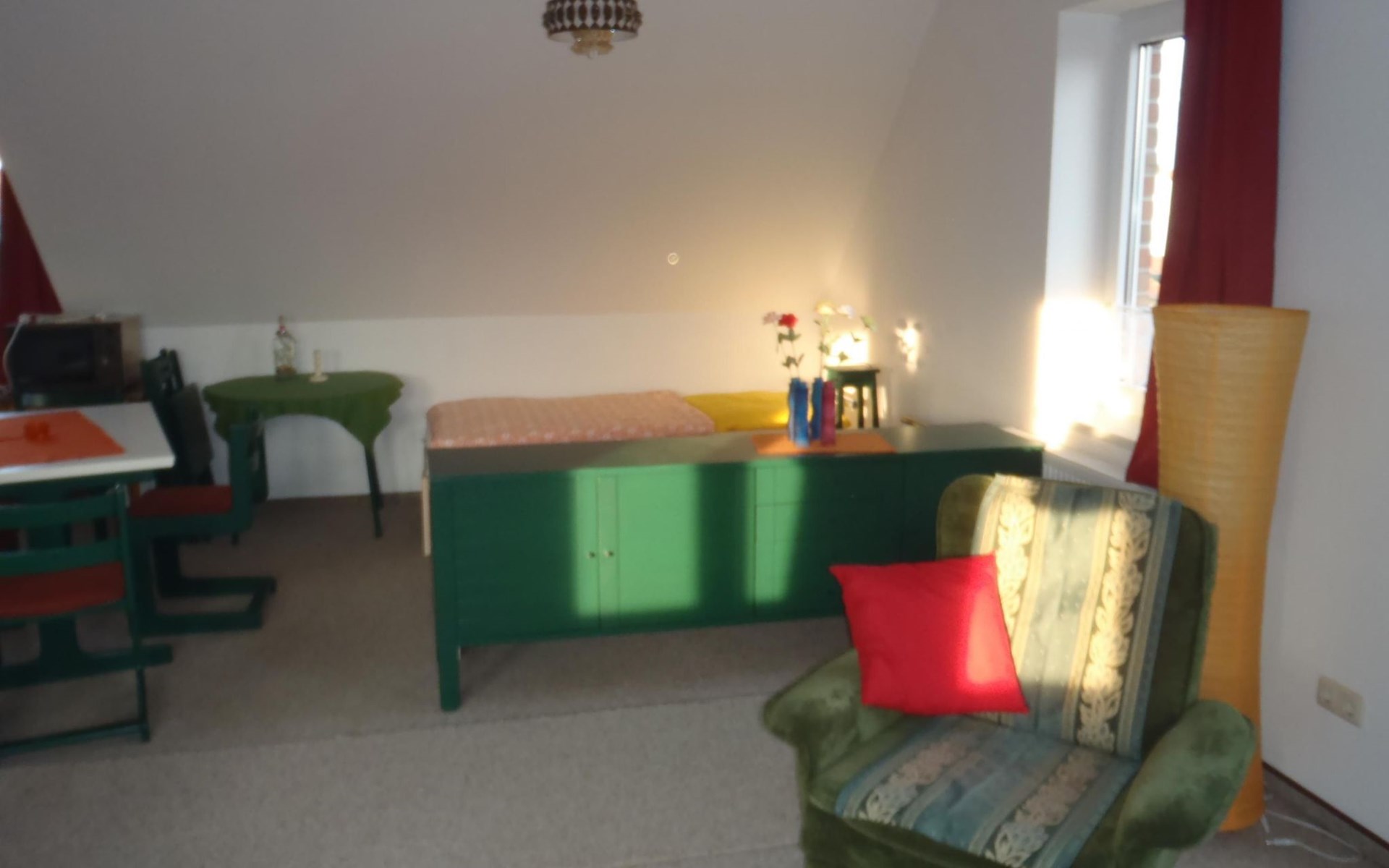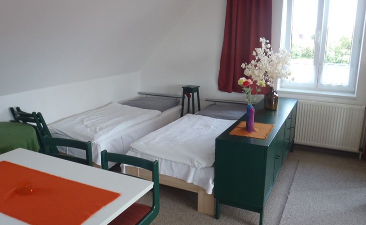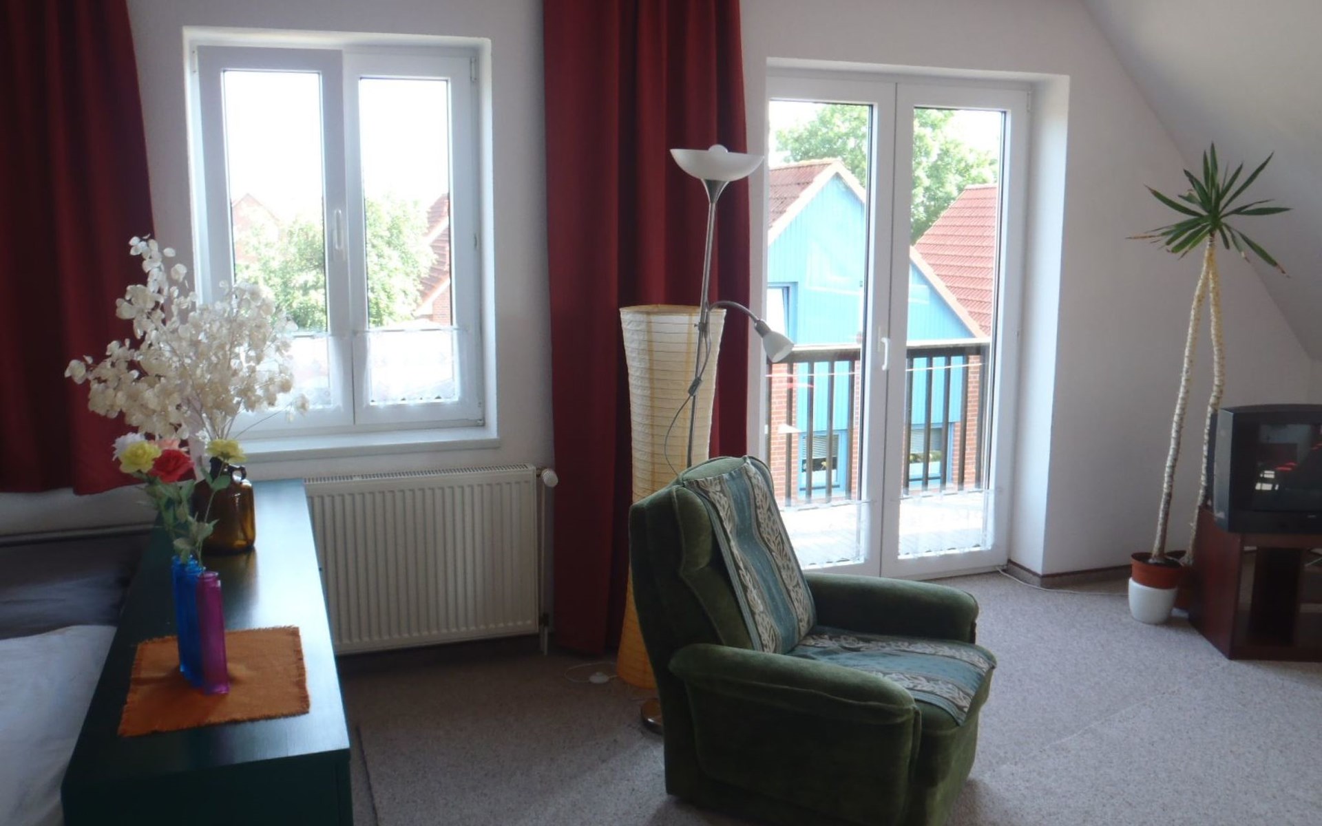 Im Erdgeschoss des im Jahre 1993 gebauten Hauses liegt die zeitweise genutzte Wohnung des Vermieters. Nach dem Hauseingang gelangen Sie direkt über einen Treppenaufgang zur Wohnungstür Ihrer Ferienwohnung. Im Inneren wirkt die Wohnung mit einer Wohnfläche von 64 m² großzügig und wohnlich, da durch die Gaubenfenster sonniges Tageslicht ins Innere gelangt und die Deckenhöhe durch den Einbau eines Mauerdrempels angenehm hoch ausfällt. Im Inneren wird Ihnen ein Schlafzimmer, ein Badezimmer und ein offener Wohn-, Koch- und Schlafbereich geboten. Das Schlafzimmer ist auf 12 m² Wohnfläche mit zwei nebeneinander stehenden Einzelbetten einer Maße von jeweils 200 cm x 90 cm und einem Kleiderschrank eingerichtet. Das Badezimmer verfügt über eine Badewanne mit Duschfunktion, ein Handwaschbecken mit Spiegel, ein WC und ein Badezimmerfenster auf 9 m². Der große Wohnraum unterteilt sich auf 43 m² in eine voll ausgestattete Küchenzeile, eine separater Sitz- und Schlafecke mit zwei verschiebbaren Einzelbetten (jeweils 200 cm x 90 cm), sowie den gemütlichen Wohnbereich mit einem Dreisitzer und zwei gepolsterten Stühlen. In diesem Raum besteht ein schöner Rundumblick um ziehende Vögel aus den beiden Binnenseenaturschutzgebieten zu verfolgen. Auch zum Nachgoogeln der verschiedenen Vogelarten ist kostenloses W-LAN vorhanden. Aus dem Wohnzimmer gelangen Sie durch die Balkontür auf den ca 2 m² großen Südbalkon.