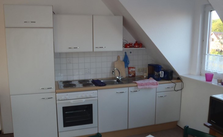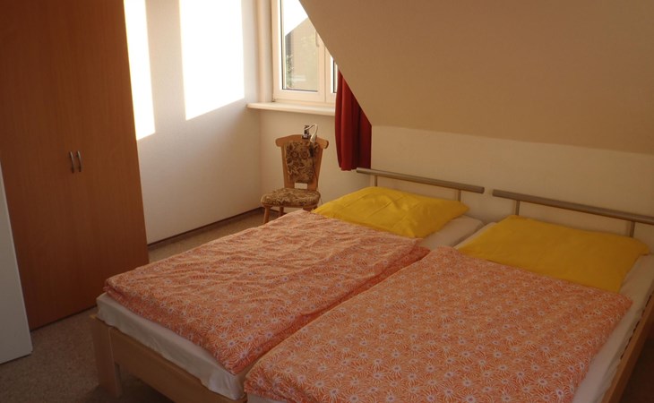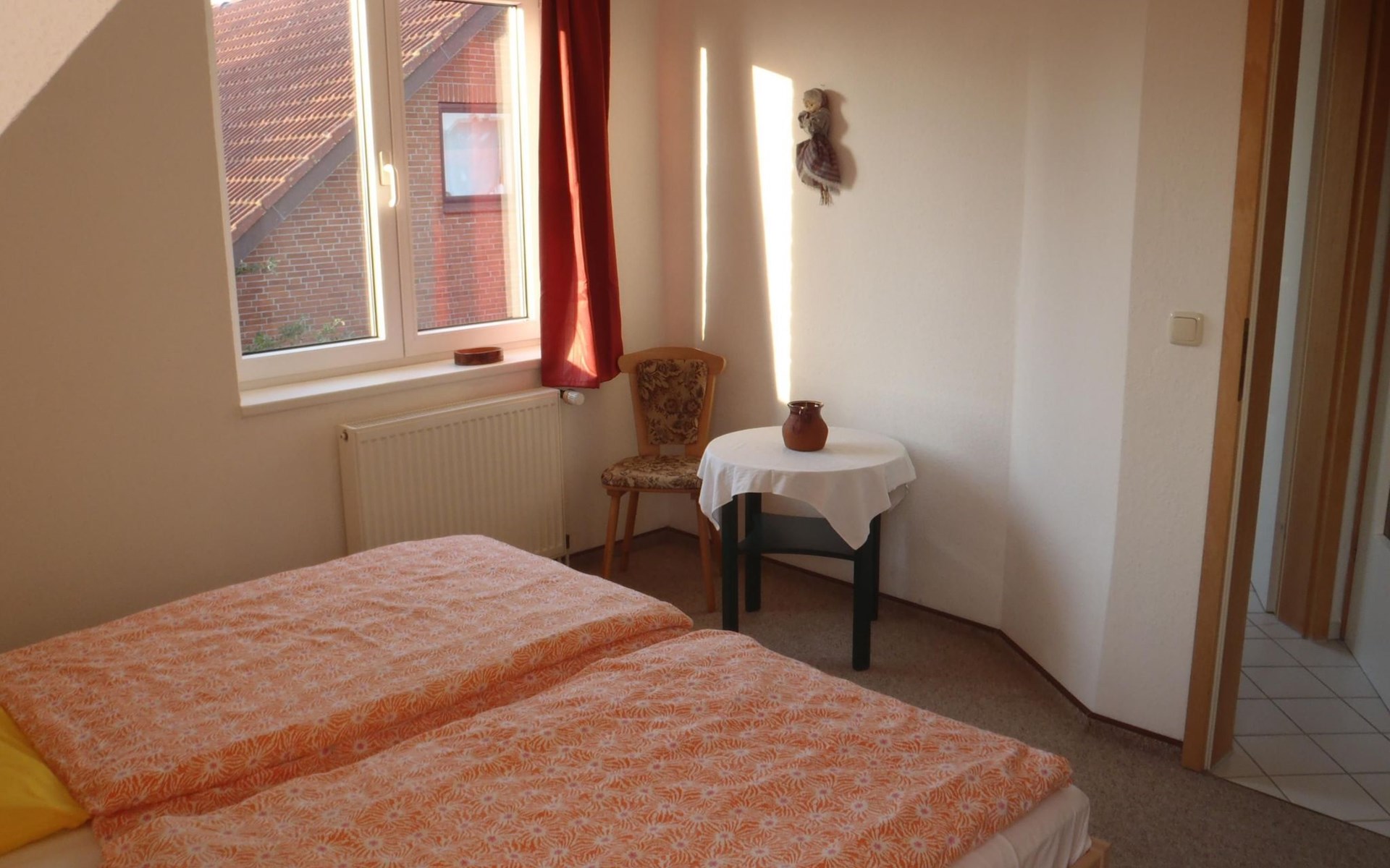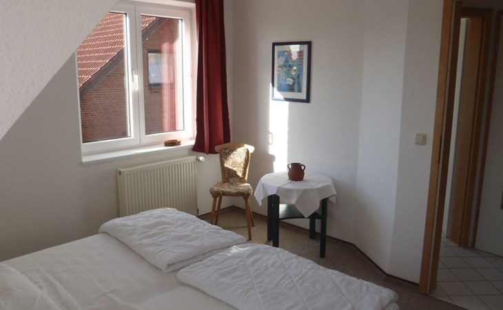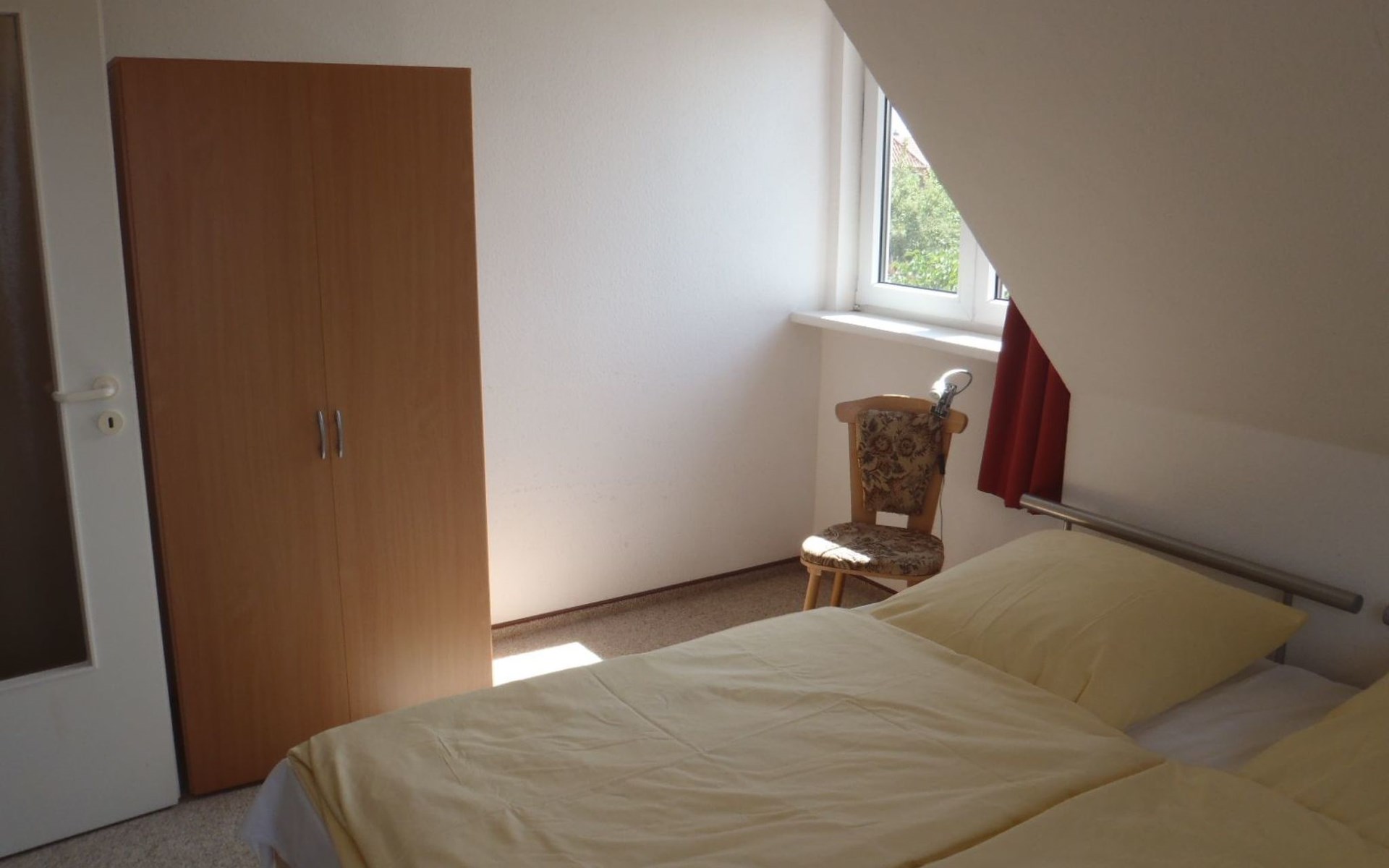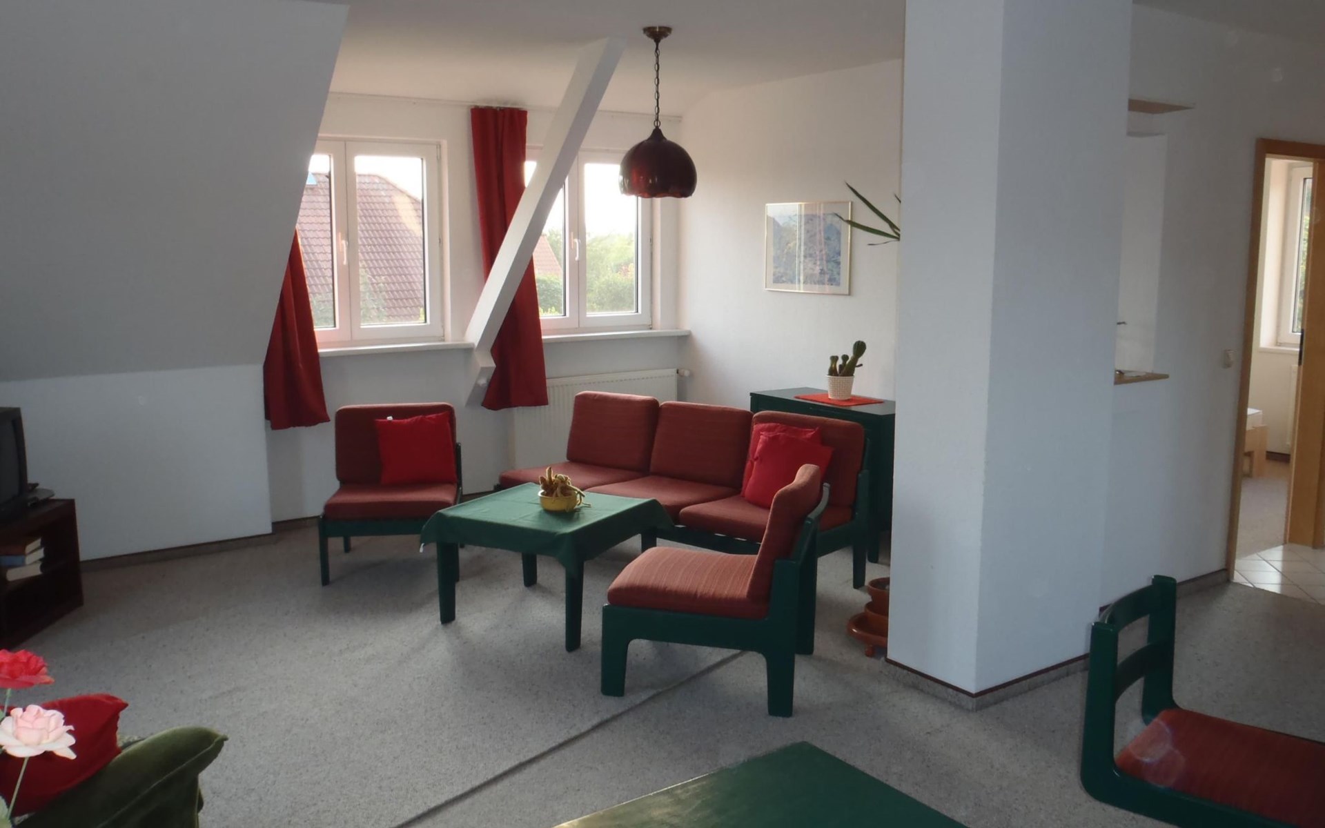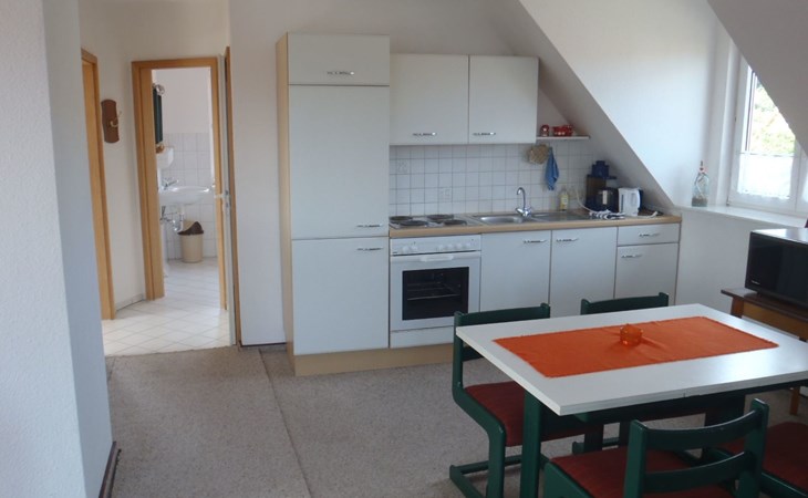Im Erdgeschoss des im Jahre 1993 gebauten Hauses liegt die zeitweise genutzte Wohnung des Vermieters. Nach dem Hauseingang gelangen Sie direkt über einen Treppenaufgang zur Wohnungstür Ihrer Ferienwohnung. Im Inneren wirkt die Wohnung mit einer Wohnfläche von 64 m² großzügig und wohnlich, da durch die Gaubenfenster sonniges Tageslicht ins Innere gelangt und die Deckenhöhe durch den Einbau eines Mauerdrempels angenehm hoch ausfällt. Im Inneren wird Ihnen ein Schlafzimmer, ein Badezimmer und ein offener Wohn-, Koch- und Schlafbereich geboten. Das Schlafzimmer ist auf 12 m² Wohnfläche mit zwei nebeneinander stehenden Einzelbetten einer Maße von jeweils 200 cm x 90 cm und einem Kleiderschrank eingerichtet. Das Badezimmer verfügt über eine Badewanne mit Duschfunktion, ein Handwaschbecken mit Spiegel, ein WC und ein Badezimmerfenster auf 9 m². Der große Wohnraum unterteilt sich auf 43 m² in eine voll ausgestattete Küchenzeile, eine separater Sitz- und Schlafecke mit zwei verschiebbaren Einzelbetten (jeweils 200 cm x 90 cm), sowie den gemütlichen Wohnbereich mit einem Dreisitzer und zwei gepolsterten Stühlen. In diesem Raum besteht ein schöner Rundumblick um ziehende Vögel aus den beiden Binnenseenaturschutzgebieten zu verfolgen. Auch zum Nachgoogeln der verschiedenen Vogelarten ist kostenloses W-LAN vorhanden. Aus dem Wohnzimmer gelangen Sie durch die Balkontür auf den ca 2 m² großen Südbalkon.