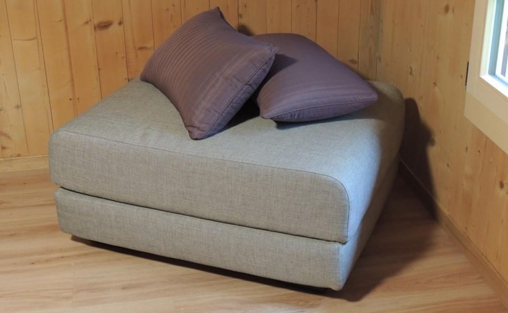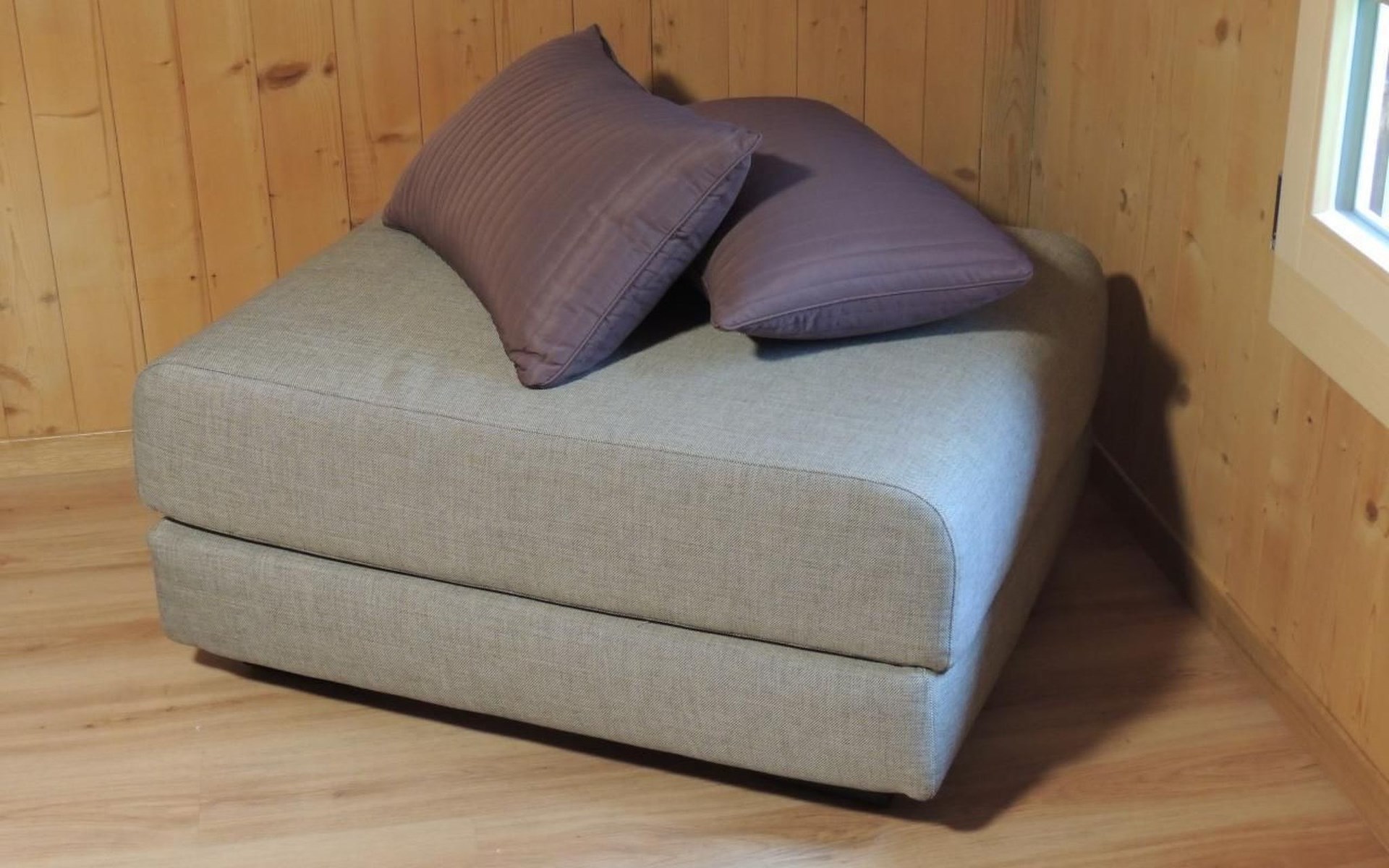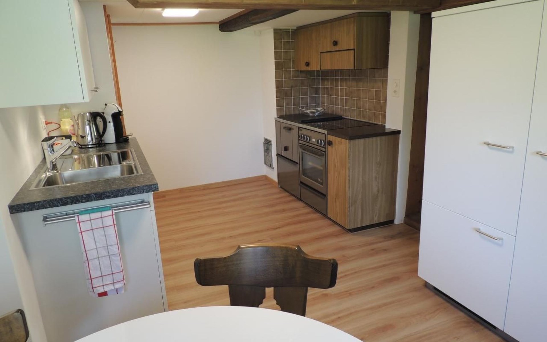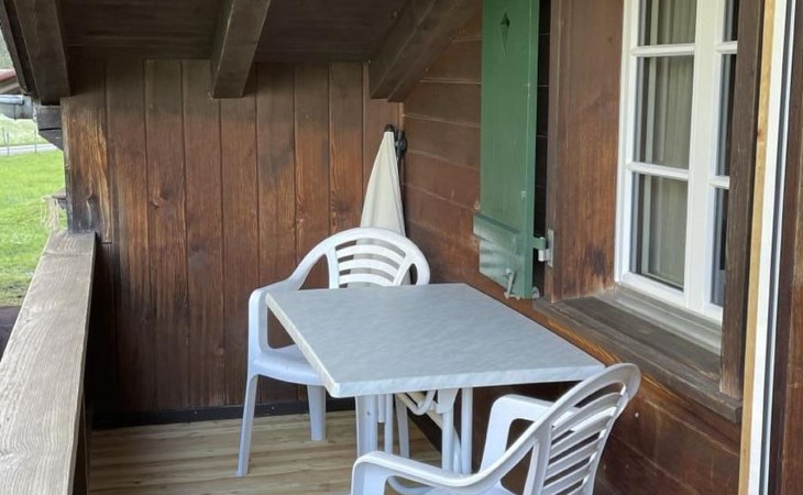 Im Inneren erwartet Sie eine separate, funktionell eingerichtete Küche mit Essecke, ausgestattet mit allem, was Sie für die kulinarische Selbstversorgung benötigen: Kühlschrank, Backofen, Geschirrspüler, Wasserkocher, Kaffeemaschine und sogar spezielles Geschirr für Raclette und Käsefondue. Das gemütliche Wohnzimmer lädt mit einem komfortablen Sofa und Satelliten-Fernseher/-Radio zum Entspannen ein, während das Schlafzimmer mit zwei Einzelbetten, einem zusätzlich aufklappbaren Betthocker und einem kostenlos verfügbaren Babybett für Kinder bis drei Jahre ausgestattet ist. Die rustikale Bauweise mit niedriger Deckenhöhe (ca. 195cm) sorgt für ein authentisches Wohngefühl.