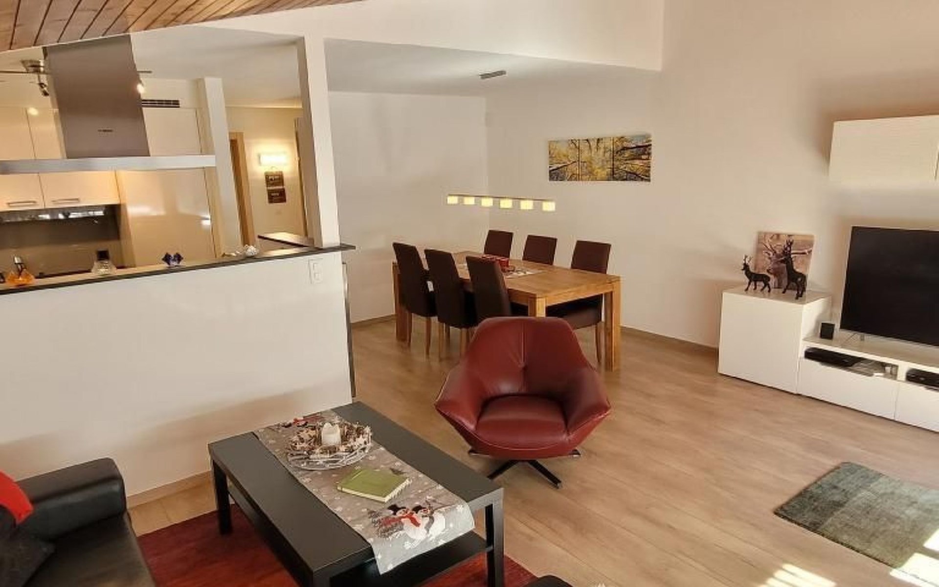 Die Innenräume der renovierten 4*-Wohnung, mit einer Fläche von ca. 80 m², sind mit Liebe zum Detail gestaltet. Es erwarten Sie zwei komfortable Schlafzimmer, eines mit Doppelbett, Schrank und Kommode, das andere mit zwei Betten und Schrank. Alle Betten sind bei Ihrer Anreise liebevoll bezogen. Das großzügige Wohn-Esszimmer mit offener, hochwertiger Küche lädt zum Verweilen ein. Modernste Ausstattung wie SAT-TV mit Blu-Ray-Player (DVD/CD) und kostenloses WIFI tragen zu einem rundum angenehmen Aufenthalt bei. In der Küche finden Sie alle notwendigen Geräte und Utensilien, von der Geschirrspülmaschine bis zur Kapsel-Kaffeemaschine.