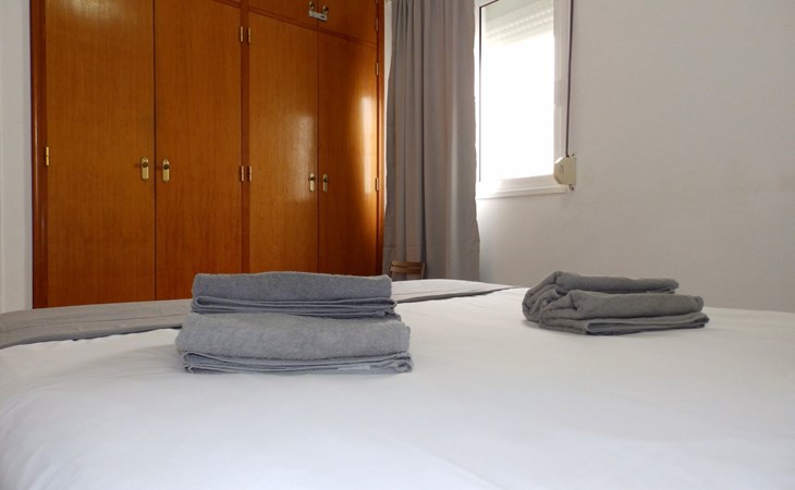 Ein Schlafzimmer mit Doppelbett und Einbauschrank.