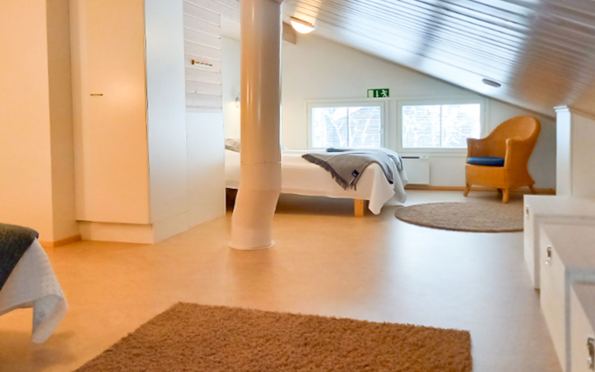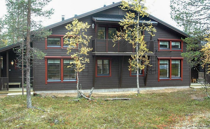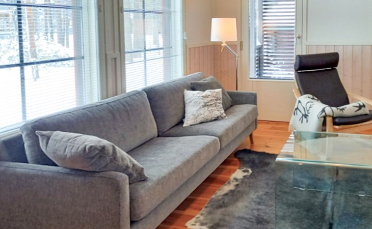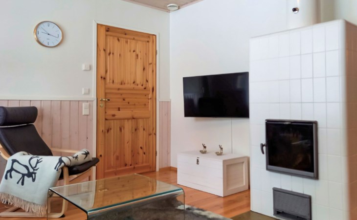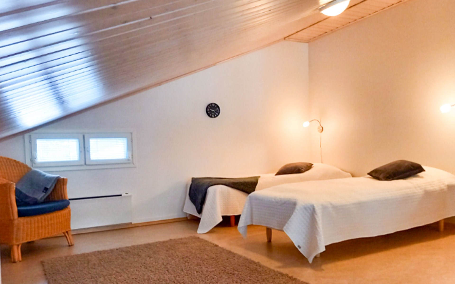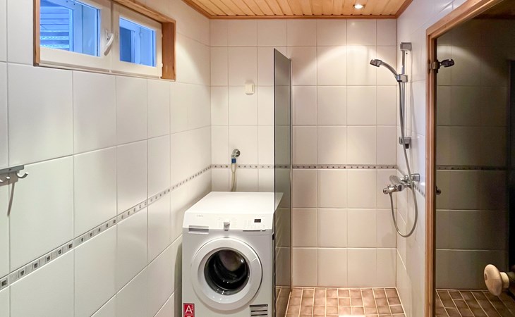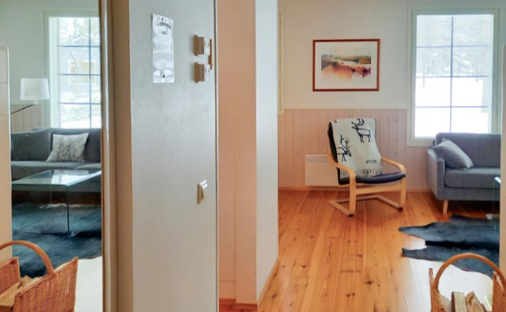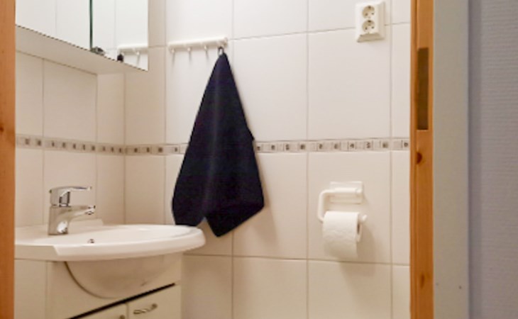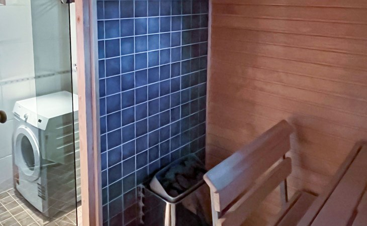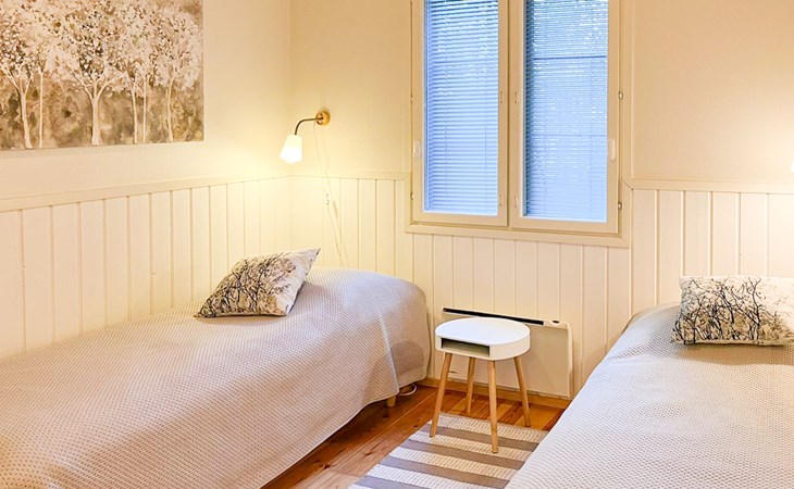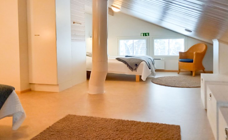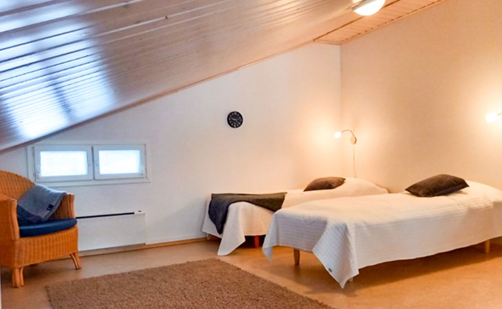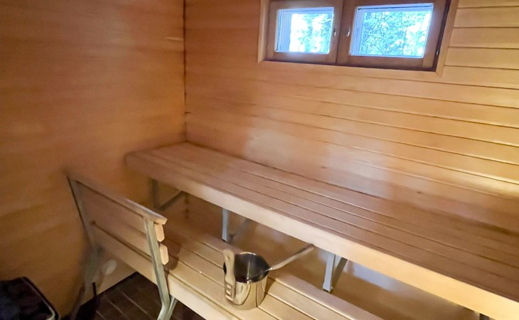 The area of the apartment is 84.5 m², on the ground floor there is a kitchen, sauna, washroom, toilet, bedroom and terrace. Separate beds for 2 in the bedroom. Upstairs, the large bedroom with a pitched roof has beds for four in two separate sections. The second bedroom upstairs has a double bed and access to the balcony. Vacationing is facilitated by another toilet in the lobby upstairs.