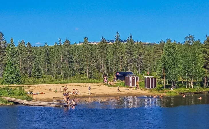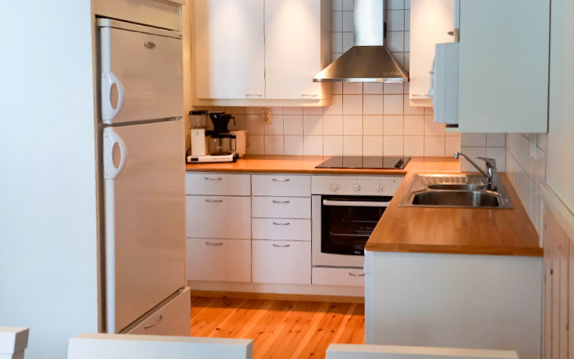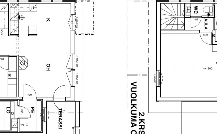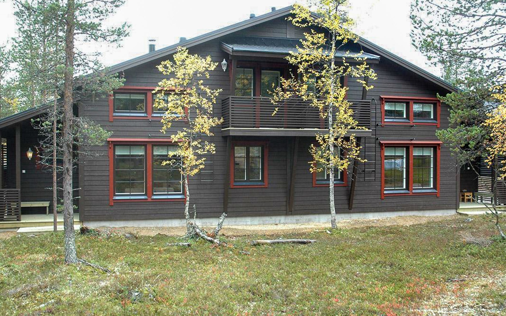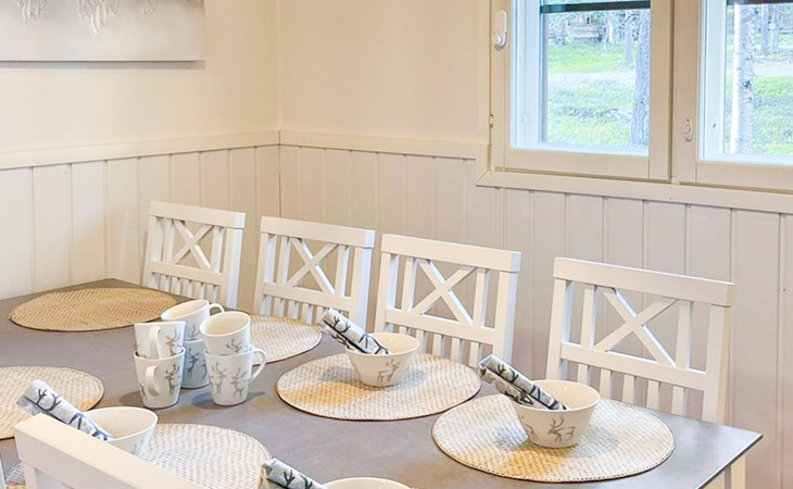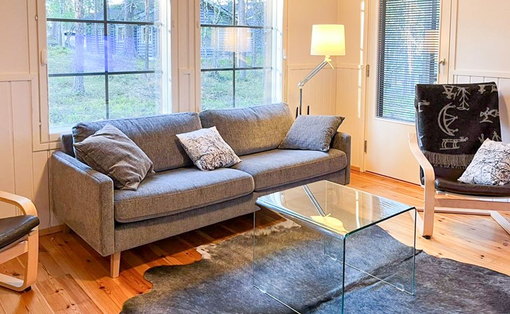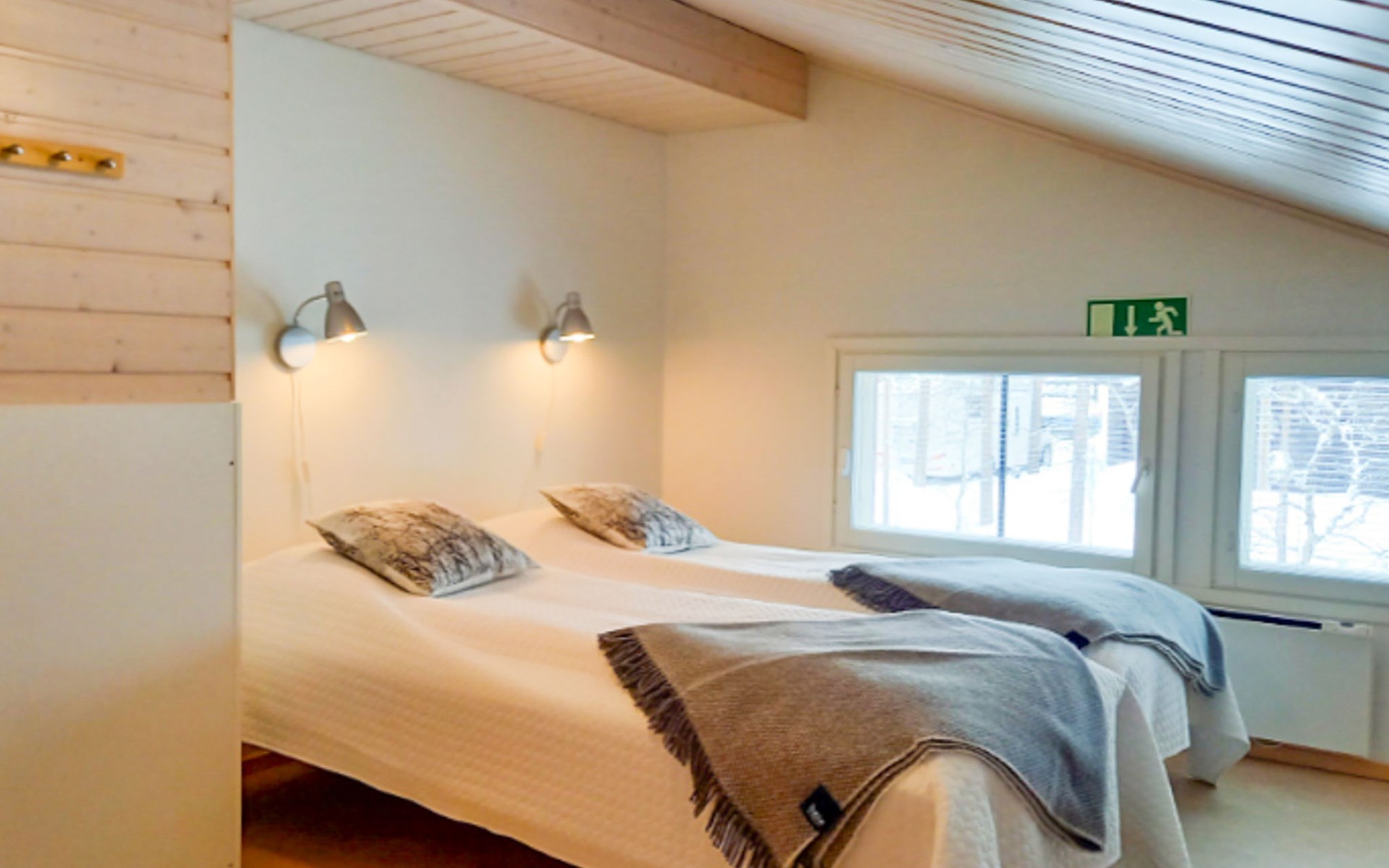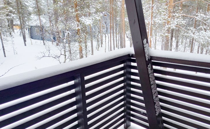 The area of the apartment is 84.5 m², on the ground floor there is a kitchen, sauna, washroom, toilet, bedroom and terrace. Separate beds for 2 in the bedroom. Upstairs, the large bedroom with a pitched roof has beds for four in two separate sections. The second bedroom upstairs has a double bed and access to the balcony. Vacationing is facilitated by another toilet in the lobby upstairs.