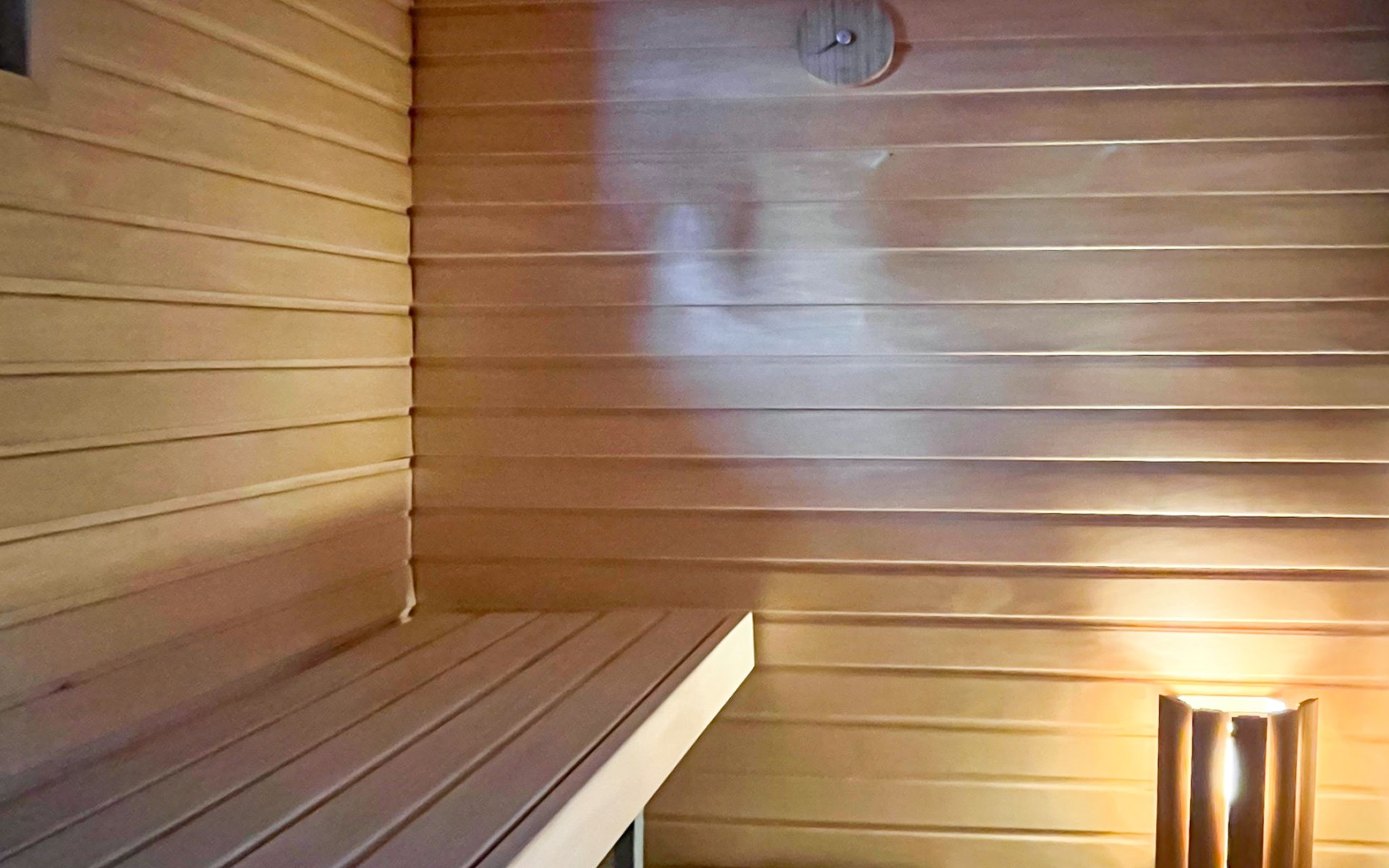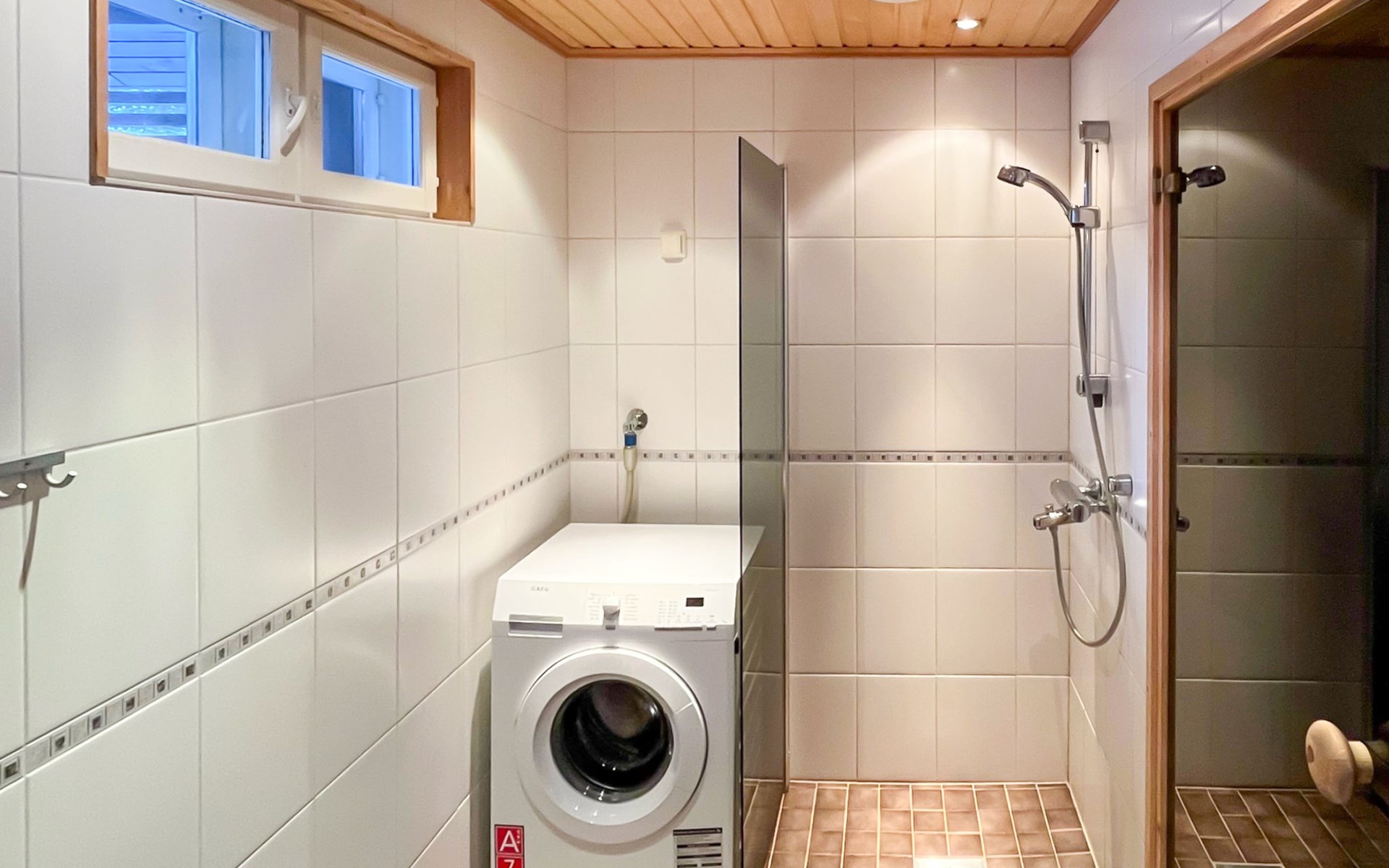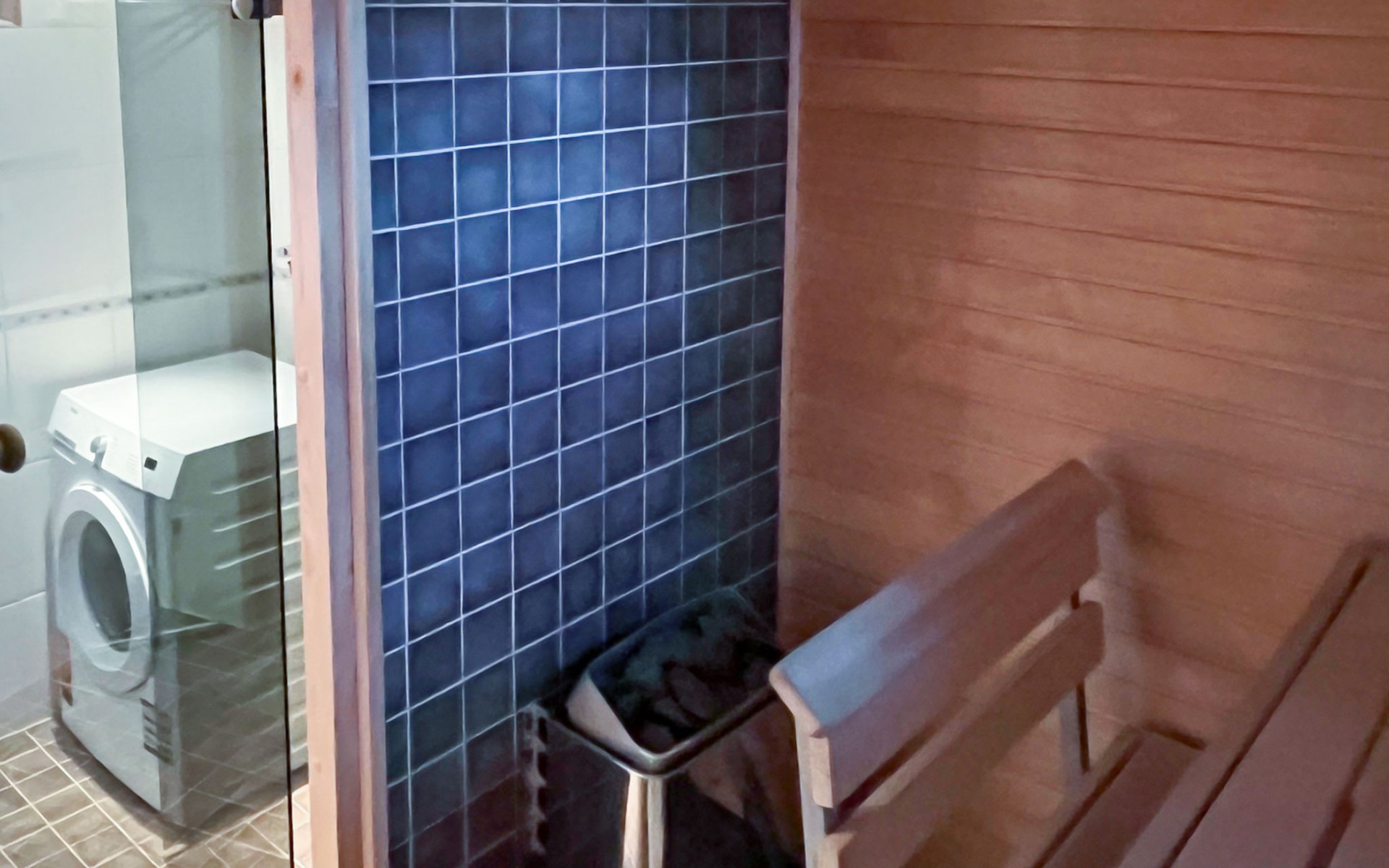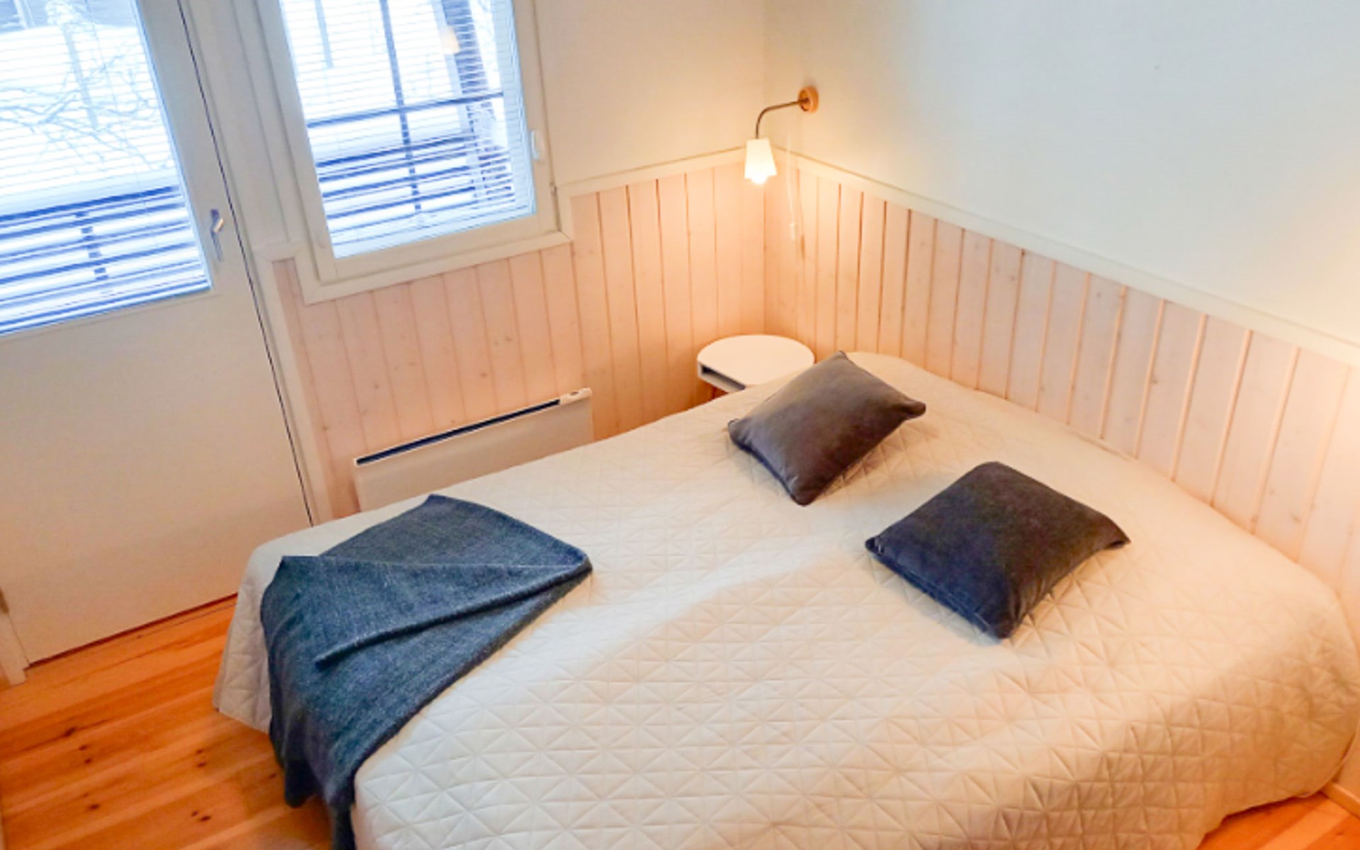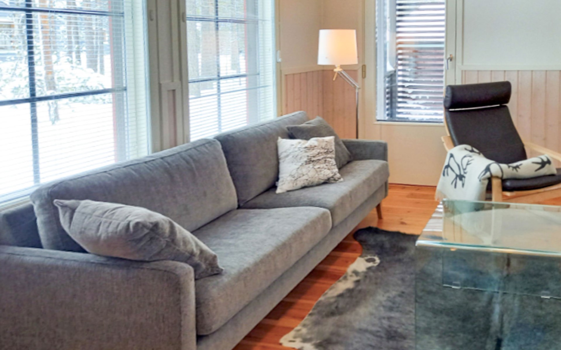 The area of the apartment is 84.5 m², on the ground floor there is a kitchen, sauna, washroom, toilet, bedroom and terrace. Separate beds for 2 in the bedroom. Upstairs, the large bedroom with a pitched roof has beds for four in two separate sections. The second bedroom upstairs has a double bed and access to the balcony. Vacationing is facilitated by another toilet in the lobby upstairs.