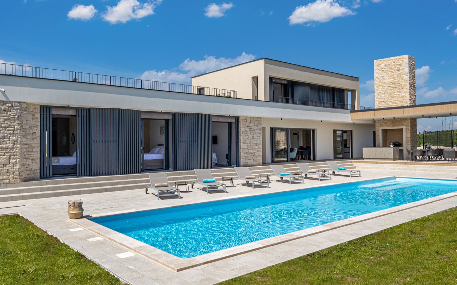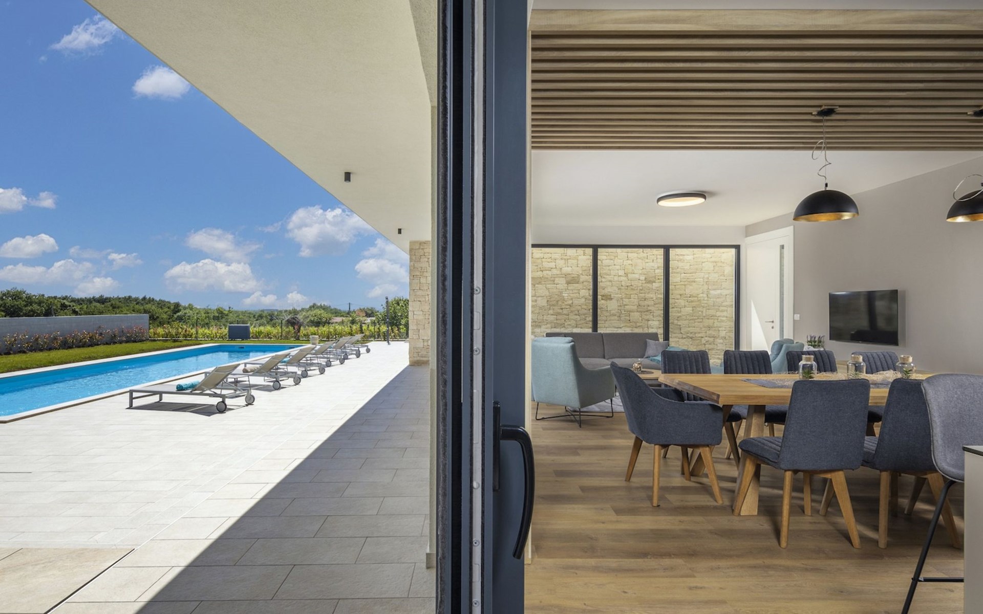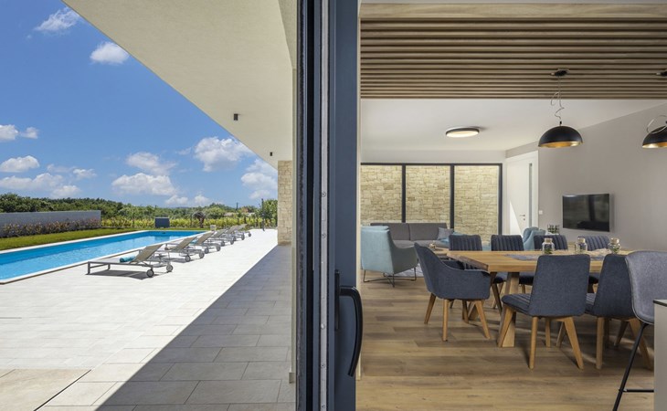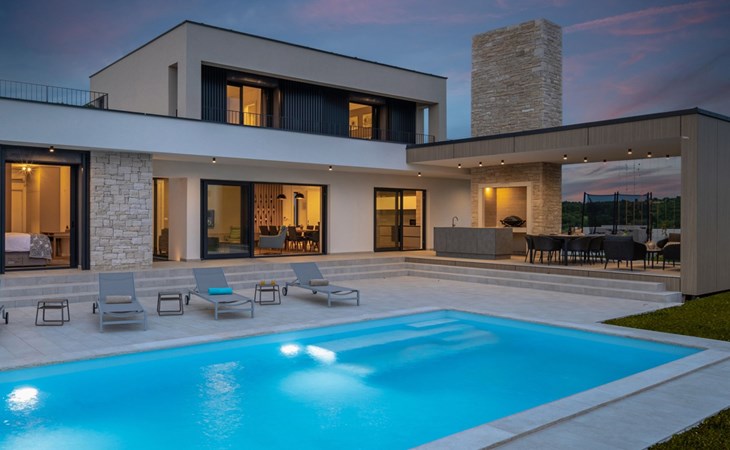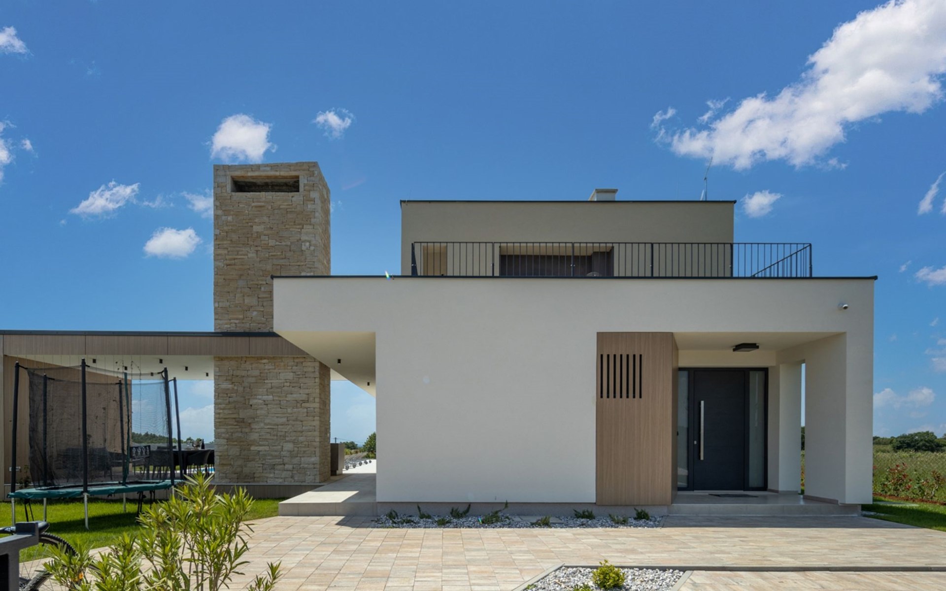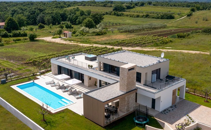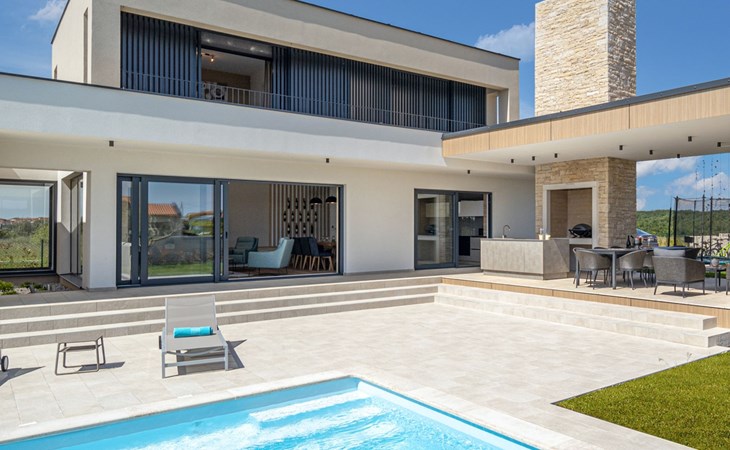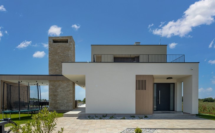 Moderne, luxuriöse Villa "La Perla", auf 2 Stockwerken, Baujahr 2021. 1 km vom Zentrum von Nova Vas, 2 km vom Zentrum von Brtonigla, 10 km vom Zentrum von Novigrad, sonnige Lage, 8.2 km vom Meer. Zur Alleinbenutzung: Grundstück 900 m2 (eingezäunt) mit Rasen, Schwimmbad eckig, beheizt (60 m2, 135 cm tief, saisonale Verfügbarkeit: 10.Apr. - 05.Nov.) mit Innentreppe. Aussendusche, Sprudelbad, Badminton, Terrasse (10 m2), Gartenmöbel, Grillhaus. Im Hause: Internetzugang, Sauna, Tischfussball, Trampolin, Waschmaschine. Zur Verfügung: Fahrräder (2). Zufahrt (500 m Naturweg). Parkplatz (für 4 Autos) beim Haus auf dem Grundstück. Einkaufsgeschäft 1.5 km, Restaurant 650 m, Bushaltestelle 4 km, Kieselstrand 8.2 km. Wanderwege ab Haus, Radweg 100 m. Nahe gelegene Sehenswürdigkeiten: Aquapark 2 km. Jugendgruppen nur auf Anfrage. Bitte beachten: Flugplatz 20 km vom Haus. Schwimmbad beheizt (extra). Videoüberwachung der Einfahrt und des Parkplatzes.