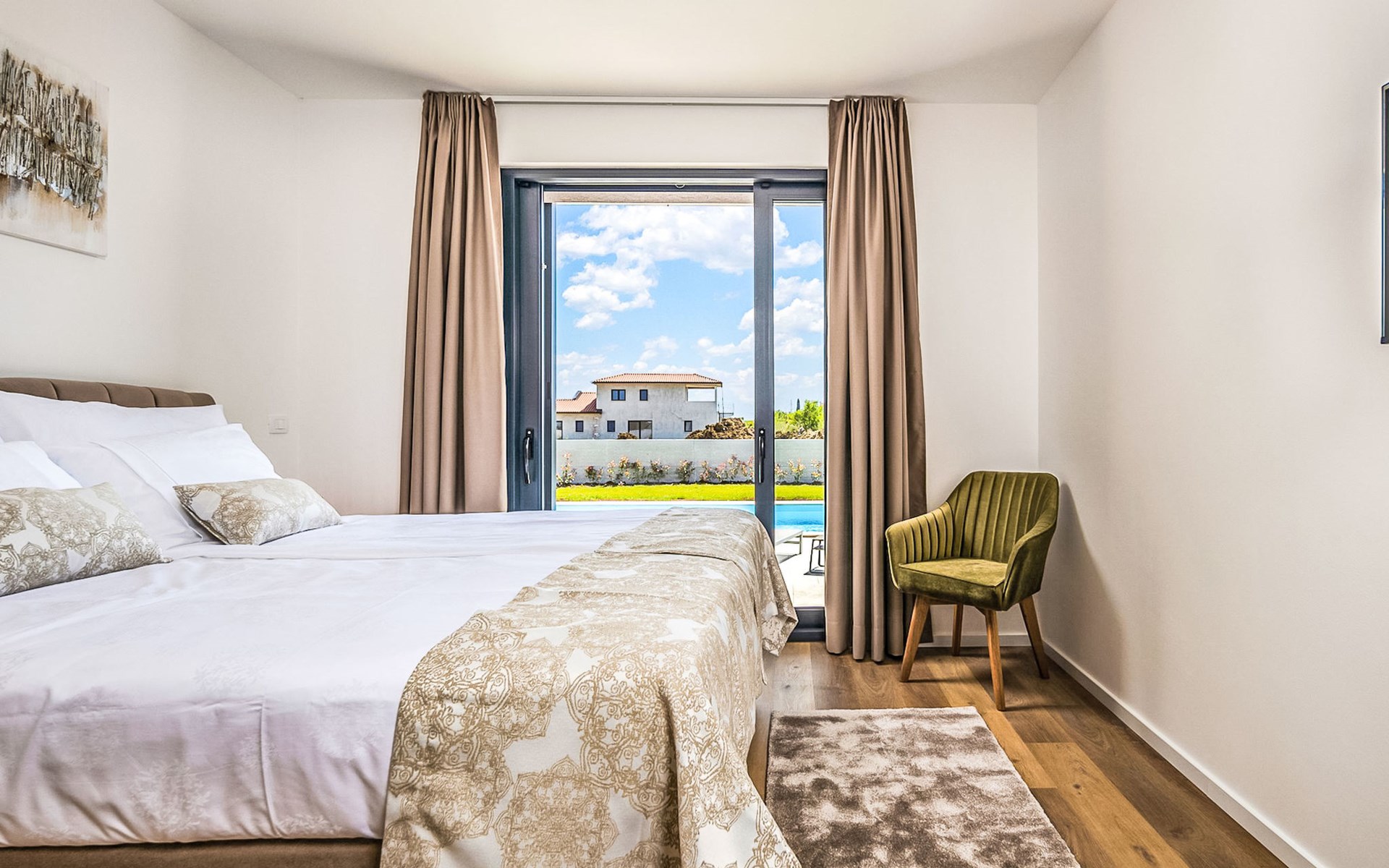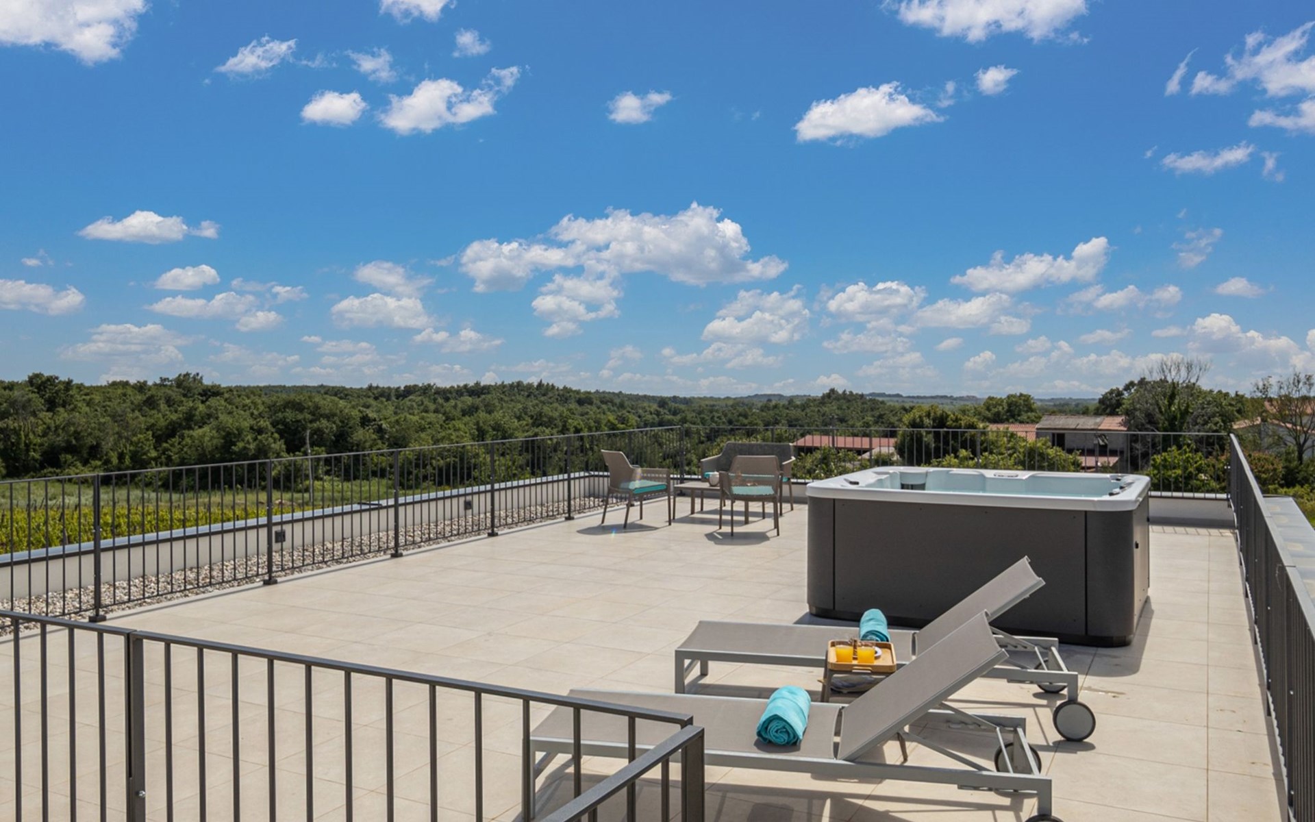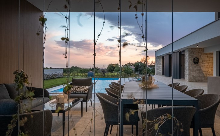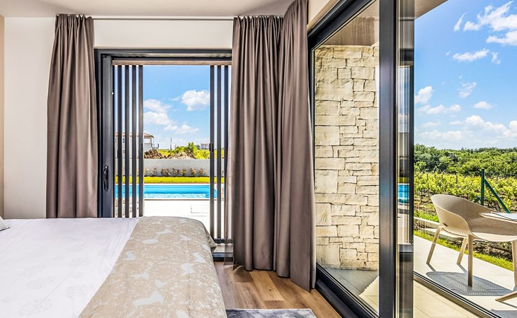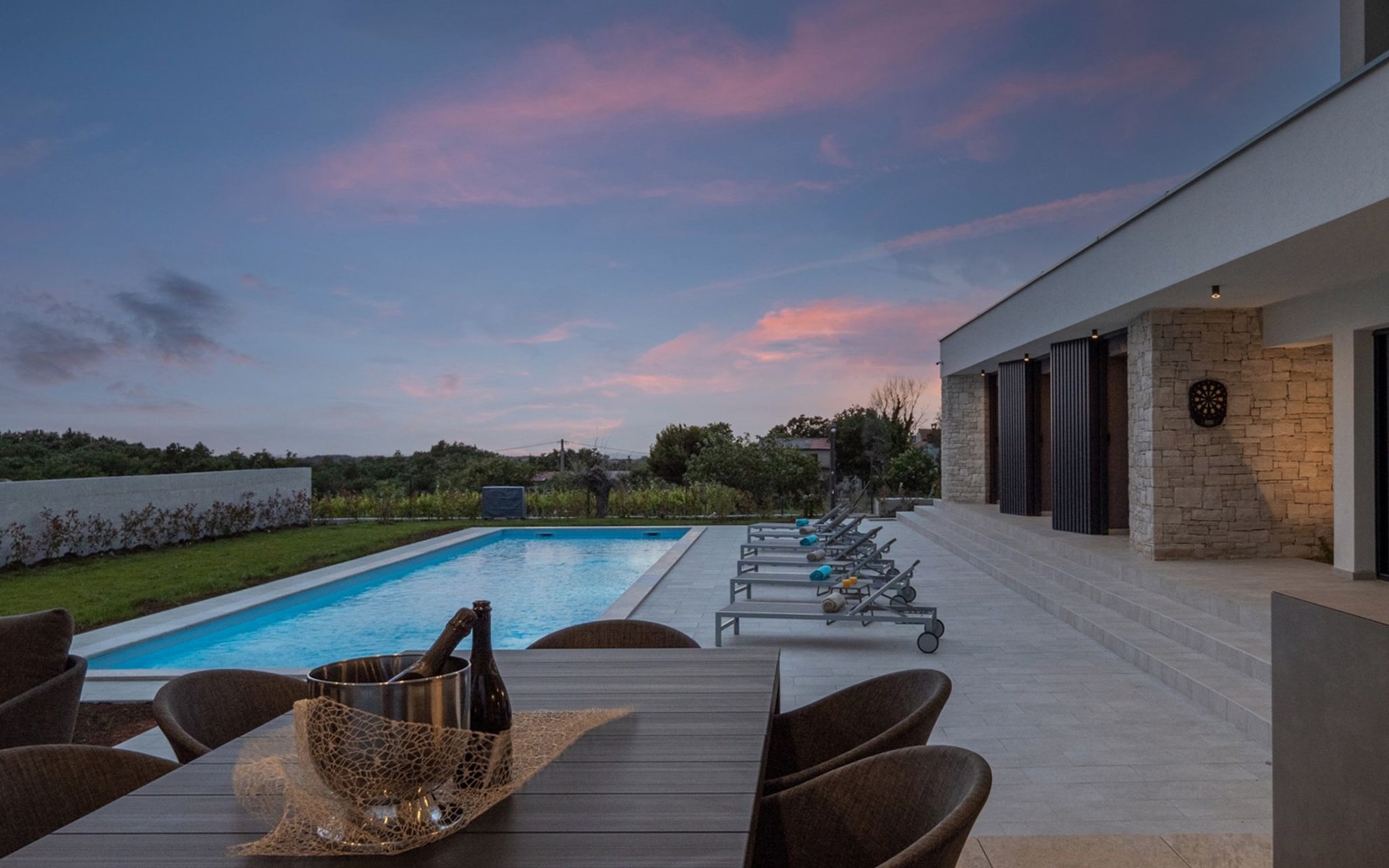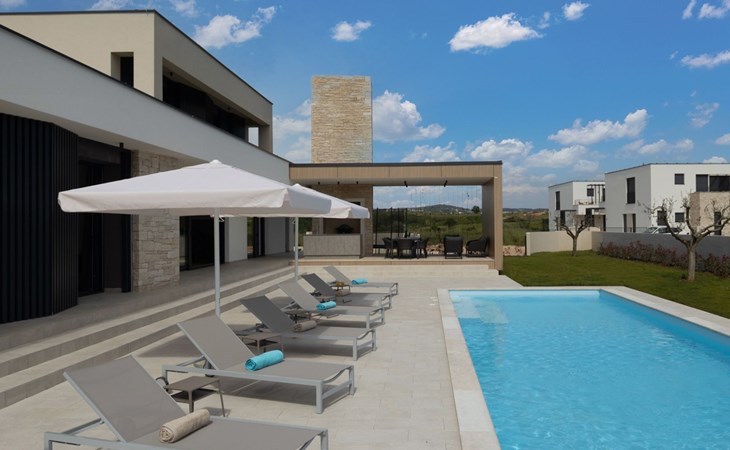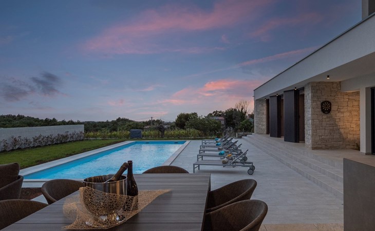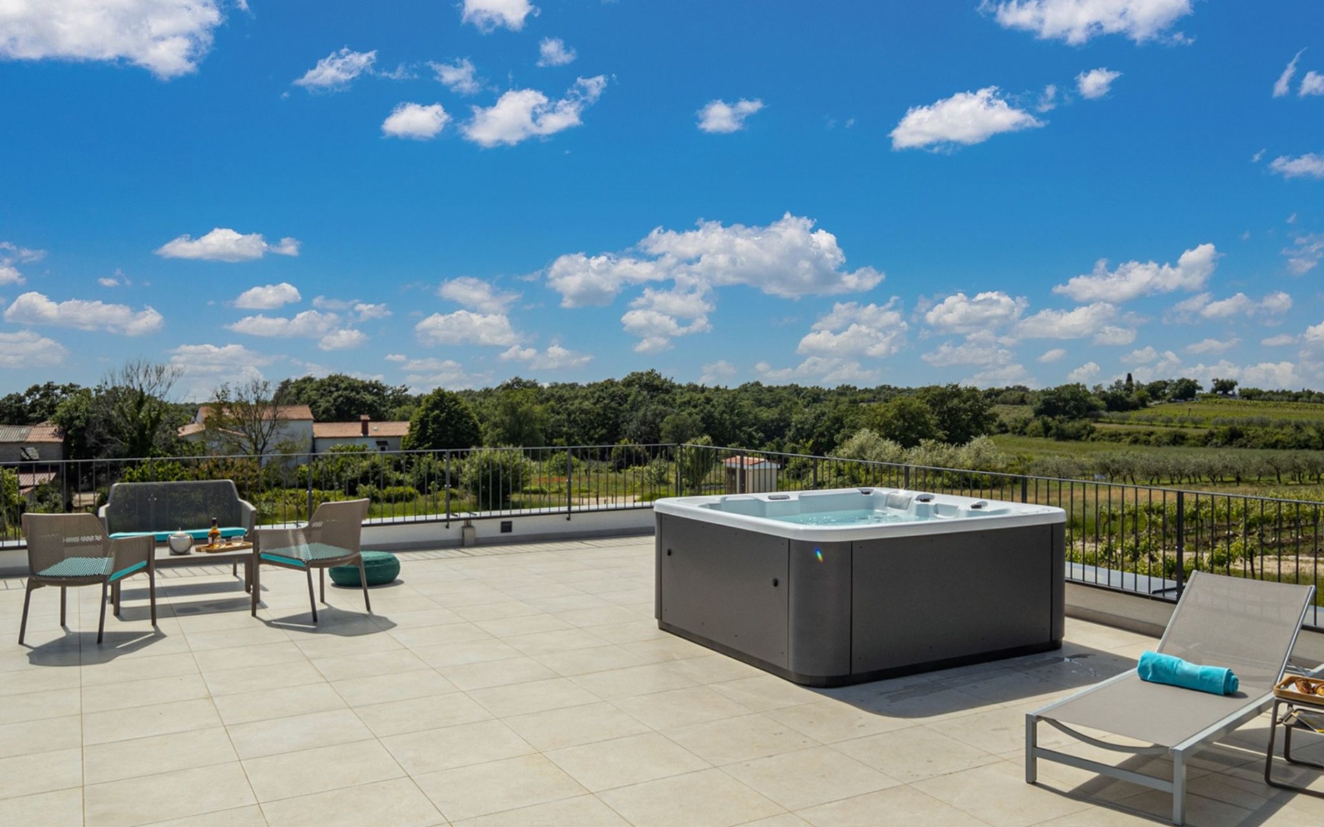 Moderne, luxuriöse Villa "La Perla", auf 2 Stockwerken, Baujahr 2021. 1 km vom Zentrum von Nova Vas, 2 km vom Zentrum von Brtonigla, 10 km vom Zentrum von Novigrad, sonnige Lage, 8.2 km vom Meer. Zur Alleinbenutzung: Grundstück 900 m2 (eingezäunt) mit Rasen, Schwimmbad eckig, beheizt (60 m2, 135 cm tief, saisonale Verfügbarkeit: 10.Apr. - 05.Nov.) mit Innentreppe. Aussendusche, Sprudelbad, Badminton, Terrasse (10 m2), Gartenmöbel, Grillhaus. Im Hause: Internetzugang, Sauna, Tischfussball, Trampolin, Waschmaschine. Zur Verfügung: Fahrräder (2). Zufahrt (500 m Naturweg). Parkplatz (für 4 Autos) beim Haus auf dem Grundstück. Einkaufsgeschäft 1.5 km, Restaurant 650 m, Bushaltestelle 4 km, Kieselstrand 8.2 km. Wanderwege ab Haus, Radweg 100 m. Nahe gelegene Sehenswürdigkeiten: Aquapark 2 km. Jugendgruppen nur auf Anfrage. Bitte beachten: Flugplatz 20 km vom Haus. Schwimmbad beheizt (extra). Videoüberwachung der Einfahrt und des Parkplatzes.