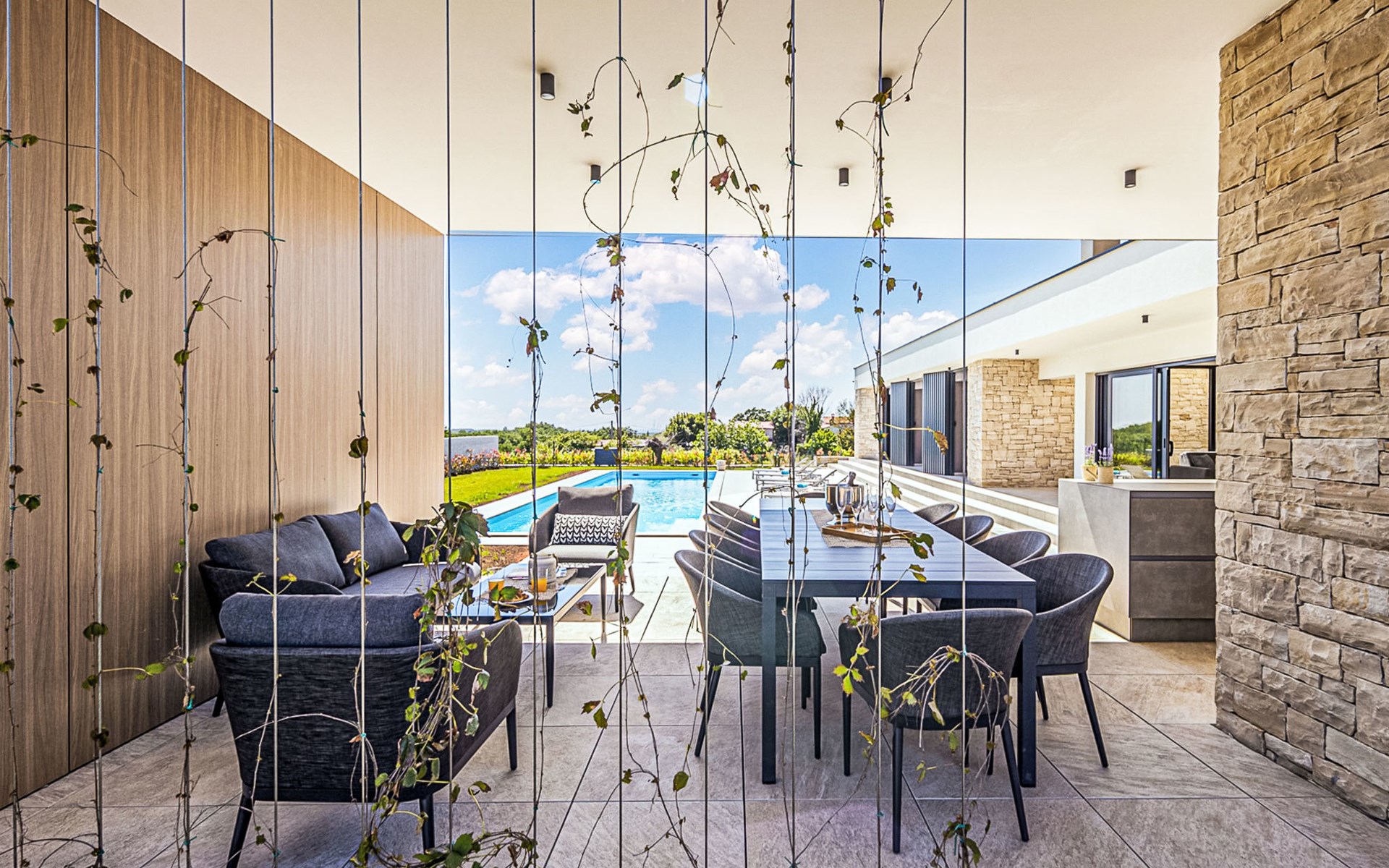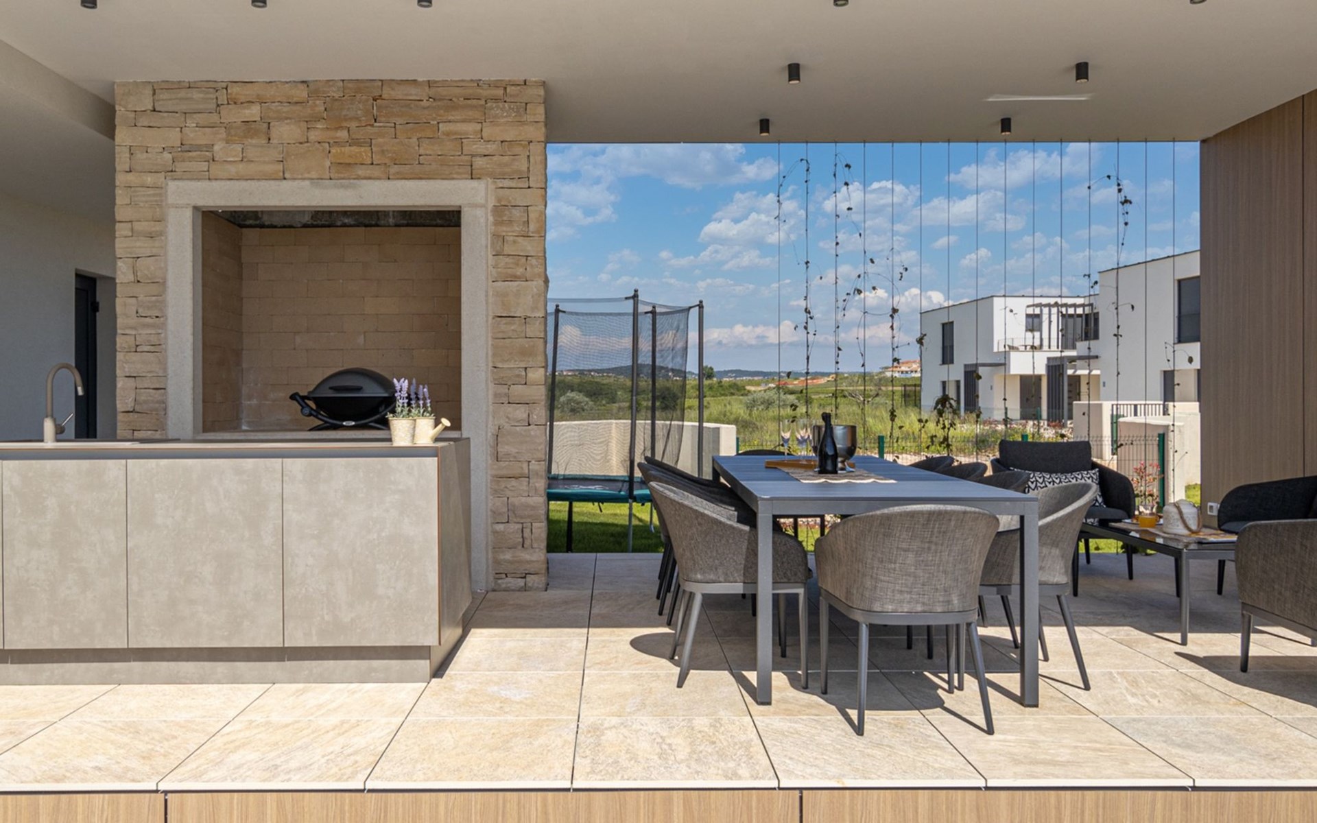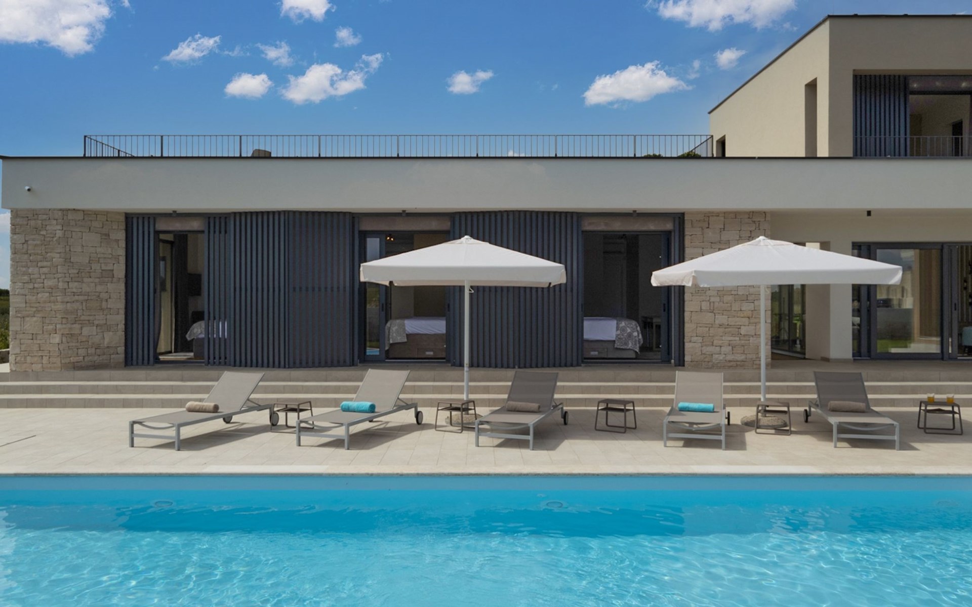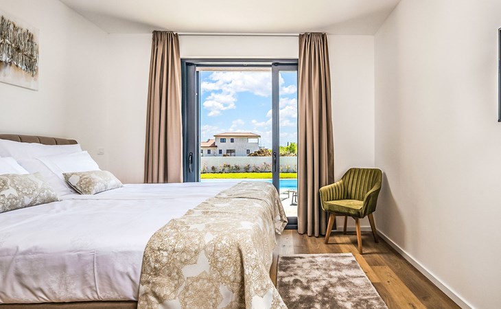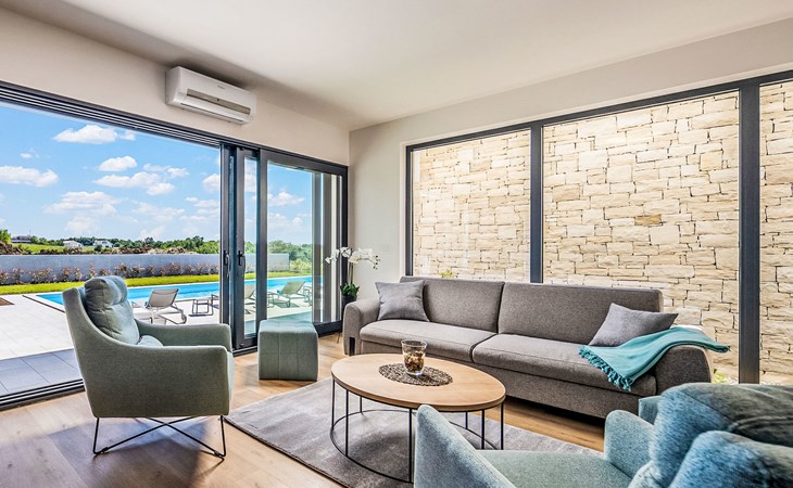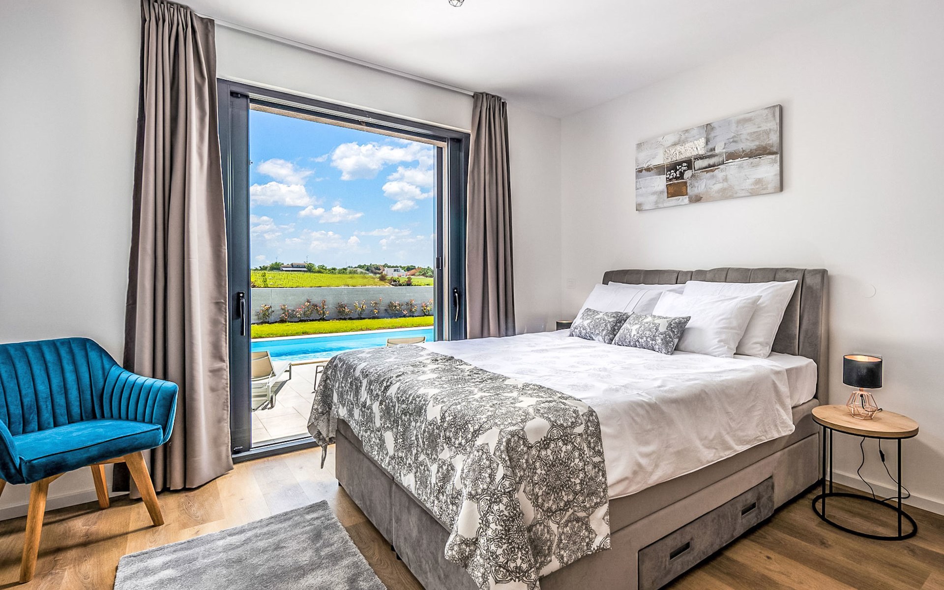 Moderne, luxuriöse Villa "La Perla", auf 2 Stockwerken, Baujahr 2021. 1 km vom Zentrum von Nova Vas, 2 km vom Zentrum von Brtonigla, 10 km vom Zentrum von Novigrad, sonnige Lage, 8.2 km vom Meer. Zur Alleinbenutzung: Grundstück 900 m2 (eingezäunt) mit Rasen, Schwimmbad eckig, beheizt (60 m2, 135 cm tief, saisonale Verfügbarkeit: 10.Apr. - 05.Nov.) mit Innentreppe. Aussendusche, Sprudelbad, Badminton, Terrasse (10 m2), Gartenmöbel, Grillhaus. Im Hause: Internetzugang, Sauna, Tischfussball, Trampolin, Waschmaschine. Zur Verfügung: Fahrräder (2). Zufahrt (500 m Naturweg). Parkplatz (für 4 Autos) beim Haus auf dem Grundstück. Einkaufsgeschäft 1.5 km, Restaurant 650 m, Bushaltestelle 4 km, Kieselstrand 8.2 km. Wanderwege ab Haus, Radweg 100 m. Nahe gelegene Sehenswürdigkeiten: Aquapark 2 km. Jugendgruppen nur auf Anfrage. Bitte beachten: Flugplatz 20 km vom Haus. Schwimmbad beheizt (extra). Videoüberwachung der Einfahrt und des Parkplatzes.