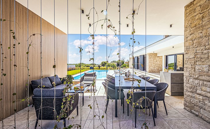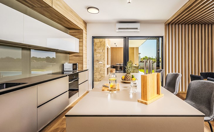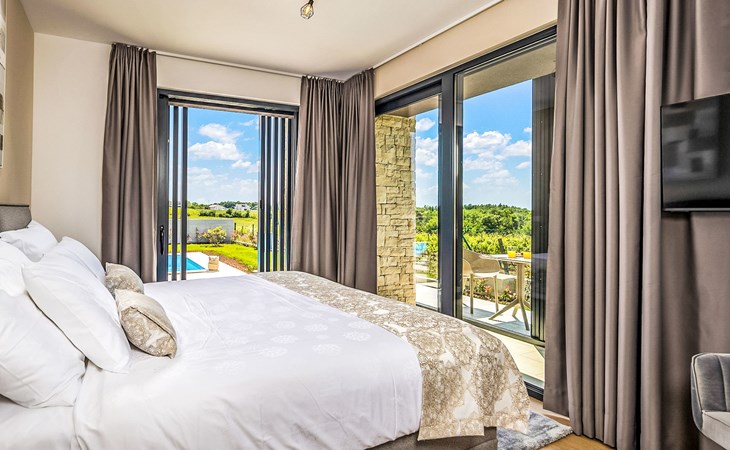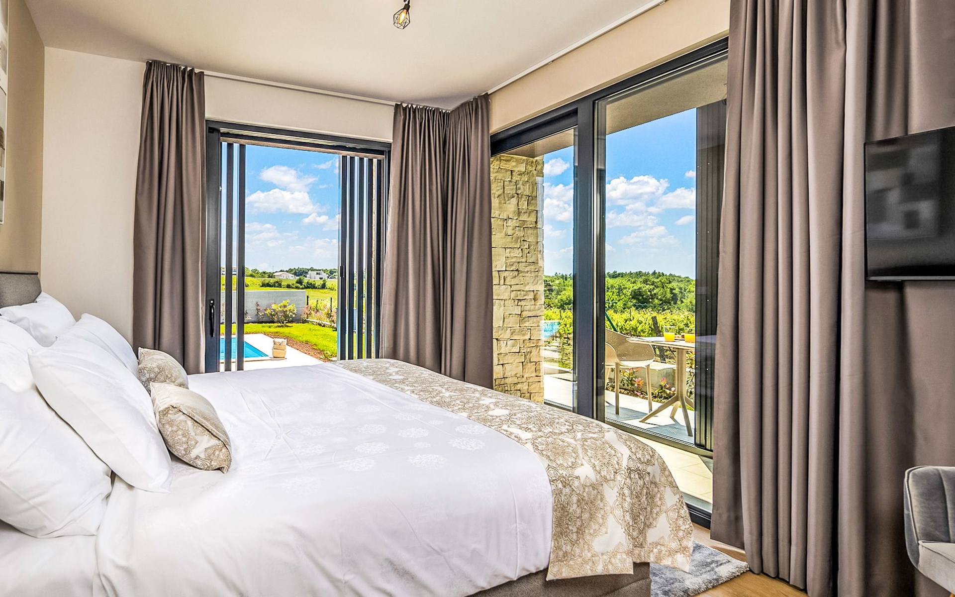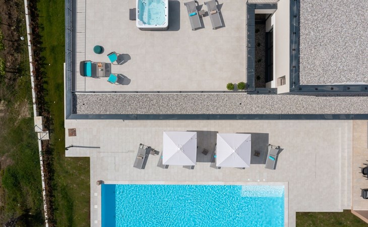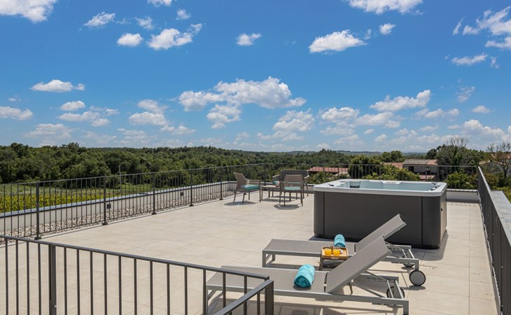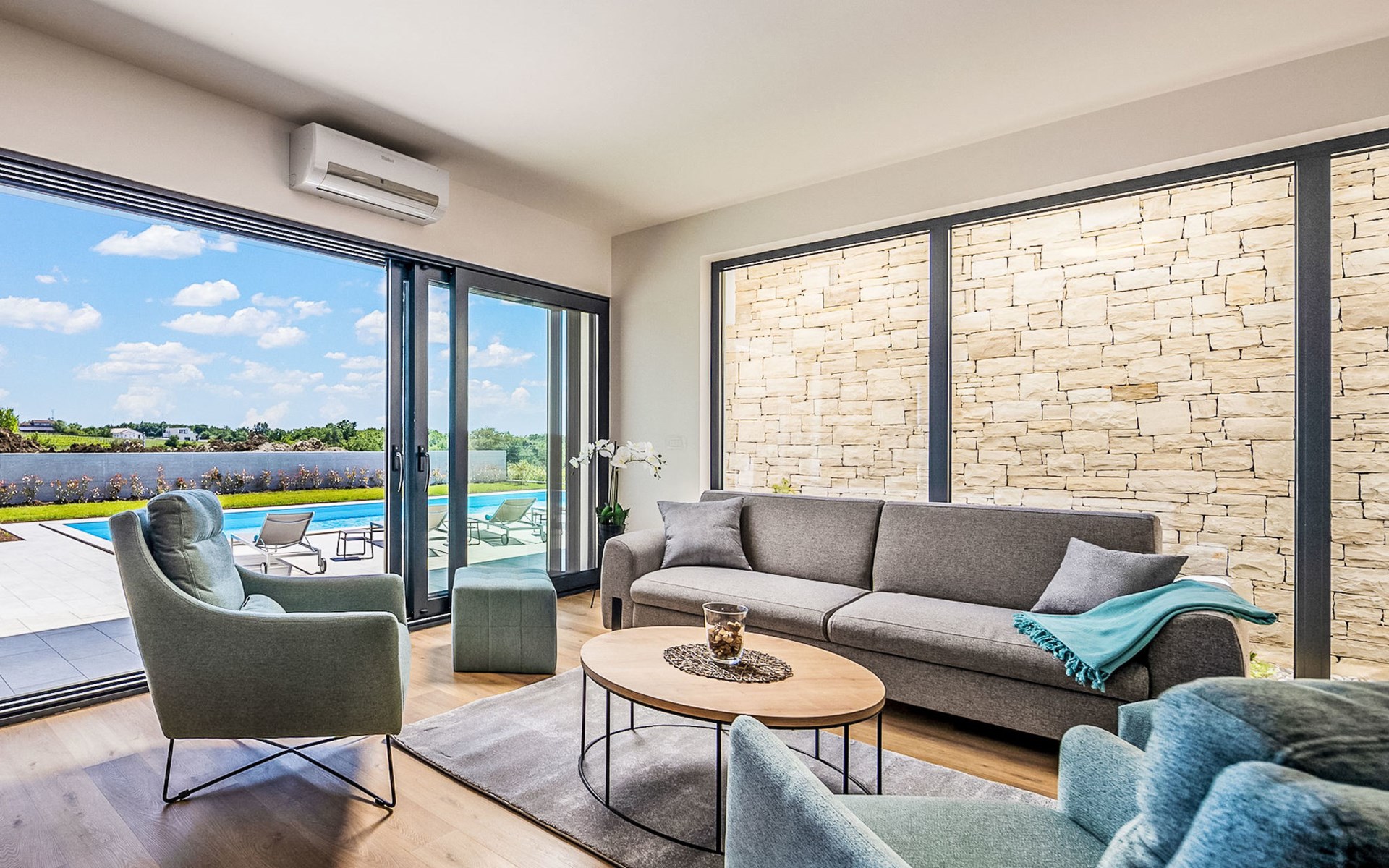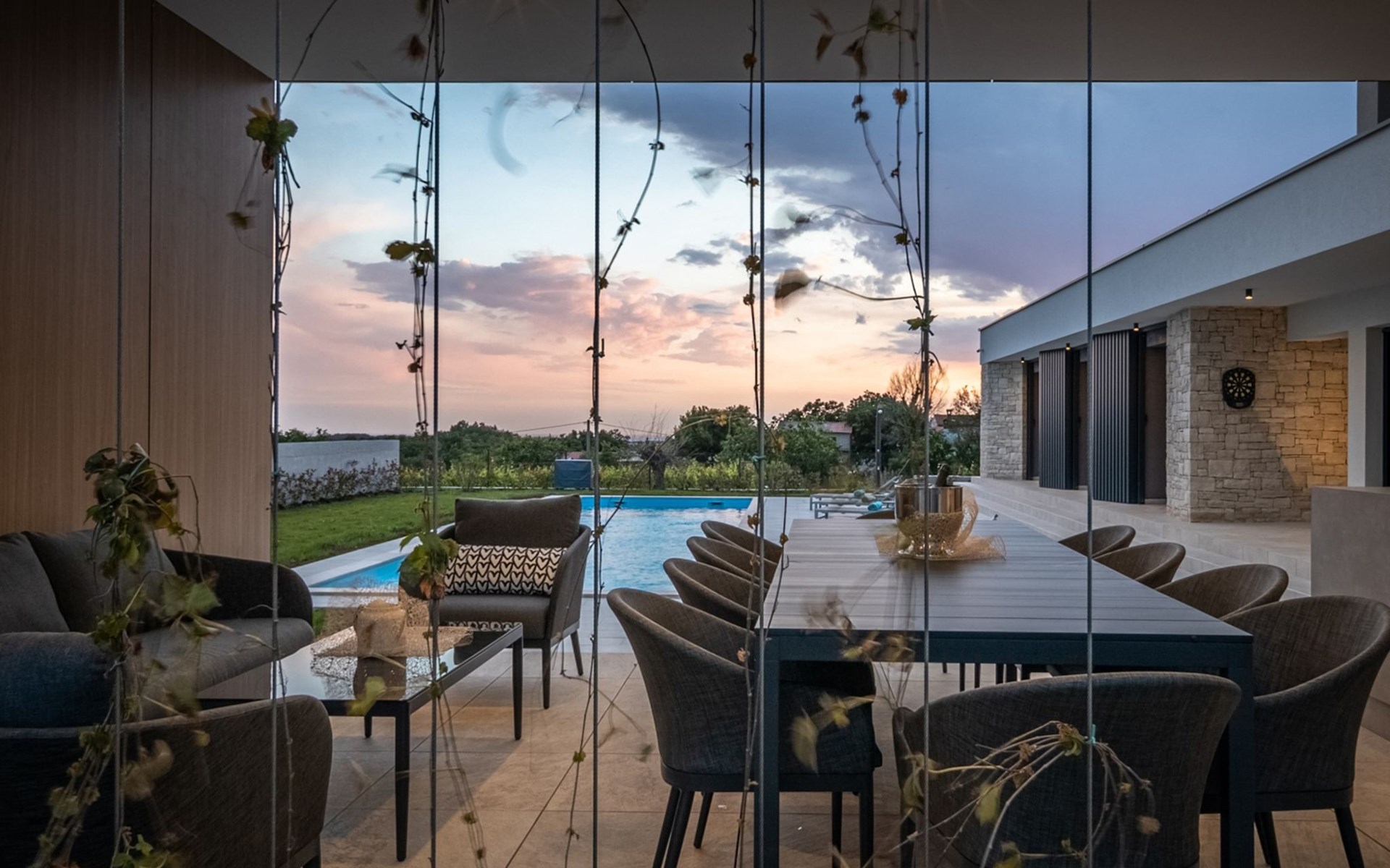 Moderne, luxuriöse Villa "La Perla", auf 2 Stockwerken, Baujahr 2021. 1 km vom Zentrum von Nova Vas, 2 km vom Zentrum von Brtonigla, 10 km vom Zentrum von Novigrad, sonnige Lage, 8.2 km vom Meer. Zur Alleinbenutzung: Grundstück 900 m2 (eingezäunt) mit Rasen, Schwimmbad eckig, beheizt (60 m2, 135 cm tief, saisonale Verfügbarkeit: 10.Apr. - 05.Nov.) mit Innentreppe. Aussendusche, Sprudelbad, Badminton, Terrasse (10 m2), Gartenmöbel, Grillhaus. Im Hause: Internetzugang, Sauna, Tischfussball, Trampolin, Waschmaschine. Zur Verfügung: Fahrräder (2). Zufahrt (500 m Naturweg). Parkplatz (für 4 Autos) beim Haus auf dem Grundstück. Einkaufsgeschäft 1.5 km, Restaurant 650 m, Bushaltestelle 4 km, Kieselstrand 8.2 km. Wanderwege ab Haus, Radweg 100 m. Nahe gelegene Sehenswürdigkeiten: Aquapark 2 km. Jugendgruppen nur auf Anfrage. Bitte beachten: Flugplatz 20 km vom Haus. Schwimmbad beheizt (extra). Videoüberwachung der Einfahrt und des Parkplatzes.