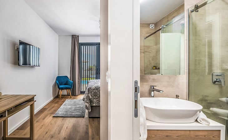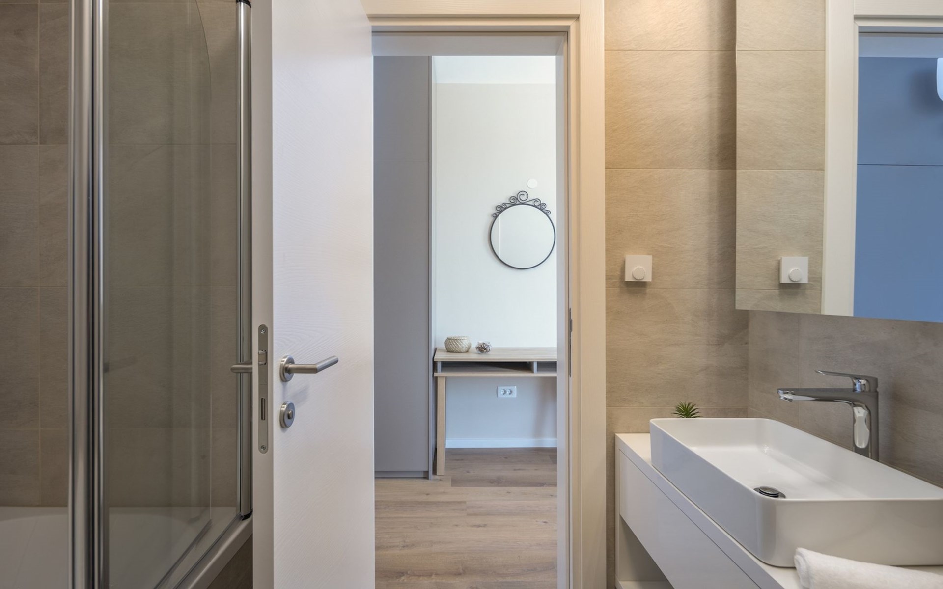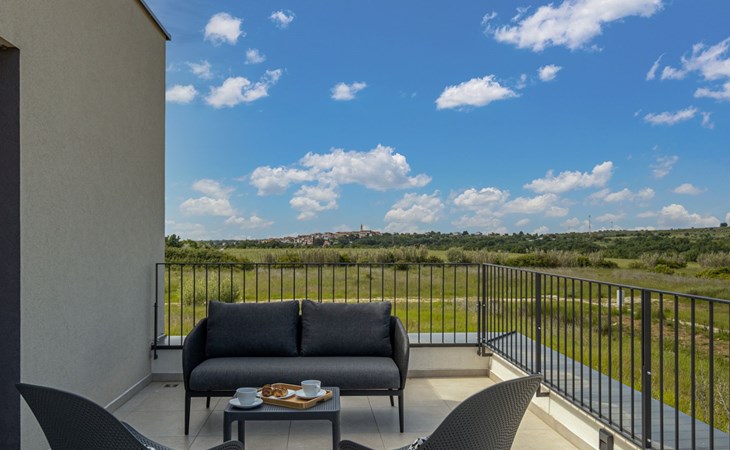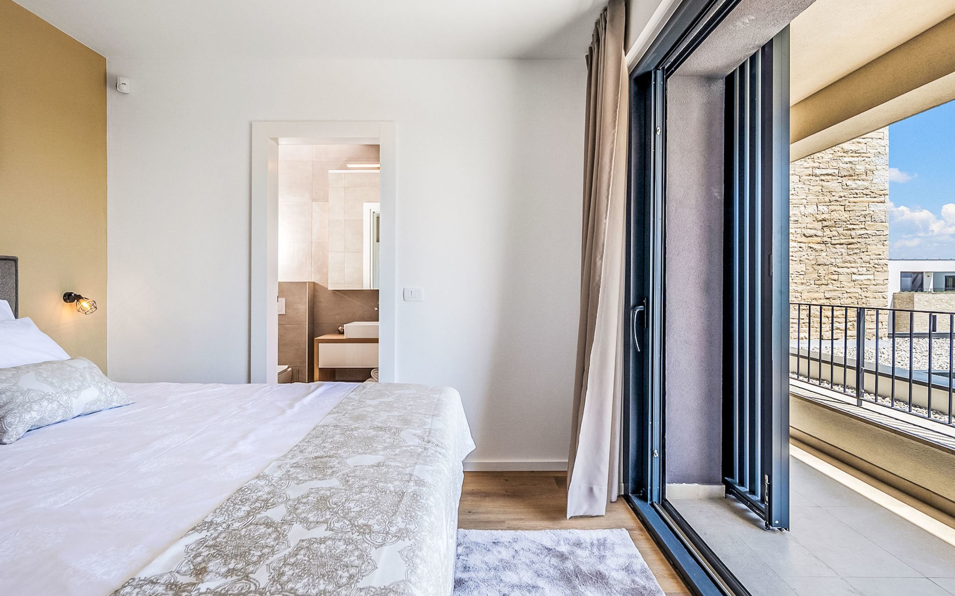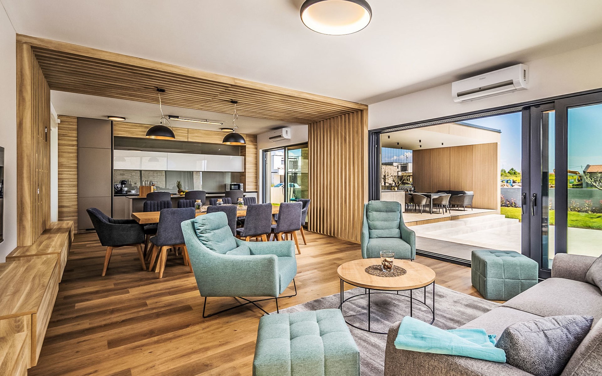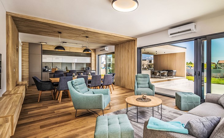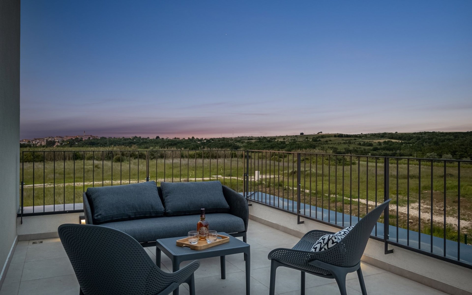 Moderne, luxuriöse Villa "La Perla", auf 2 Stockwerken, Baujahr 2021. 1 km vom Zentrum von Nova Vas, 2 km vom Zentrum von Brtonigla, 10 km vom Zentrum von Novigrad, sonnige Lage, 8.2 km vom Meer. Zur Alleinbenutzung: Grundstück 900 m2 (eingezäunt) mit Rasen, Schwimmbad eckig, beheizt (60 m2, 135 cm tief, saisonale Verfügbarkeit: 10.Apr. - 05.Nov.) mit Innentreppe. Aussendusche, Sprudelbad, Badminton, Terrasse (10 m2), Gartenmöbel, Grillhaus. Im Hause: Internetzugang, Sauna, Tischfussball, Trampolin, Waschmaschine. Zur Verfügung: Fahrräder (2). Zufahrt (500 m Naturweg). Parkplatz (für 4 Autos) beim Haus auf dem Grundstück. Einkaufsgeschäft 1.5 km, Restaurant 650 m, Bushaltestelle 4 km, Kieselstrand 8.2 km. Wanderwege ab Haus, Radweg 100 m. Nahe gelegene Sehenswürdigkeiten: Aquapark 2 km. Jugendgruppen nur auf Anfrage. Bitte beachten: Flugplatz 20 km vom Haus. Schwimmbad beheizt (extra). Videoüberwachung der Einfahrt und des Parkplatzes.