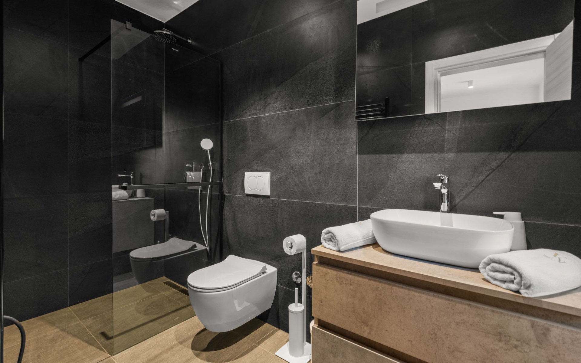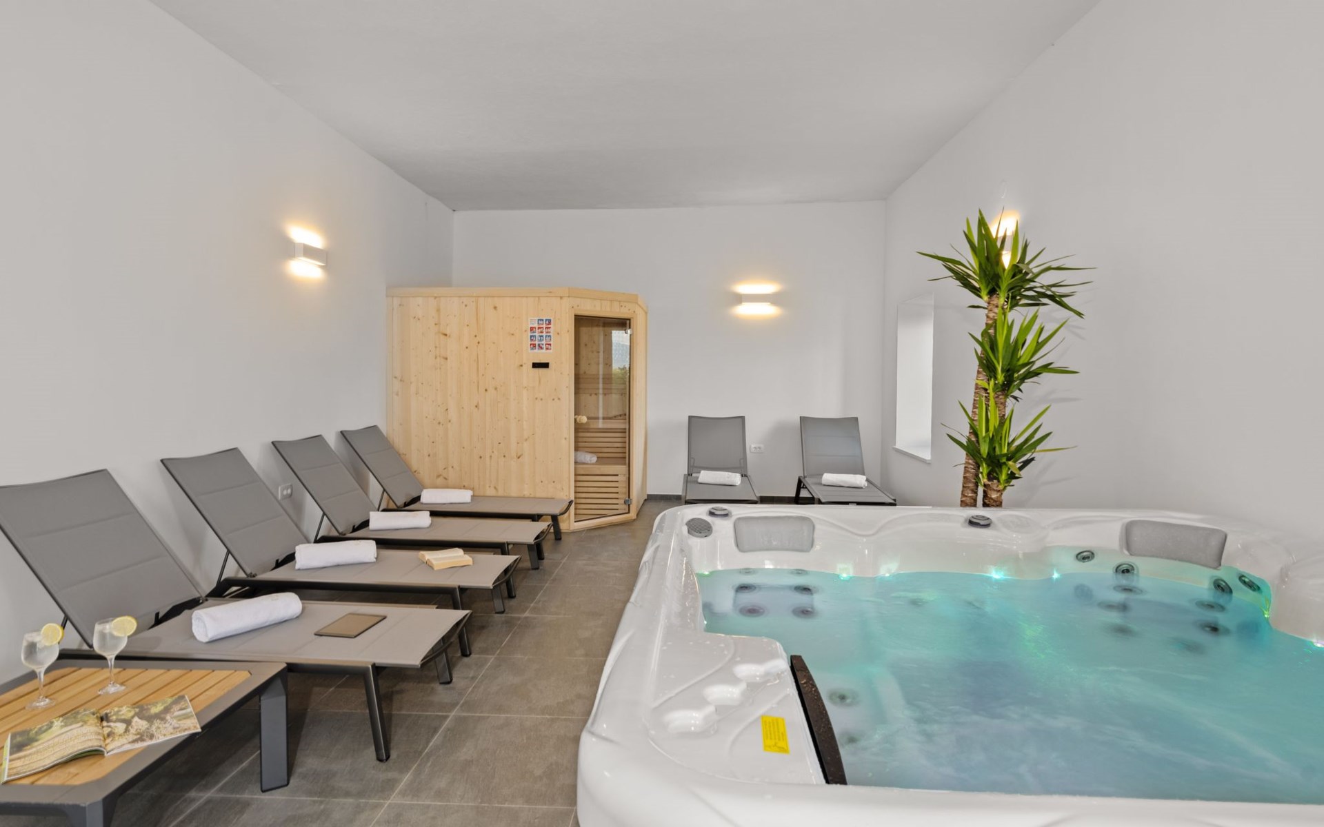 Der Wellnessbereich im Erdgeschoss bietet alles, was Sie für vollkommene Entspannung benötigen: eine Sauna, einen Jacuzzi und Ruheliegen. Für Fitness-Enthusiasten steht ein gut ausgestattetes Gym bereit. Zudem gibt es eine zusätzliche Dusche mit WC für zusätzlichen Komfort.