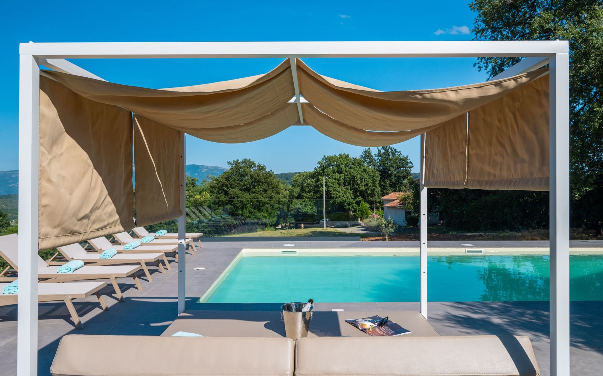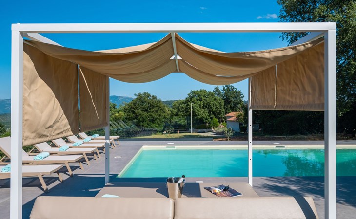 Im Außenbereich der Villa erwartet Sie ein riesiger, 50 m² großer Pool, umgeben von einer grünen Oase mit Liegestühlen und Sonnenschirmen. Hier können Sie die Sonne genießen und in der idyllischen Umgebung entspannen. Der Pool ist geöffnet vom 01.05 bis 30.10.