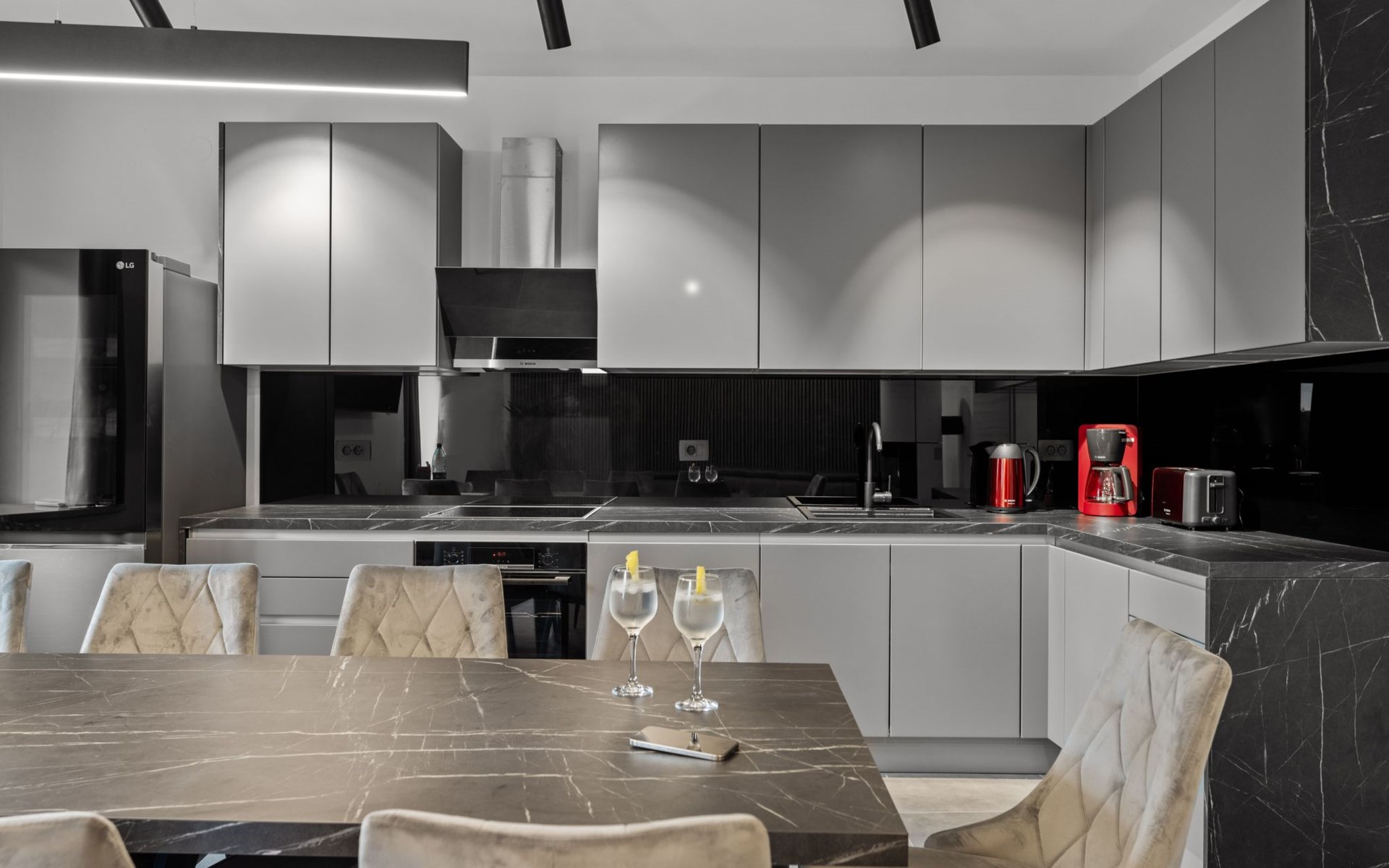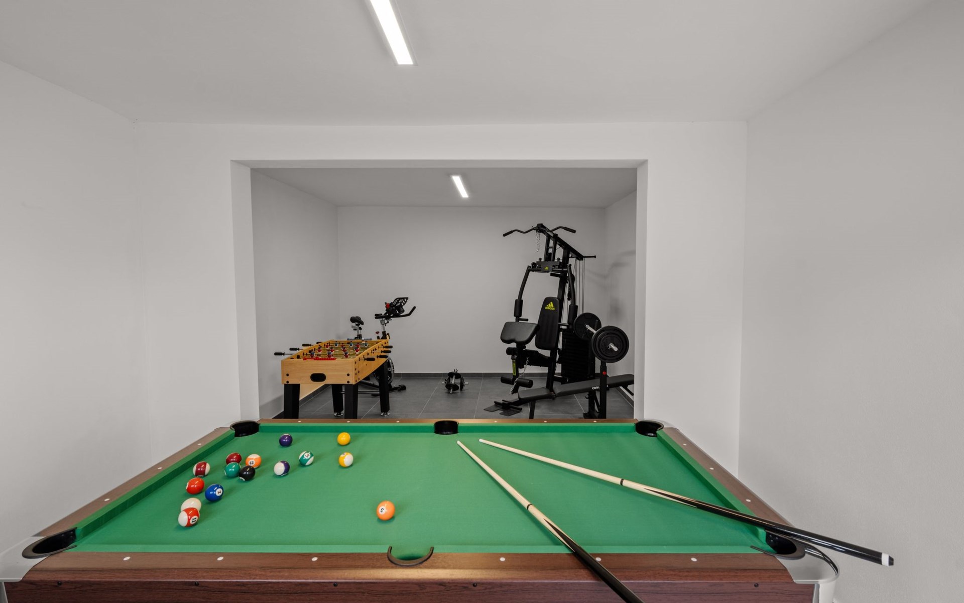 Insgesamt verfügt die Villa über vier elegante Schlafzimmer. Zwei dieser Schlafzimmer bieten den Luxus von ensuite Badezimmern, während insgesamt drei moderne Badezimmer für maximalen Komfort sorgen. Im Erdgeschoss finden Sie eine Indoor Grillküche, die perfekt für kulinarische Abende geeignet ist. Für Unterhaltung und Spaß sorgt ein Spielzimmer mit Billard- und Tischfußballtisch.
