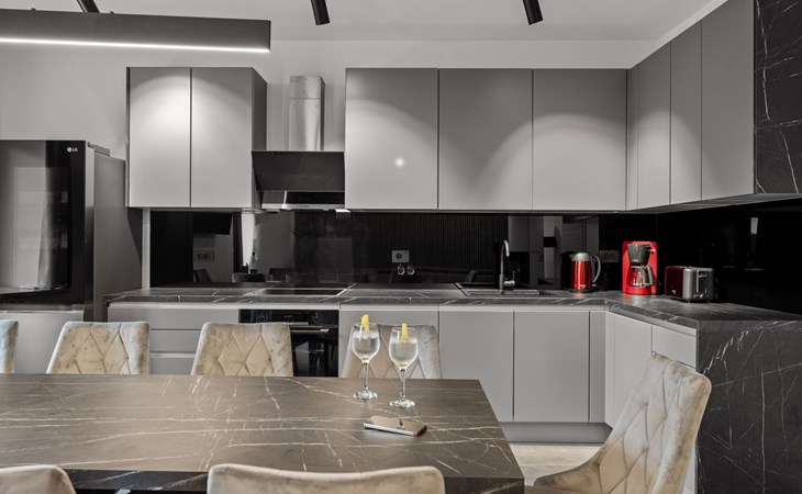 Beim Betreten der Villa erwartet Sie ein großzügiger Wohn-Essbereich im Obergeschoss, der mit einer modernen, voll ausgestatteten Küche und einem großen Esstisch für gesellige Abende mit Familie und Freunden ausgestattet ist. Das stilvoll eingerichtete Wohnzimmer mit einem gemütlichen Schwedenofen lädt zum Entspannen ein. Eine große, geräumige Doppelschlafcouch bietet zusätzlichen Platz für zwei Gäste.