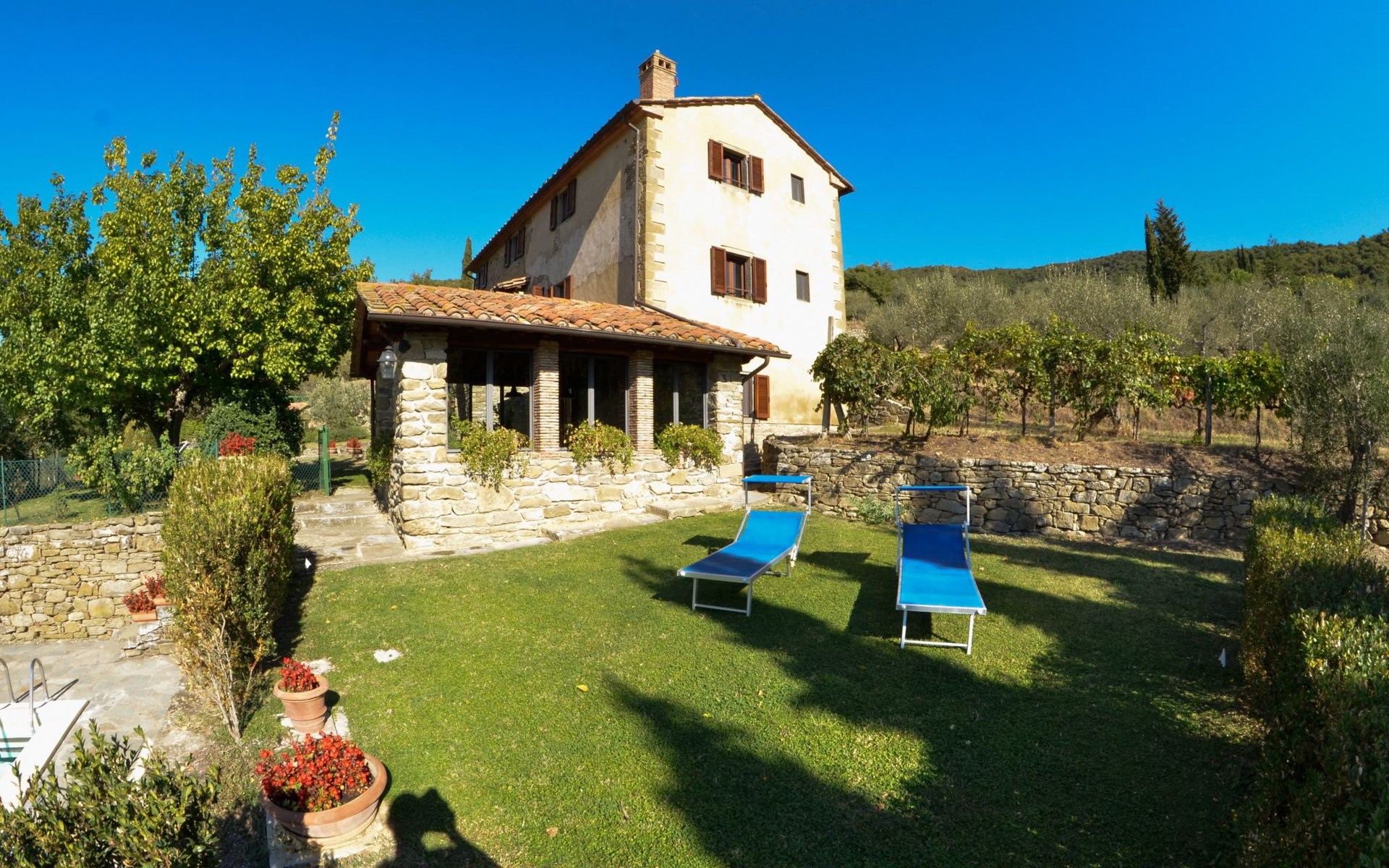 Der große Garten, der die Villa umgibt, ist mit Möbeln ausgestattet, die zum Entspannen an der frischen Luft einladen; die Fassade wird durch einen großen und funktionellen Zitronenhain bereichert, der ideal ist, um exzellente Abendessen zu genießen, während der schöne Swimmingpool an heißen Sommertagen Abkühlung bietet und einen bezaubernden Blick auf die Weinberge, die Olivenhaine und die Schauplätze der historischen Schlacht von Trasimeno zwischen dem karthagischen Anführer Hannibal und den Römern bietet. Völlig unabhängig, aber nicht isoliert, bietet Villa Eugenio die Möglichkeit, Geschäfte und Restaurants in wenigen Autominuten zu erreichen und ist ein hervorragender Ausgangspunkt für Naturliebhaber, die angenehme Ausflüge in die Natur unternehmen können.