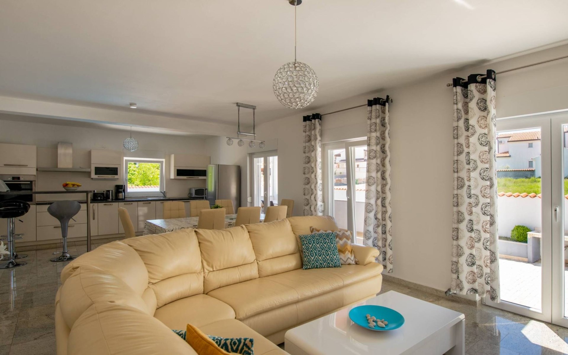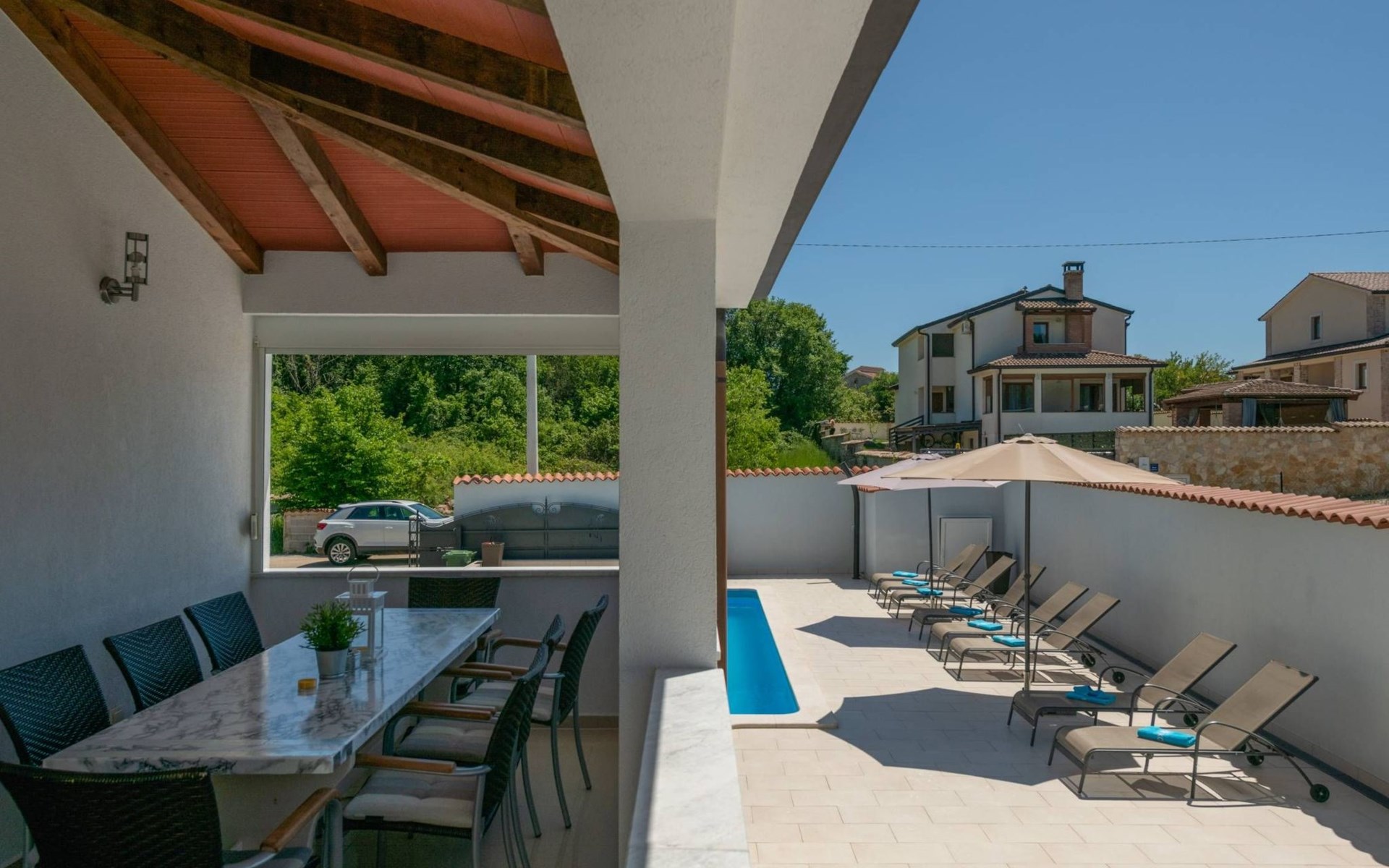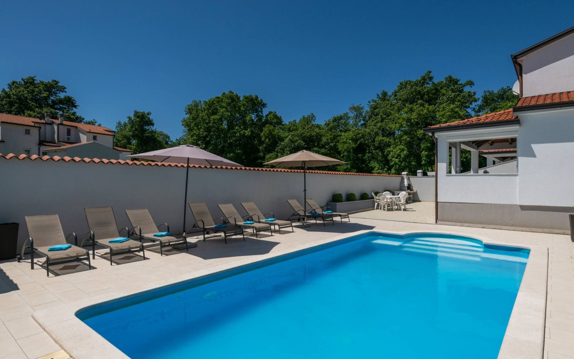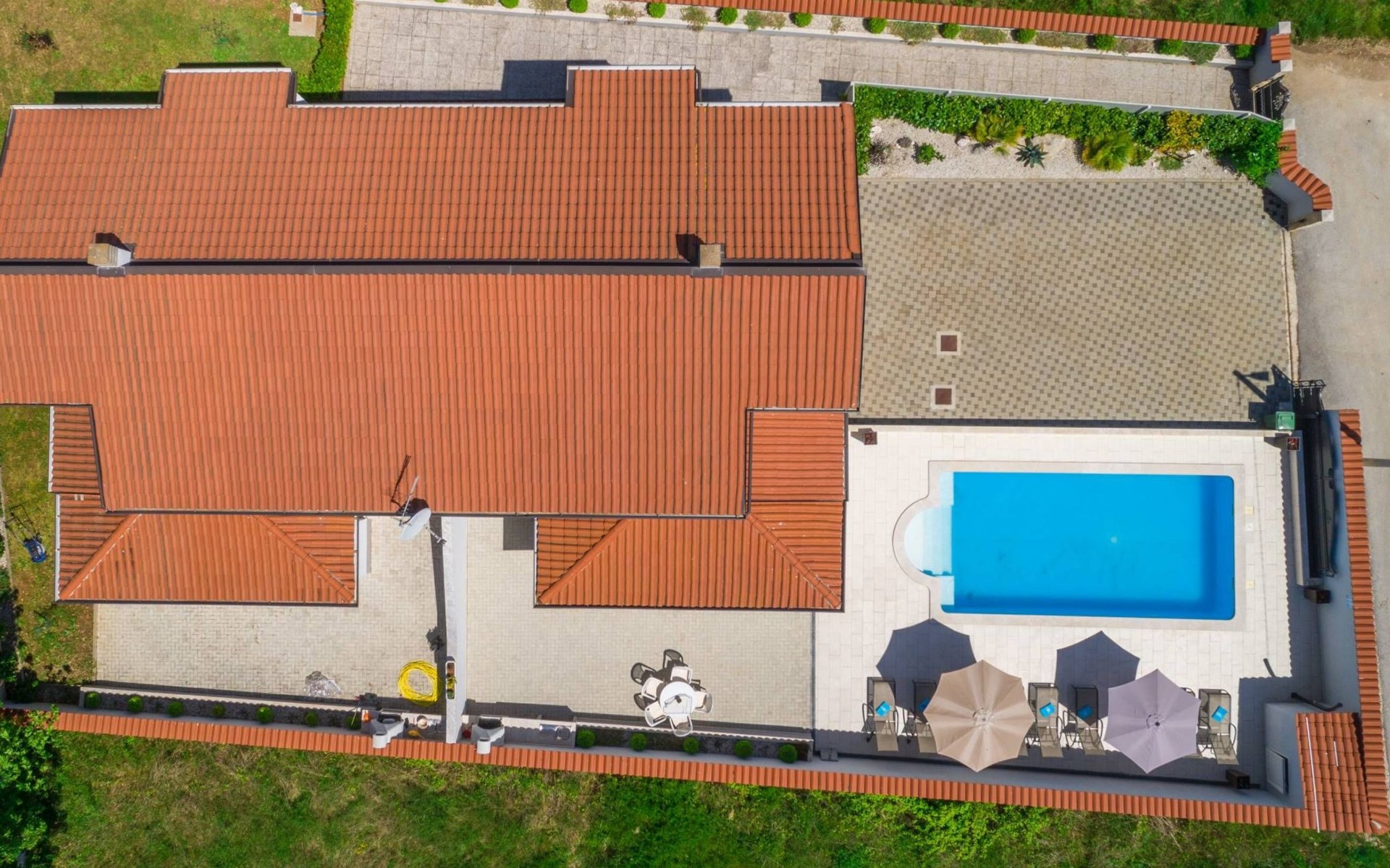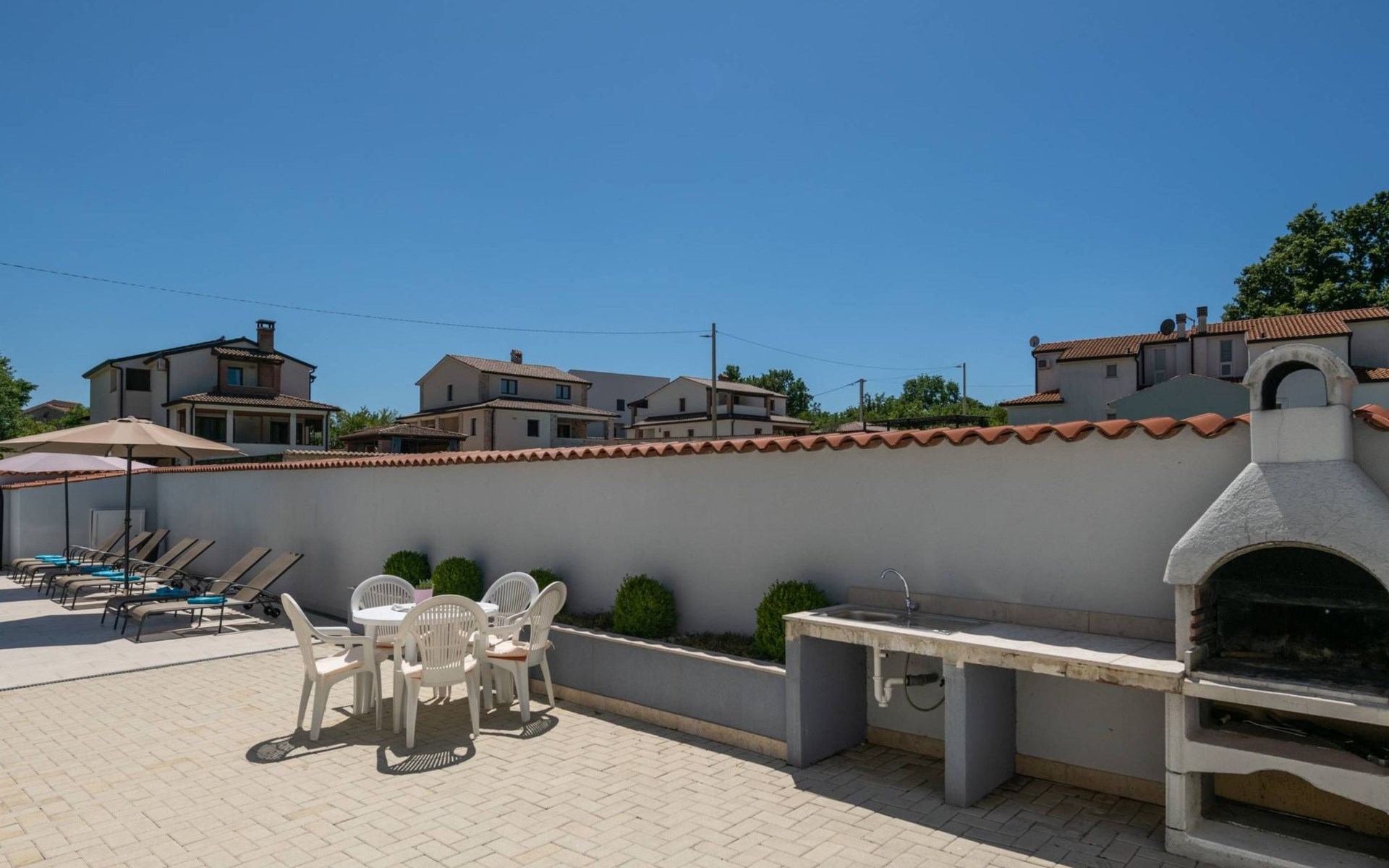 Im Innenhof gibt es eine Terrasse mit einem Außenkamin und einem großen Tisch. Die Rückseite des Hauses hat einen separaten Eingang, in dem gelegentlich der Eigentümer des Gebäudes wohnt. Der Eigentümer hat keinen Zugang zum Innenhof und Pool der Villa Ellen Sophie.