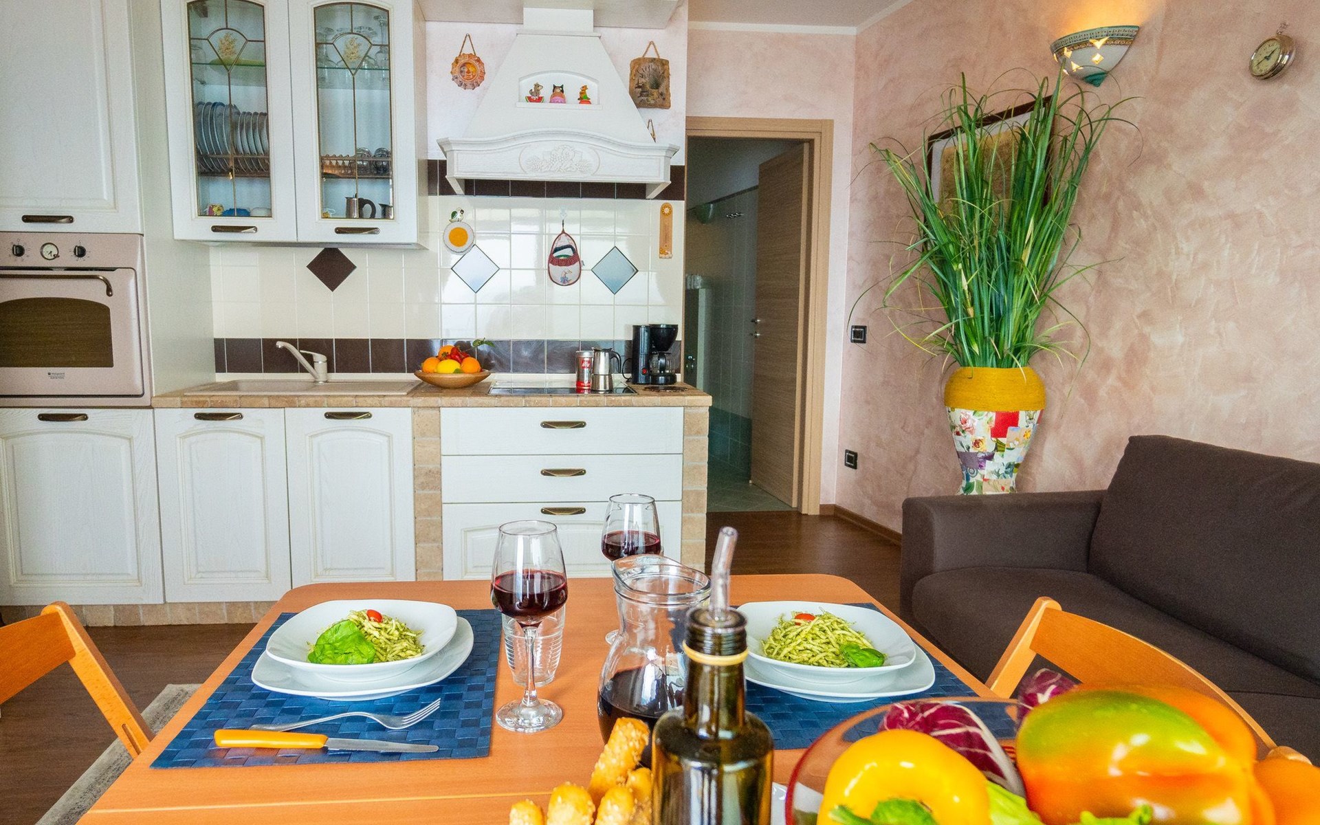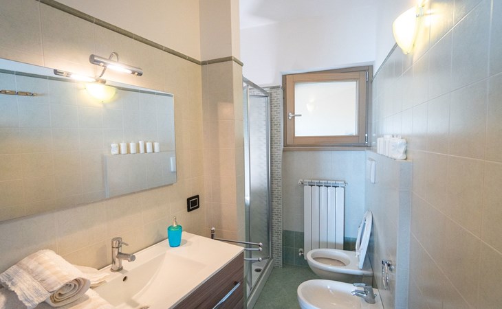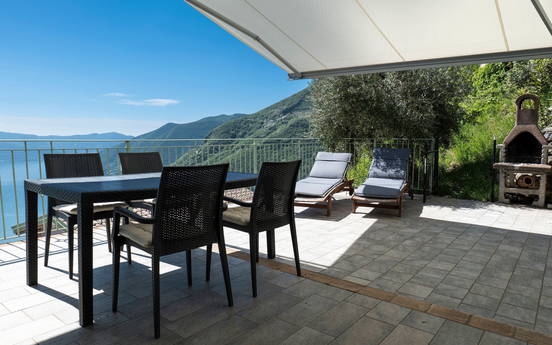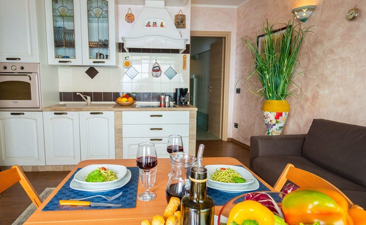 Draußen ist der Garten mit einem gemauerten Grill, einem Entspannungstisch und zwei aufeinander abgestimmten Liegestühlen mit elektrischem Sonnenschirm ausgestattet, der die gesamte Veranda bedecken kann; innen in einem abgewohnten umfeld verfügt das wohnzimmer über einen großen kühlschrank mit gefrierfach, Einbauküche mit Induktionsherd, Backofen, Mikrowelle, Toaster, Wasserkocher und Mokka, ein schlafsofa und einen tisch mit Panoramablick aus dem großen Fenster; Es gibt eine Waschmaschine. Das Hauptschlafzimmer ist gut ausgestattet mit Kleiderschränken und Nachttischen und zeichnet sich durch das lebhafte Blau der Wand hinter dem Bett aus. Im Badezimmer hängen die Sanitärarmaturen, die Heizung erfolgt über Radiatoren. Es gibt eine große Garage mit Aufzug zum Boden.