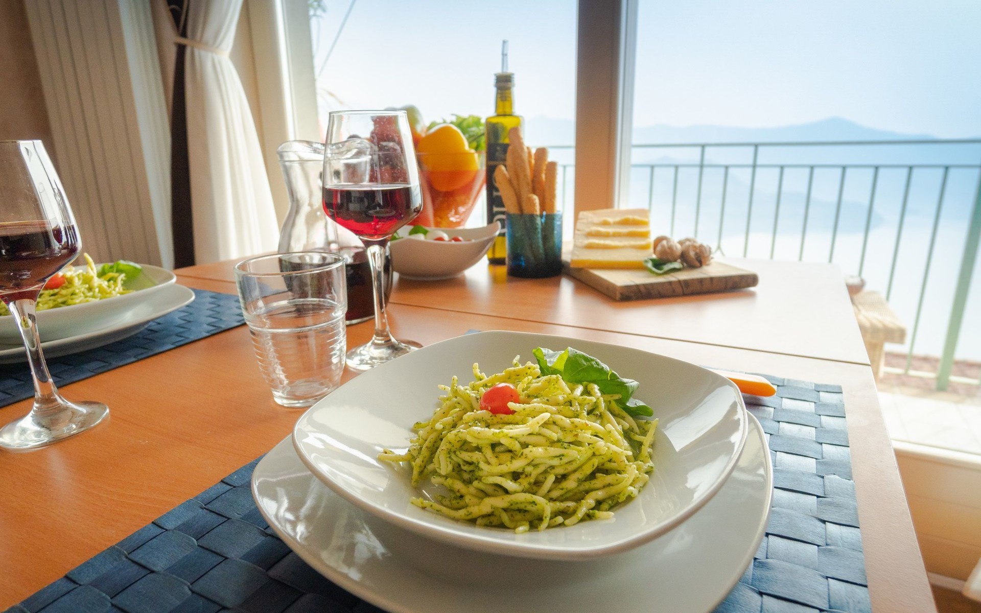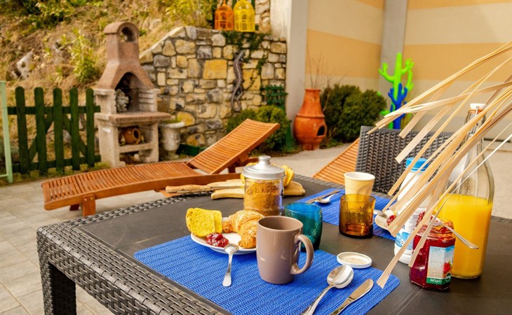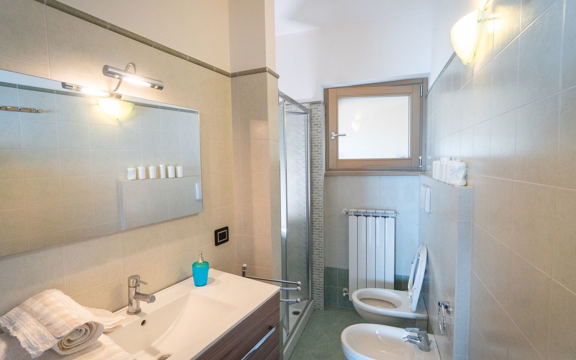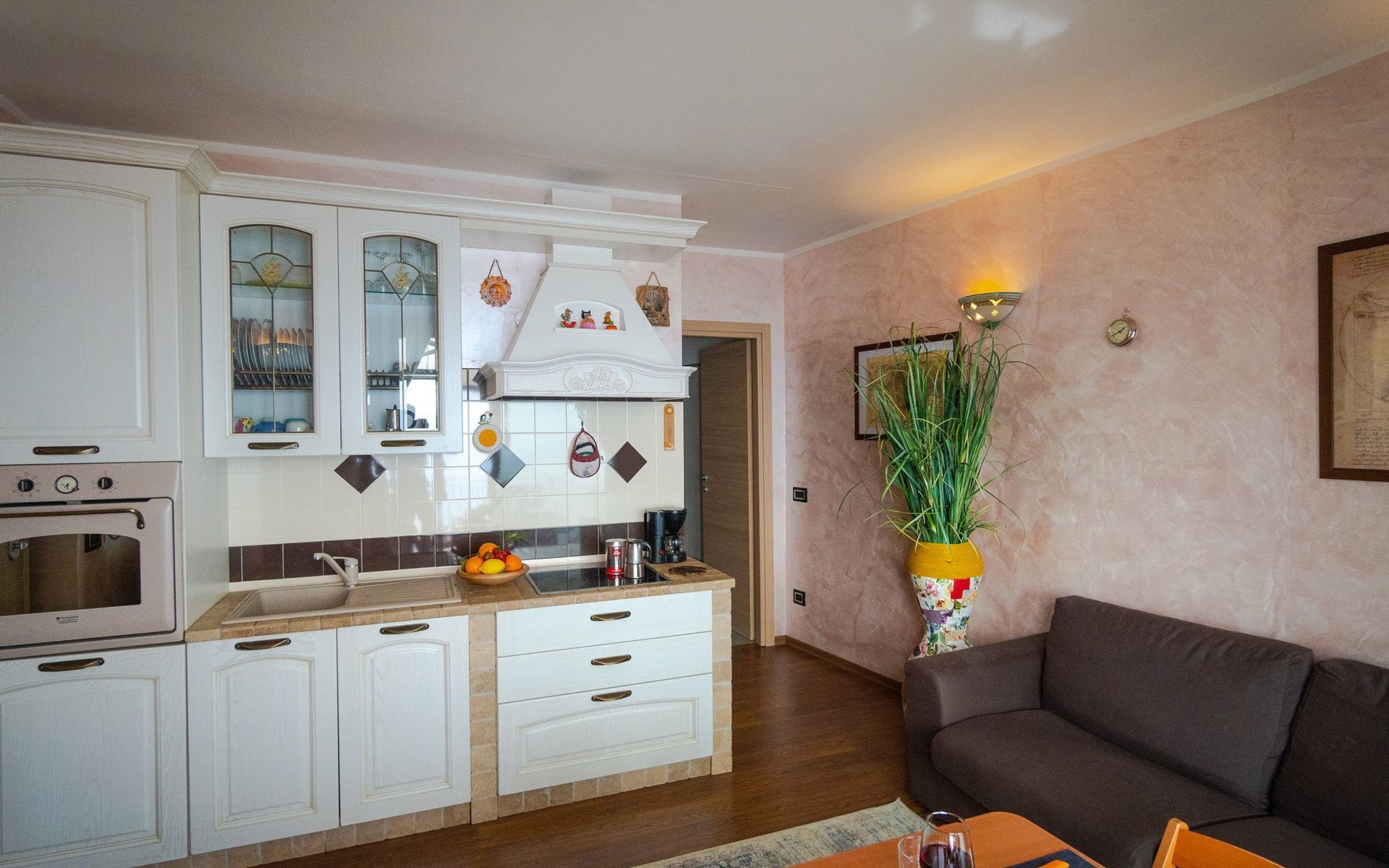 Draußen ist der Garten mit einem gemauerten Grill, einem Entspannungstisch und zwei aufeinander abgestimmten Liegestühlen mit elektrischem Sonnenschirm ausgestattet, der die gesamte Veranda bedecken kann; innen in einem abgewohnten umfeld verfügt das wohnzimmer über einen großen kühlschrank mit gefrierfach, Einbauküche mit Induktionsherd, Backofen, Mikrowelle, Toaster, Wasserkocher und Mokka, ein schlafsofa und einen tisch mit Panoramablick aus dem großen Fenster; Es gibt eine Waschmaschine. Das Hauptschlafzimmer ist gut ausgestattet mit Kleiderschränken und Nachttischen und zeichnet sich durch das lebhafte Blau der Wand hinter dem Bett aus. Im Badezimmer hängen die Sanitärarmaturen, die Heizung erfolgt über Radiatoren. Es gibt eine große Garage mit Aufzug zum Boden.