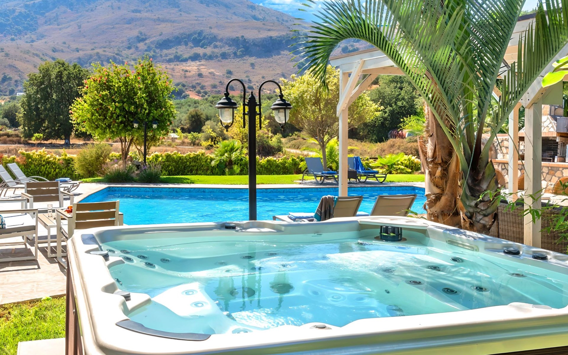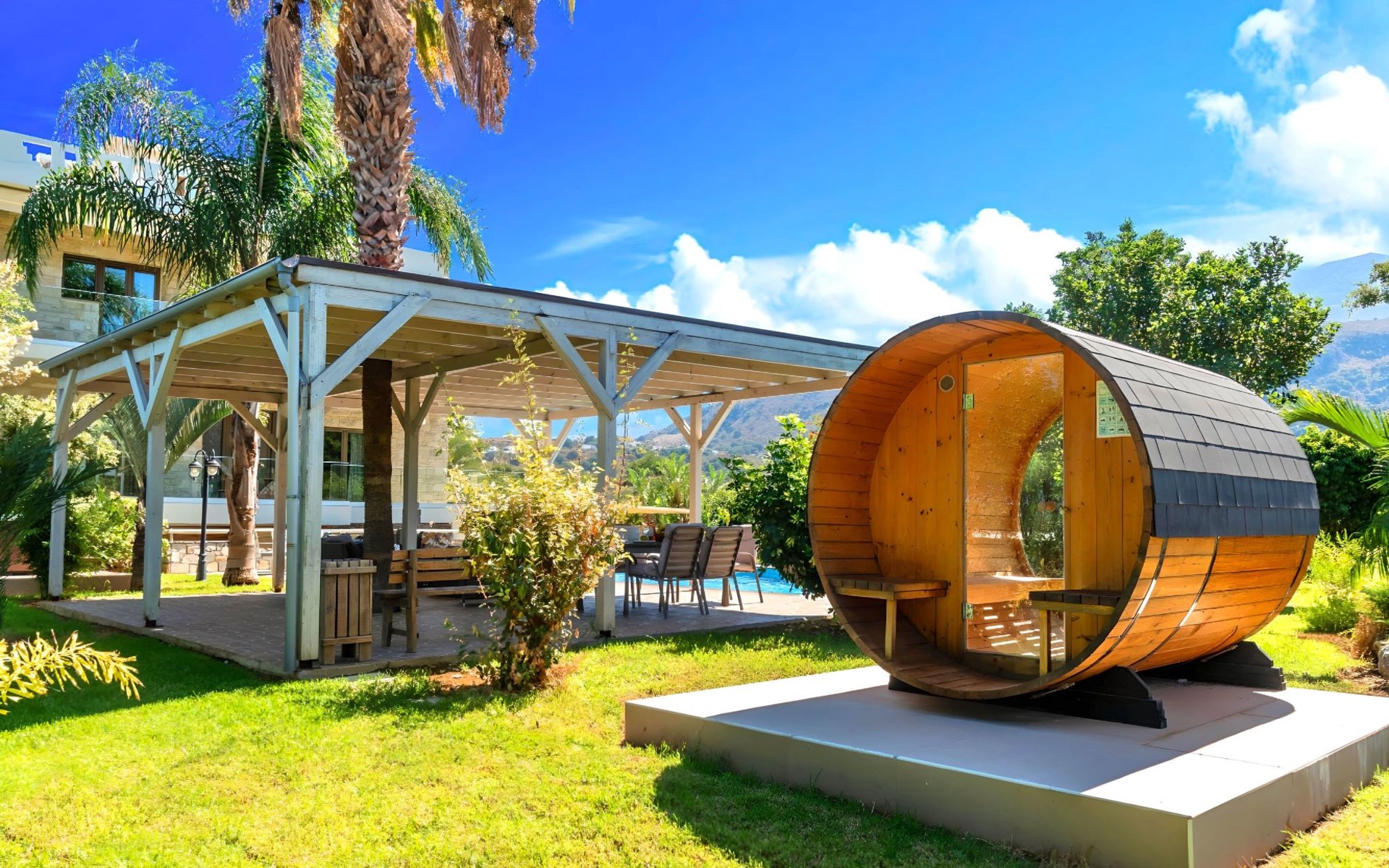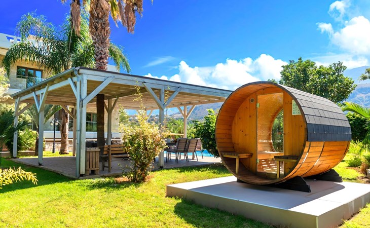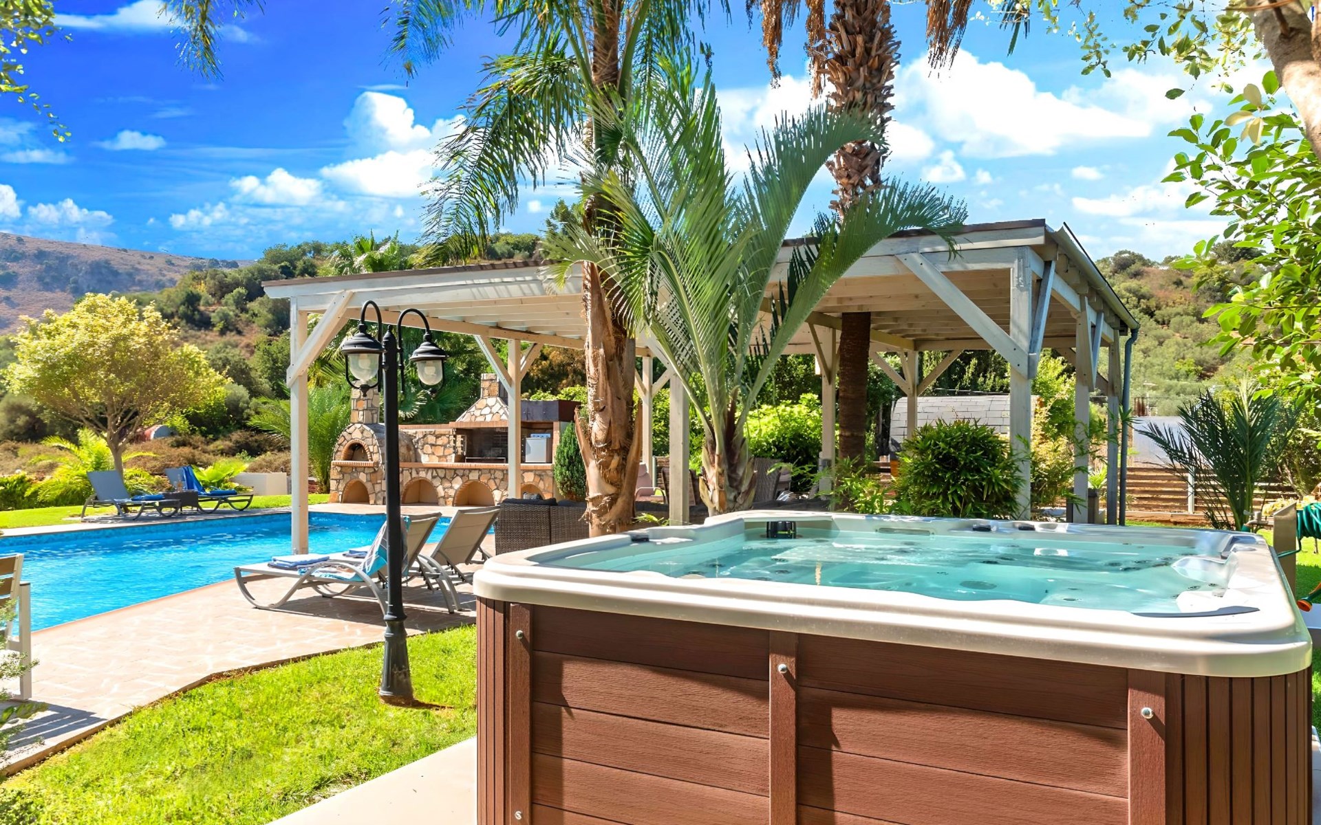 Der Außenbereich der Villa, der sich über ein 2000 m² großes Privatgrundstück erstreckt, ist so angelegt, dass er beeindruckt. Tauchen Sie ein in das schimmernde Wasser Ihres großen Privatpools, versammeln Sie sich um den großen Grillplatz für unvergessliche Mahlzeiten, und genießen Sie unvergessliche Familien- oder Gruppenessen unter dem Sternenhimmel im geräumigen Essbereich im Freien. Für Momente der puren Entspannung können Sie sich im beheizten Whirlpool oder in der Außensauna erholen, alles inmitten eines beeindruckenden Gartens und üppigen Geländes.