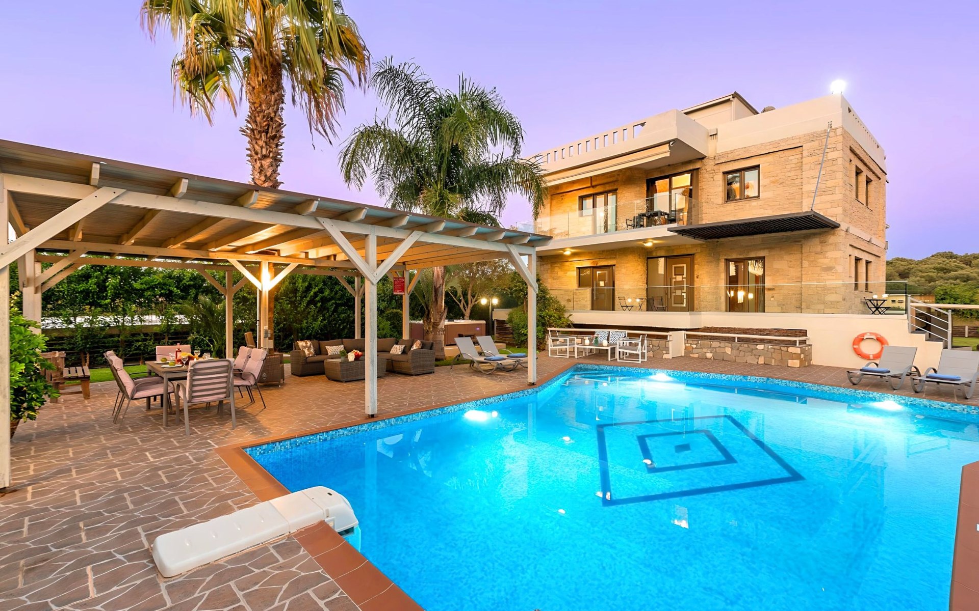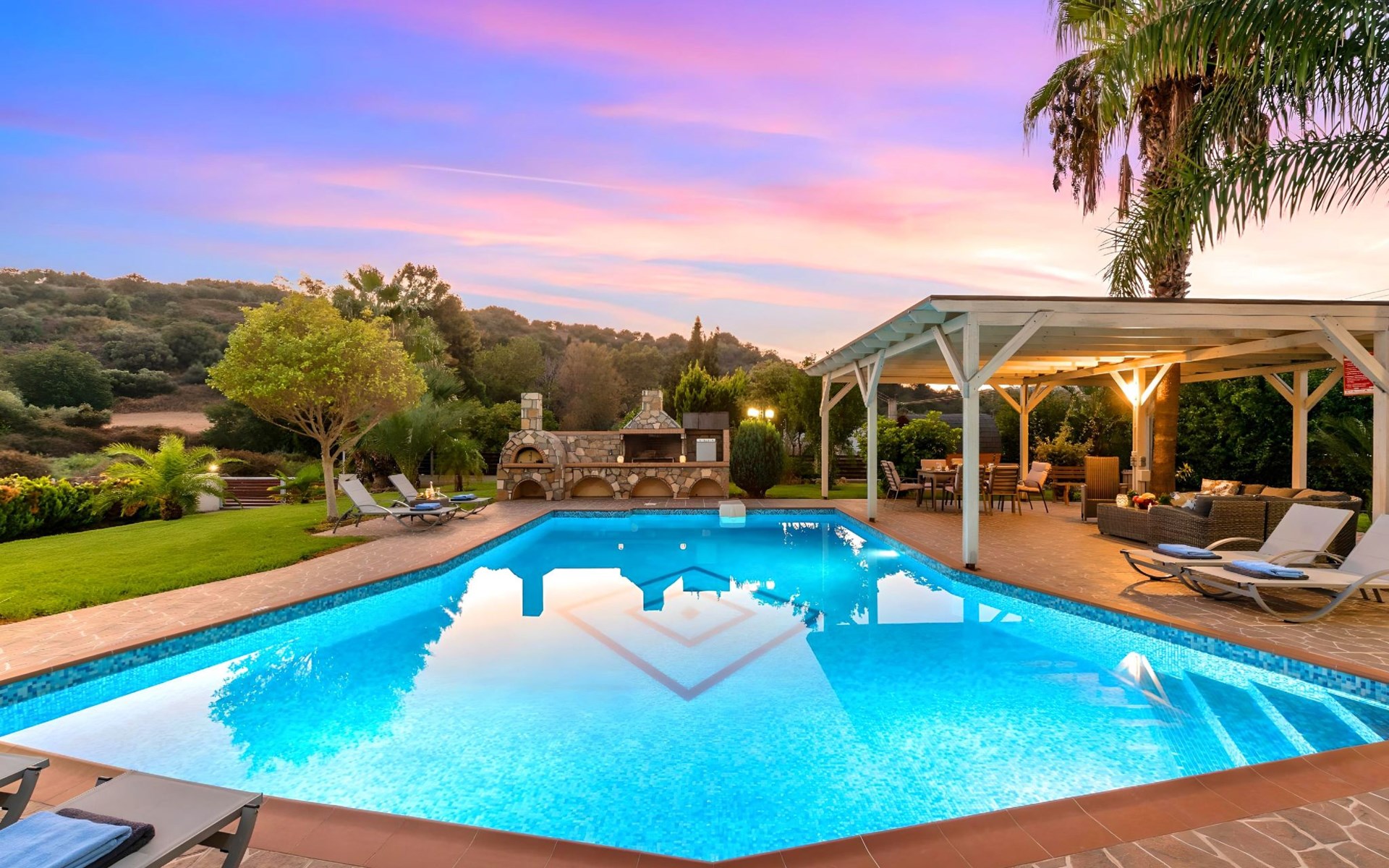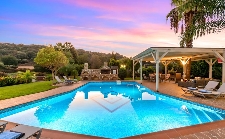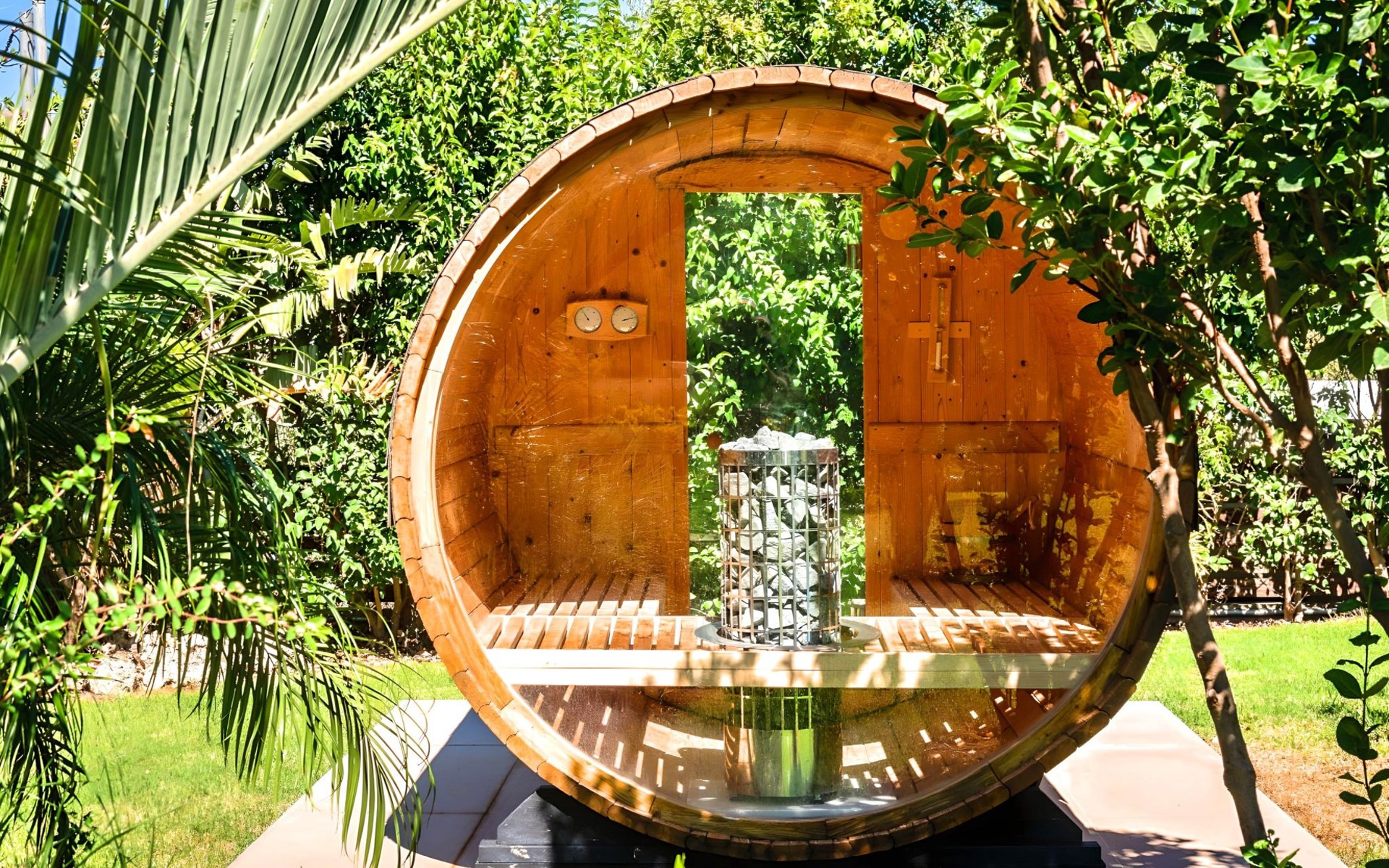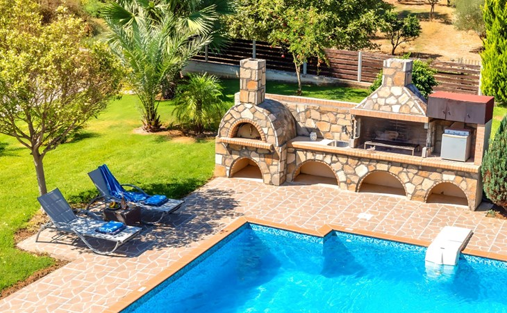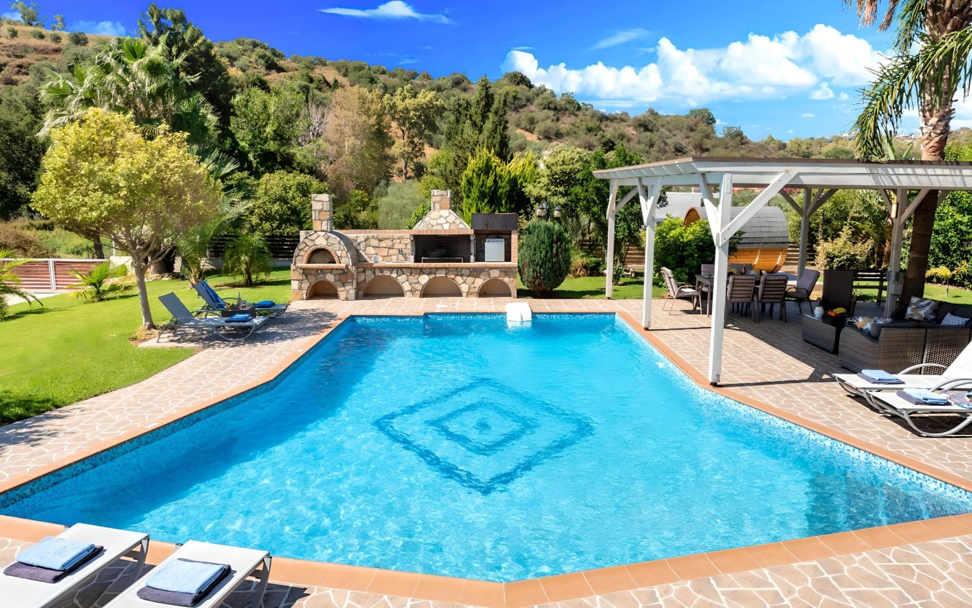 Der Außenbereich der Villa, der sich über ein 2000 m² großes Privatgrundstück erstreckt, ist so angelegt, dass er beeindruckt. Tauchen Sie ein in das schimmernde Wasser Ihres großen Privatpools, versammeln Sie sich um den großen Grillplatz für unvergessliche Mahlzeiten, und genießen Sie unvergessliche Familien- oder Gruppenessen unter dem Sternenhimmel im geräumigen Essbereich im Freien. Für Momente der puren Entspannung können Sie sich im beheizten Whirlpool oder in der Außensauna erholen, alles inmitten eines beeindruckenden Gartens und üppigen Geländes.