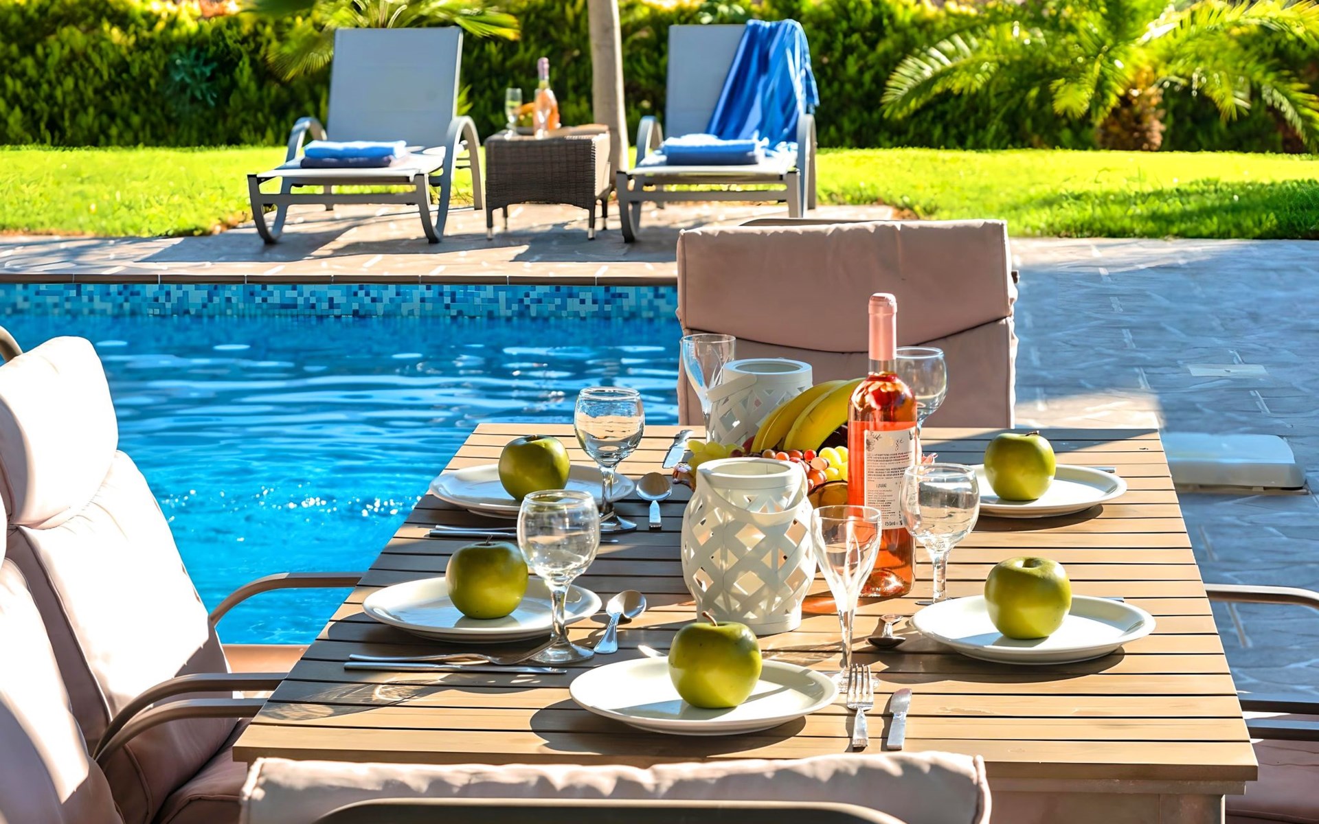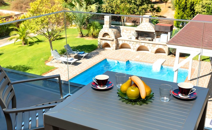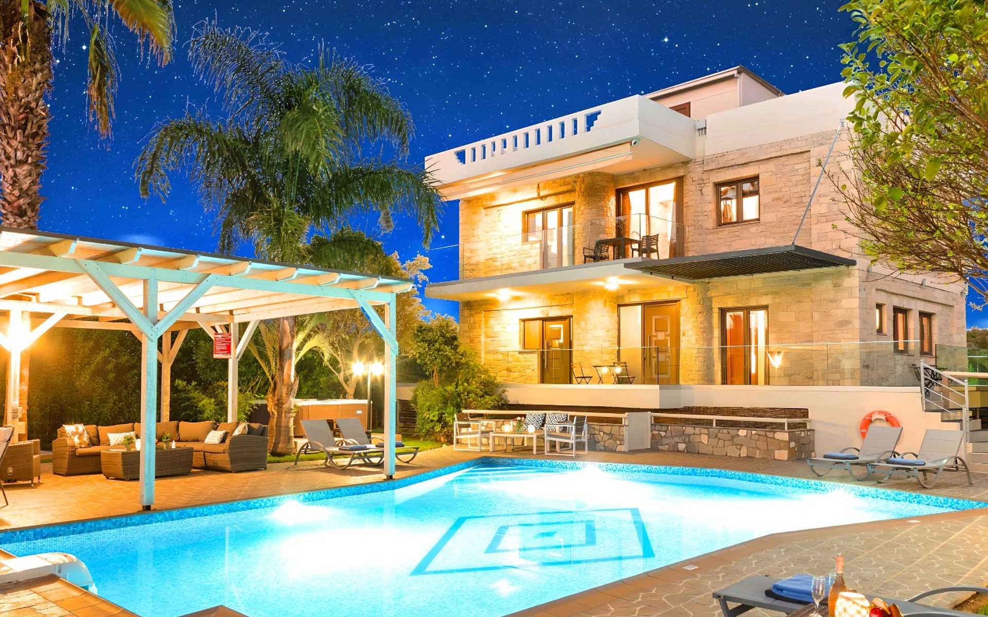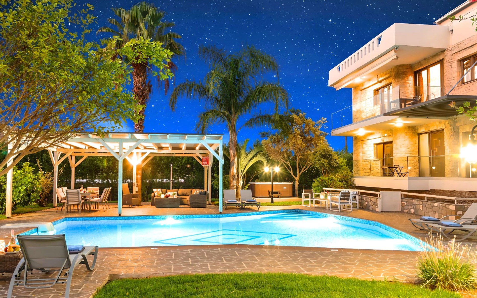 Der Außenbereich der Villa, der sich über ein 2000 m² großes Privatgrundstück erstreckt, ist so angelegt, dass er beeindruckt. Tauchen Sie ein in das schimmernde Wasser Ihres großen Privatpools, versammeln Sie sich um den großen Grillplatz für unvergessliche Mahlzeiten, und genießen Sie unvergessliche Familien- oder Gruppenessen unter dem Sternenhimmel im geräumigen Essbereich im Freien. Für Momente der puren Entspannung können Sie sich im beheizten Whirlpool oder in der Außensauna erholen, alles inmitten eines beeindruckenden Gartens und üppigen Geländes.