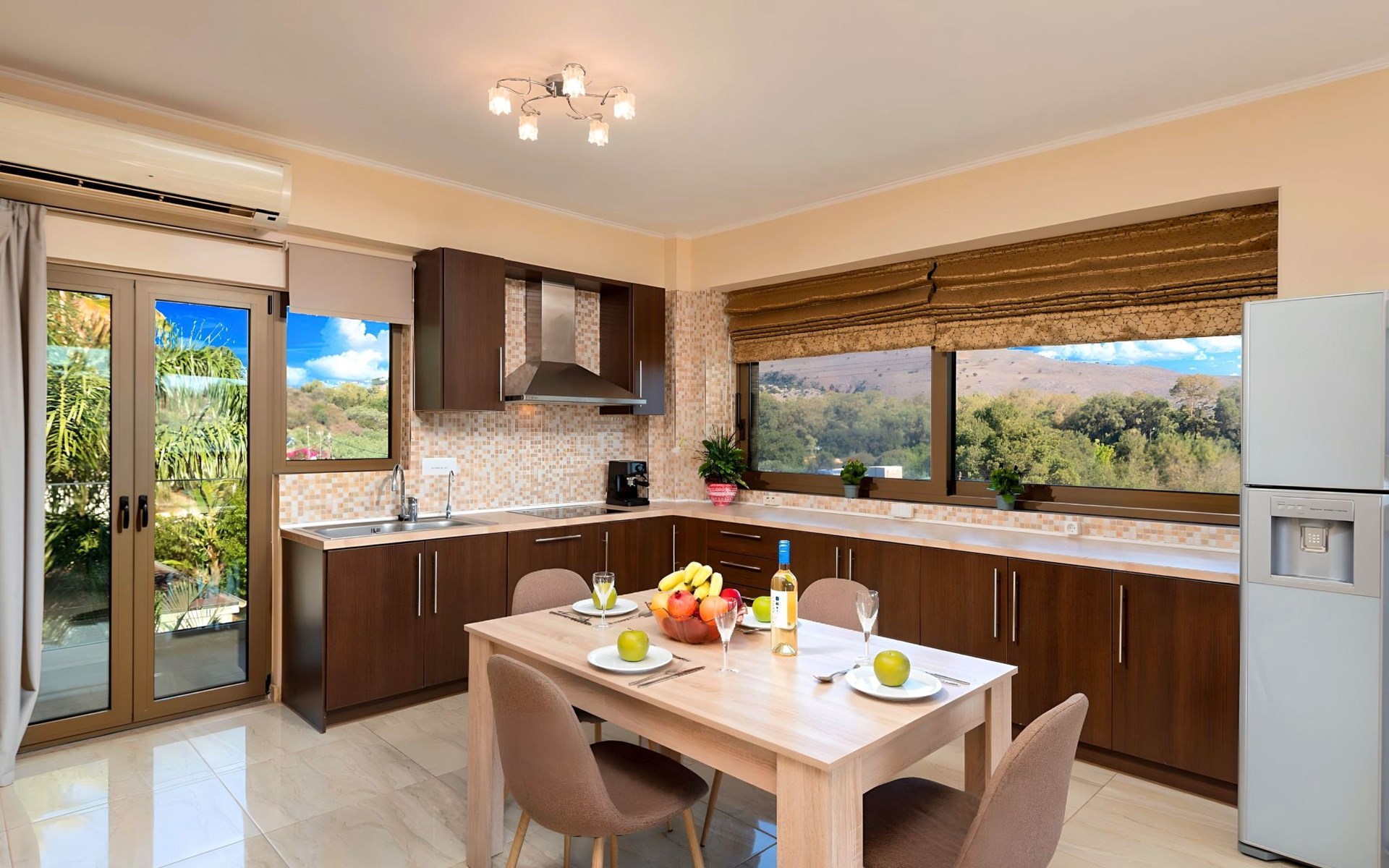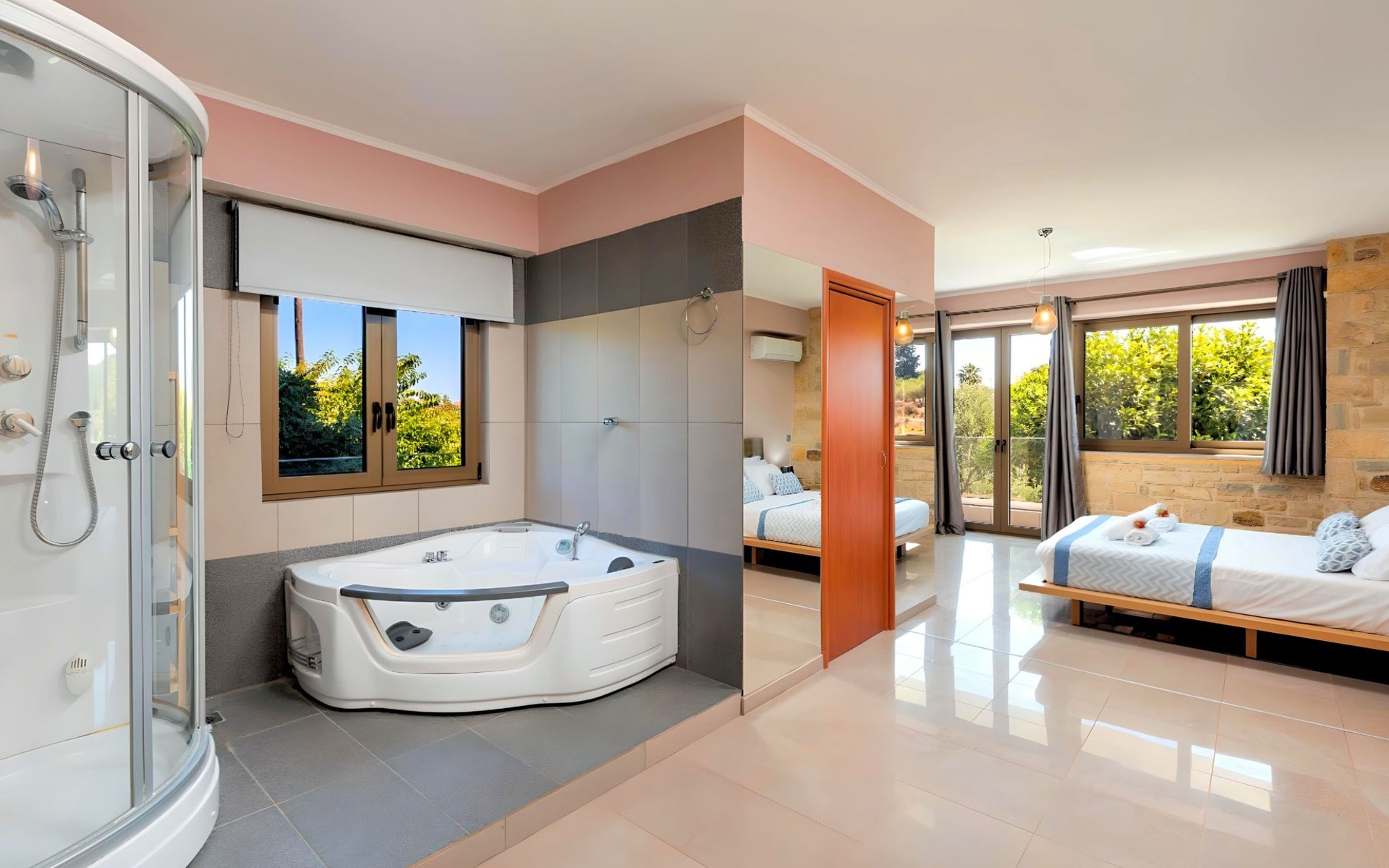 Im Inneren bietet die Villa zwei stilvoll gestaltete Etagen. Im Erdgeschoss befinden sich ein luxuriöses Hauptschlafzimmer mit eigenem Innenwhirlpool, ein zweites Schlafzimmer mit zwei gemütlichen Einzelbetten und ein bequemes Klappsofabett. Im Obergeschoss führt eine voll ausgestattete Küche in ein helles, geräumiges Wohnzimmer mit zusätzlichen ausklappbaren Schlafsofas, die Platz für weitere Gäste bieten. Das dritte Schlafzimmer bietet ein ruhiges Doppelbett mit einem weiteren Klappbett für ultimative Flexibilität.