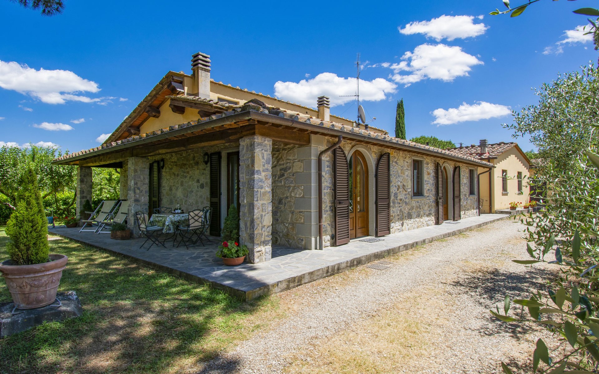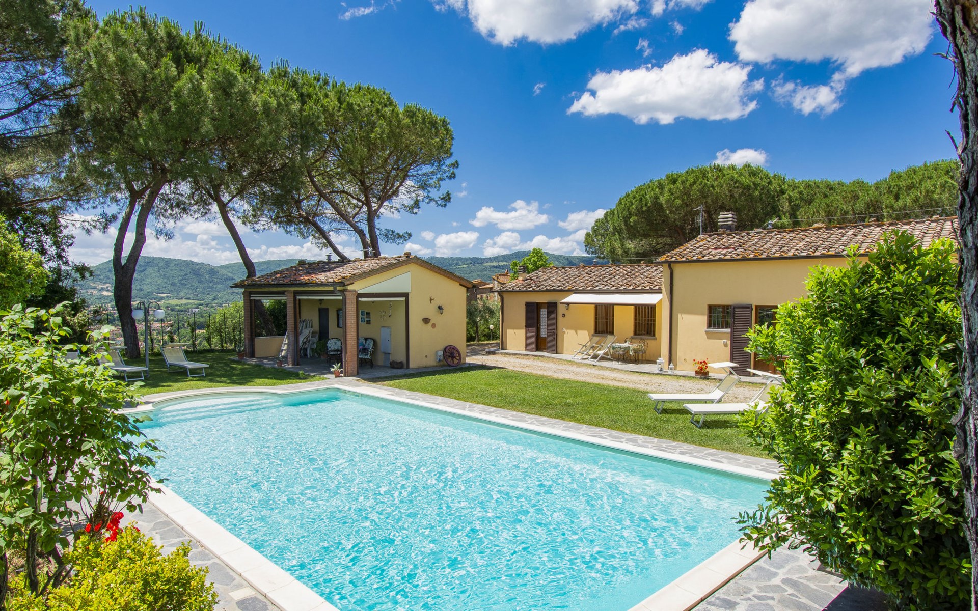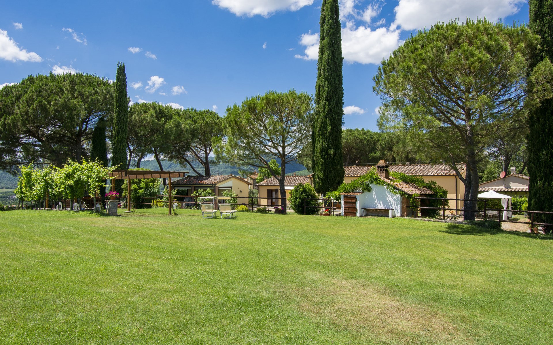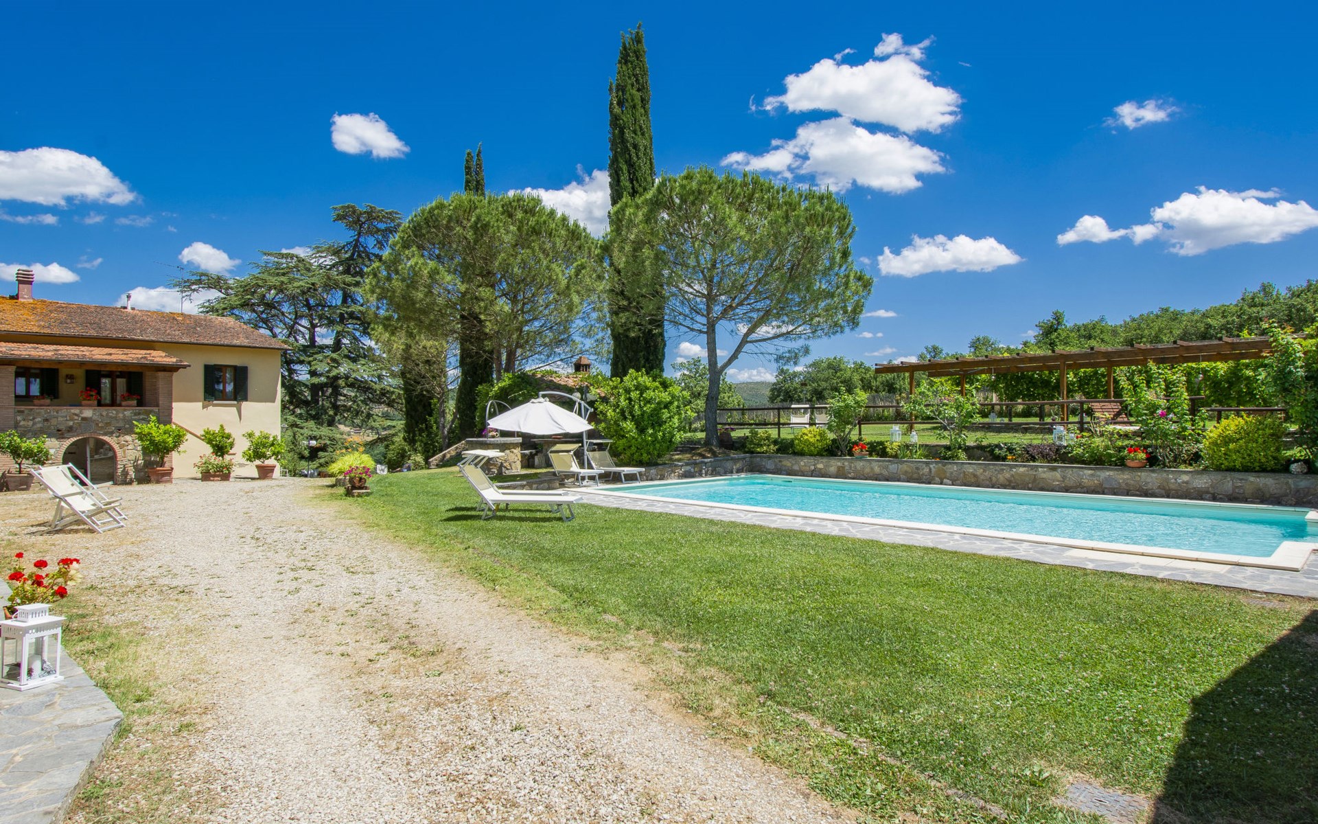Residenz "Cedri Alti", umgeben von Bäumen und Feldern. 4 Häuser in der Residenz. Oberhalb von Gavignano in Val d'Ambra, 5 km vom Zentrum von Bucine, 1 km vom Zentrum von Ambra, 32.5 km vom Zentrum von Arezzo, ruhige, erhöhte Lage. Zur Mitbenutzung: Grundstück 14 ha, Garten 6'000 m2 (eingezäunt) mit Rasen und Bäumen, Wiese, Obstgarten, Schwimmbad (12 x 6 m, 70 - 240 cm tief, saisonale Verfügbarkeit: 15.Apr. - 31.Okt. Öffnungszeiten Schwimmbad: 00:01-24:00). Aussendusche, Poolhaus, Tischtennis, Terrasse, Gartenmöbel, Grill. Im Hause: Tischtennis, Tischfussball. Parkplatz. Einkaufsgeschäft 1.4 km, Supermarkt 7 km, Bushaltestelle 500 m, Bahnstation "Bucine" 3 km, Sandstrand "Castiglione della Pescaia" 125 km, Freibad 1 km. Tennis 1 km, Reitstall 1 km. Nahe gelegene Sehenswürdigkeiten: Siena 40 km, Montepulciano 55 km, Firenze 65 km, Equestrian Center Arezzo 25 km. Bitte beachten: geeignet für Familien.