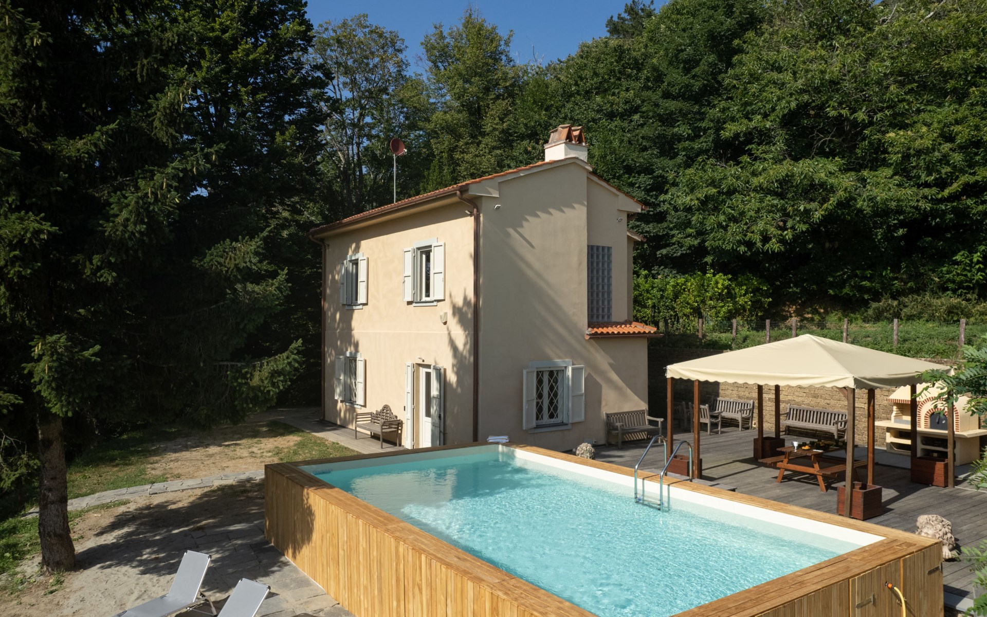 Freistehender Landsitz "Lucrecia", 720 m.ü.M., renoviert im Jahre 2023. 8.8 km vom Zentrum von Buti, 25 km vom Zentrum von Pisa, Lucca, 42 km vom Zentrum von Livorno, alleinstehende, ruhige, sonnige Lage auf einem Hügel, 40 km vom Meer, im Grünen. Zur Alleinbenutzung: Garten 500 m2, Aufstellpool (8 x 4 m, 140 cm tief, saisonale Verfügbarkeit: 01.Mai. - 30.Sep.). Gartenmöbel, Grill, Poolpflege durch den Besitzer/Gärtner. Im Hause: Zentralheizung, Heizung vor Ort zu zahlen, Heizung nur verfügbar von 01.Nov. - 04.Apr.. Holprige, steile, schmale Zufahrt bis 50 m zum Haus. Parkplatz auf dem Grundstück. Einkaufsgeschäft 10 km, Supermarkt 10 km, Restaurant 800 m, Bushaltestelle 6.5 km, Bahnstation 20 km, Sandstrand "Versilia" 48 km, Thermalbad "San Giuliano Terme" 17 km. Nahe gelegene Sehenswürdigkeiten: La Certosa di Calci 10 km, San Miniato 40 km, Lajatico 46 km, Volterra 64 km. Die letzten 50 m der Zufahrtsstraße nach dem Tor sind ein steiler, schmaler Pfad. Dieser letzte Straßenabschnitt ist für Fahrzeuge mit geringer Höhe nicht zu empfehlen.