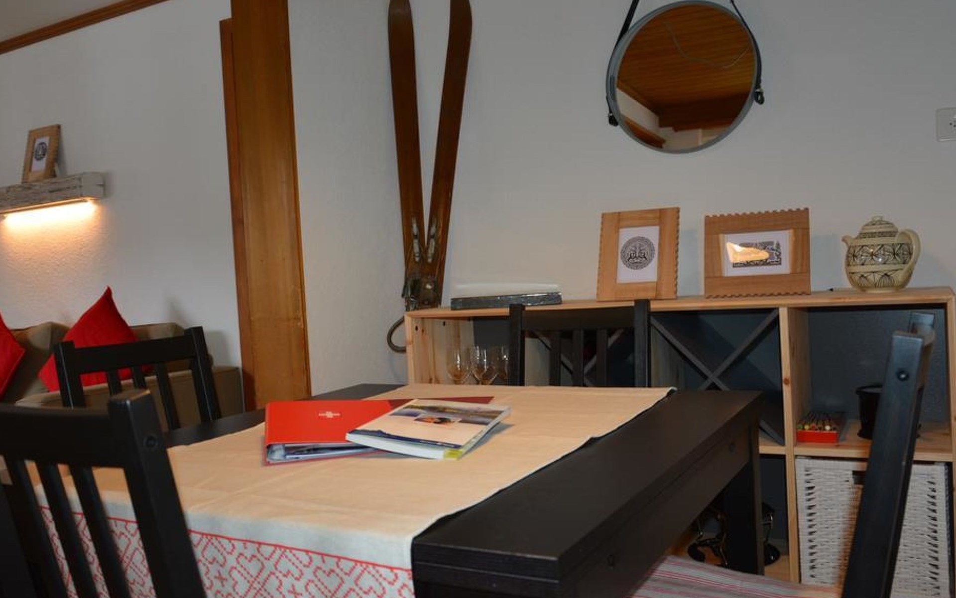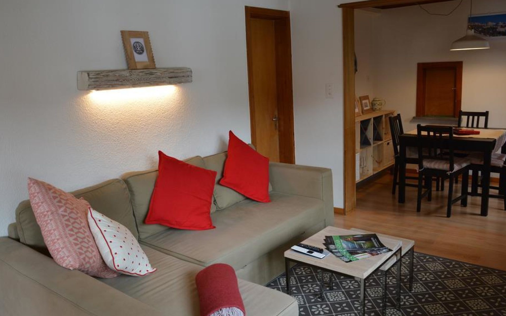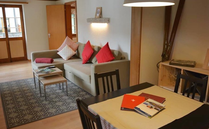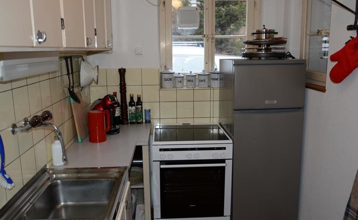 Wohn-/Esszimmer mit Sofa (ausziehbar für 2 Personen, 140x200cm), Salontisch, Esstisch und Flachbildschirm-TV. WiFi. Kleine, einfach eingerichtete Küche mit Kapsel-Kaffeemaschine (Nespresso). 1 Schlafzimmer mit Doppelbett (2x90x190cm). 1 Badezimmer mit Dusche/WC. Gartensitzplatz mit Gartenmöbeln. Kinderbett (70x140cm) inkl. Bettwäsche vorhanden.