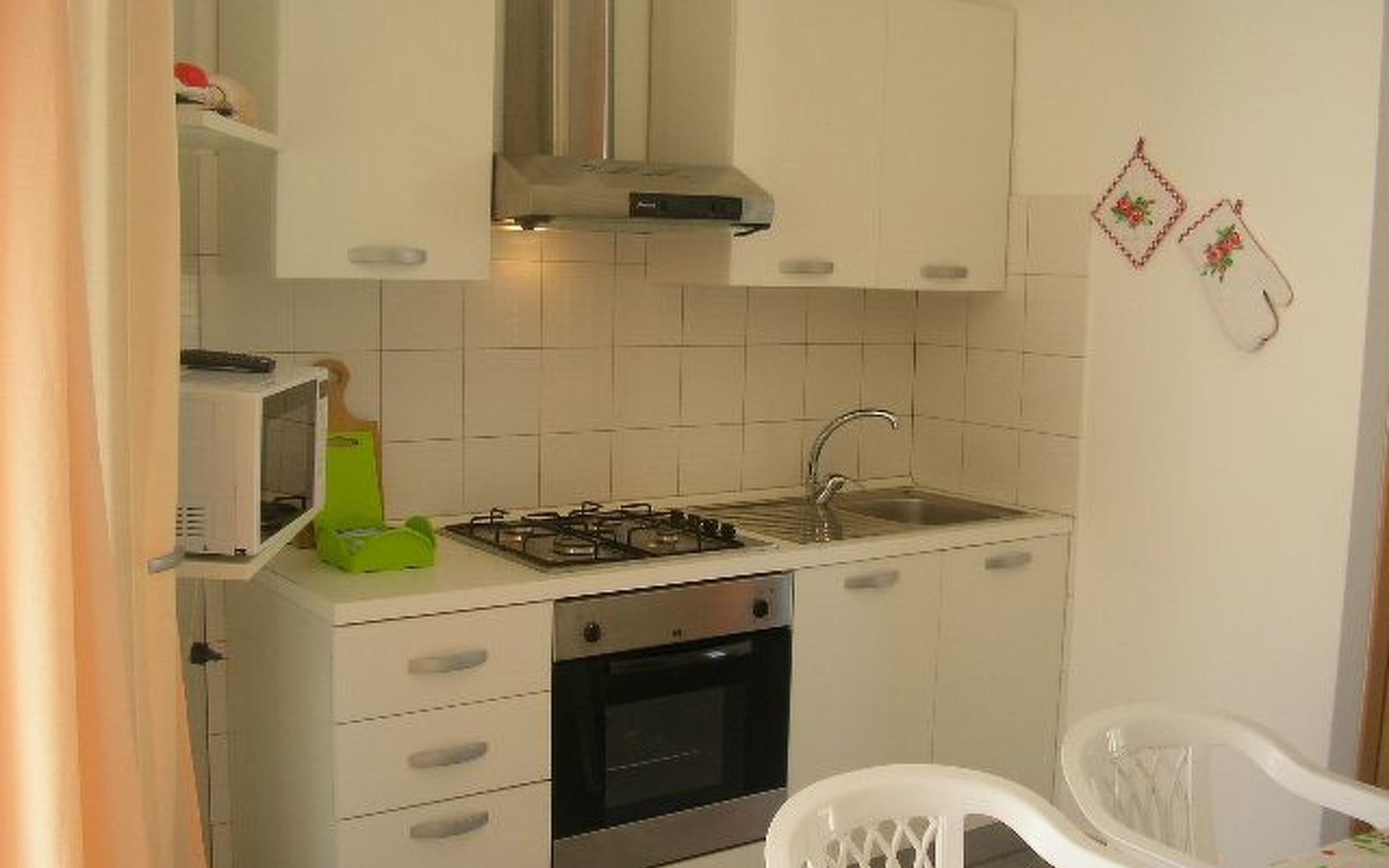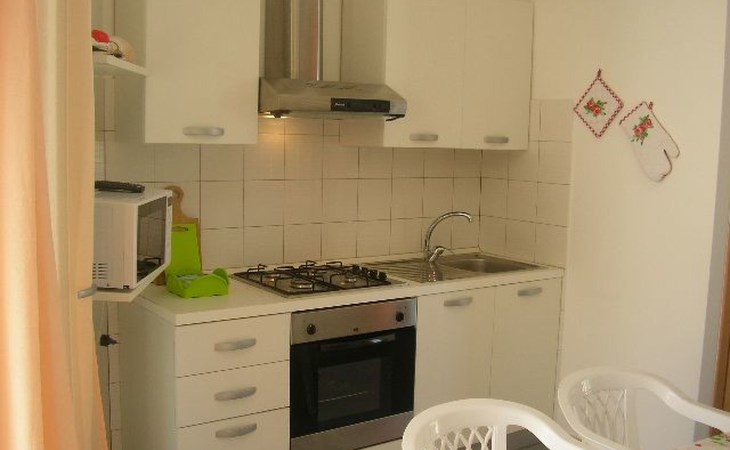 Die Villa besteht aus zwei Schlafzimmern: eines mit einem Doppelbett und einem Etagenbett (für 4 Personen), das andere mit zwei Einzelbetten, einer Wohnküche, einem Badezimmer und einem Balkon auf der Rückseite mit Waschgelegenheit. Vorne gibt es eine Terrasse mit Tisch, Sesseln und Sonnenschirm. Es gibt einen Außenparkplatz, der durch ein Tor abgeschlossen ist. Es ist mit neuen Möbeln eingerichtet und verfügt über folgenden Komfort: Betten mit Holzlattenrost, Klimaanlage/Heizung in jedem Zimmer, Außendusche mit Warm-/Kaltwasser, Waschmaschine, eingebauter Safe, 32"-Satellitenfernseher Led und kostenloser Internetzugang, obwohl das Signal nicht sehr gut ist. Die Wohnküche ist mit einem Herd, einem elektrischen Ofen, einer Mikrowelle, einem Kühlschrank und einem Toaster ausgestattet und mit Sesseln möbliert.
