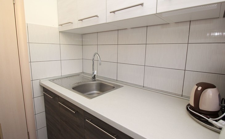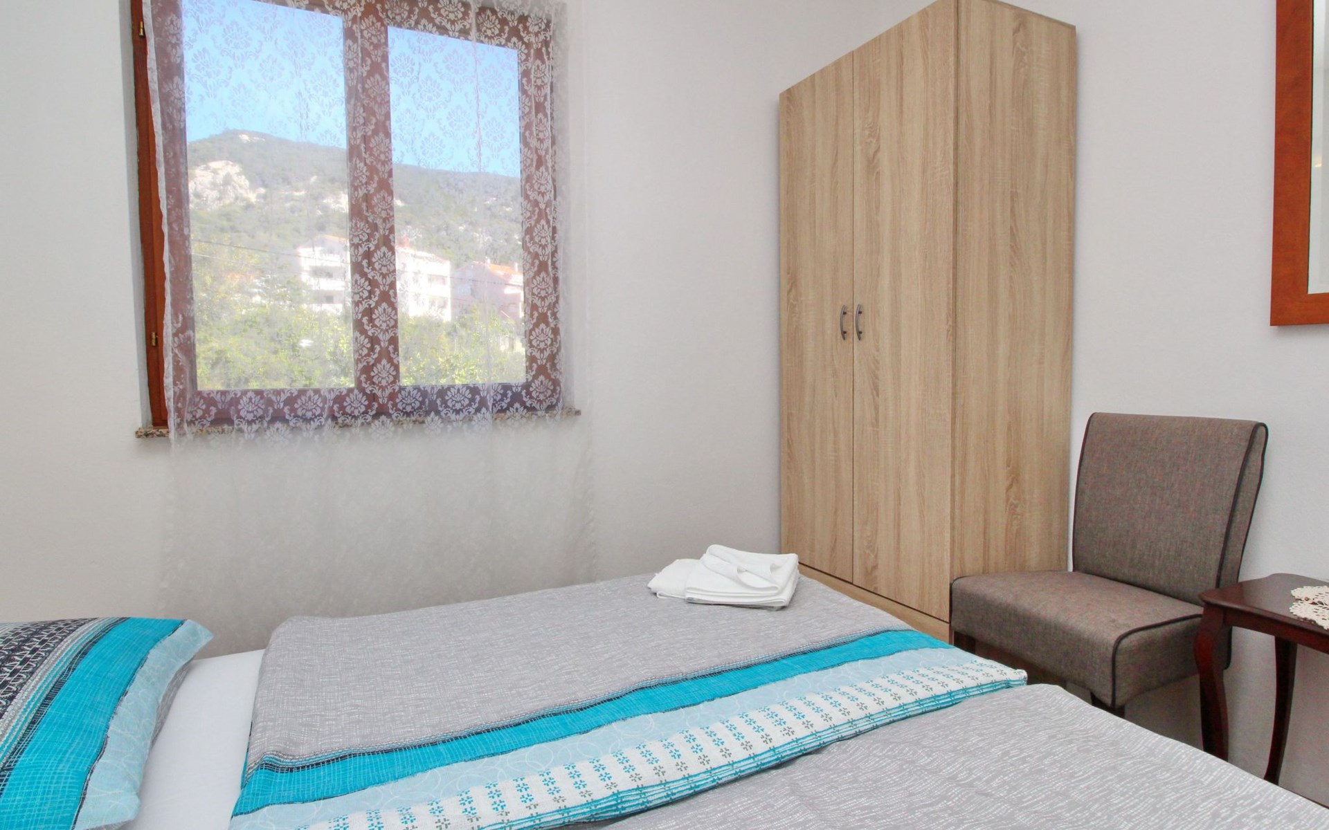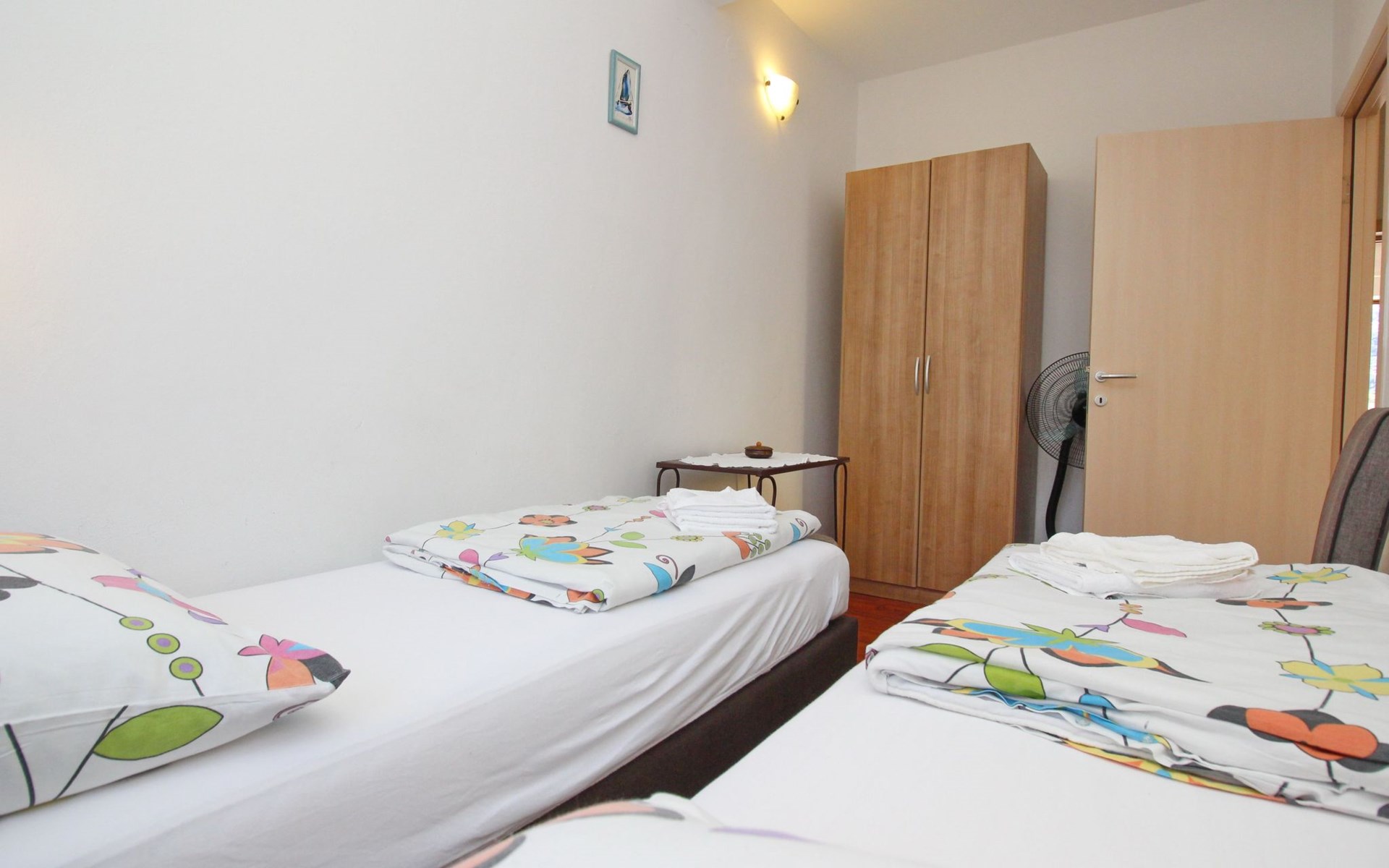 Im Inneren der Wohnung erwartet Sie eine praktische und einladende Einrichtung, die Ihren Aufenthalt komfortabel und unkompliziert macht. Die Wohnung befindet sich im ersten Obergeschoss und bietet zwei gemütliche Schlafzimmer sowie eine kombinierte Wohn- und Essbereich mit einer Schlafmöglichkeit auf einem bequemen Schlafsofa. Für alle Selbstversorger stehen zudem eine Kochnische mit Elektroherd, Kaffeemaschine und Kühlschrank sowie die notwendigen Geschirrtücher zur Verfügung. Dank der teilweisen Klimatisierung der Wohnung können Sie auch an den heißesten Tagen einen kühlen Rückzugsort genießen.