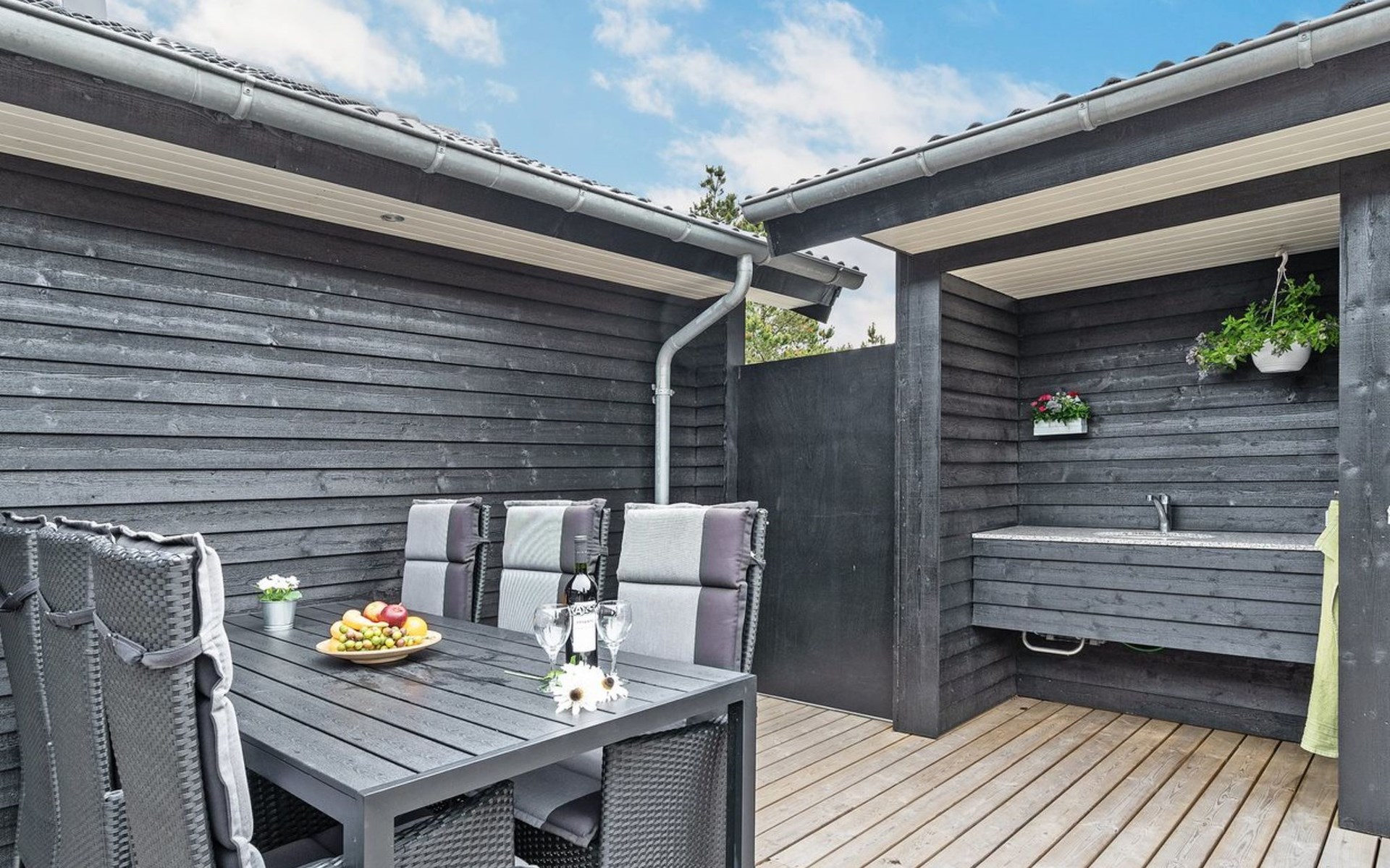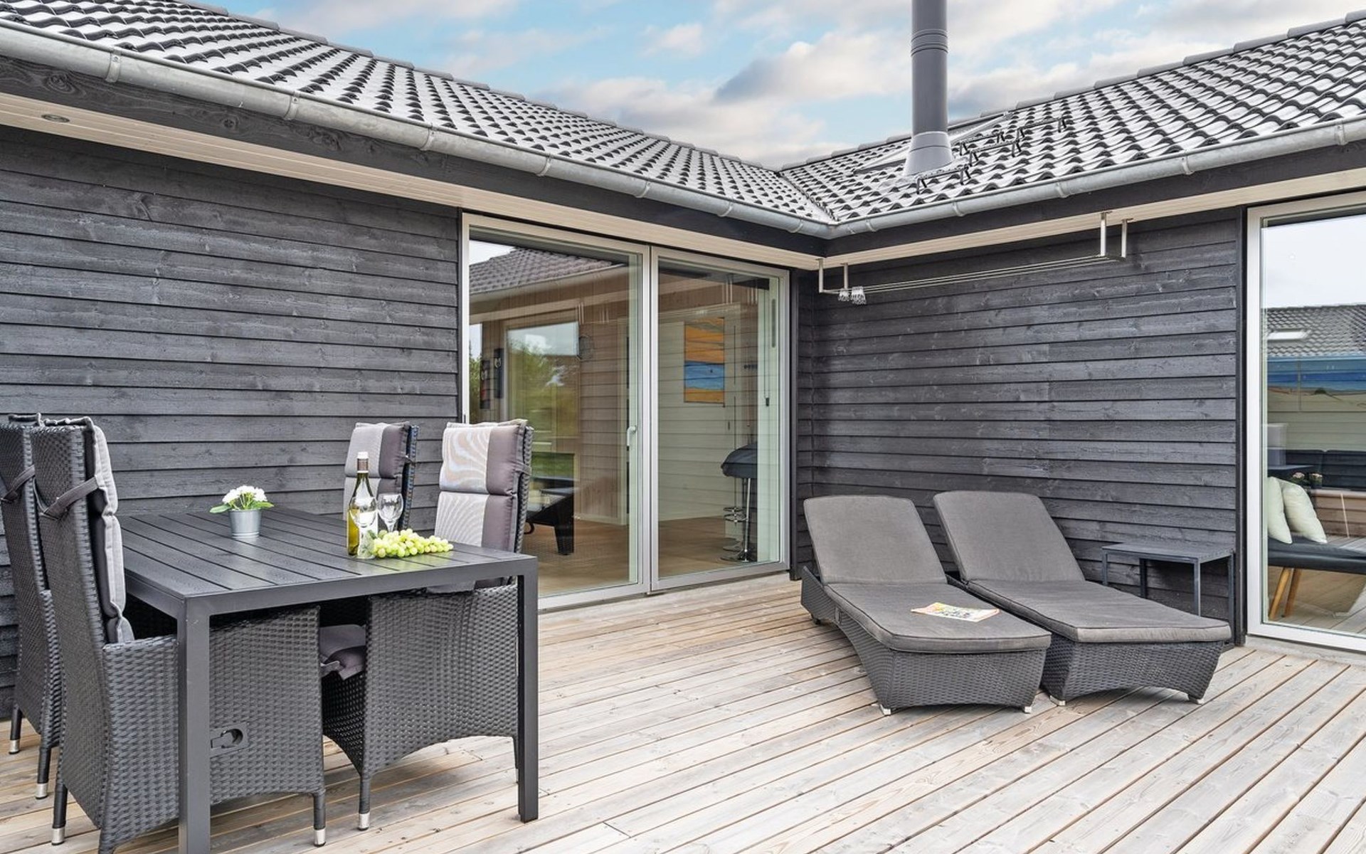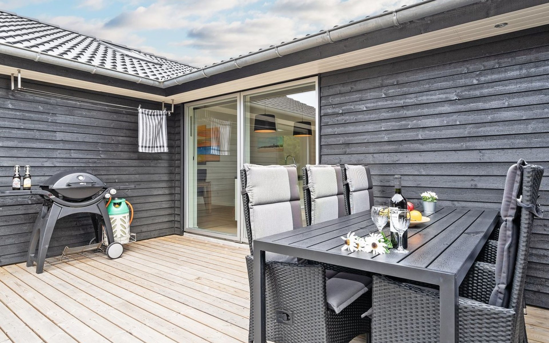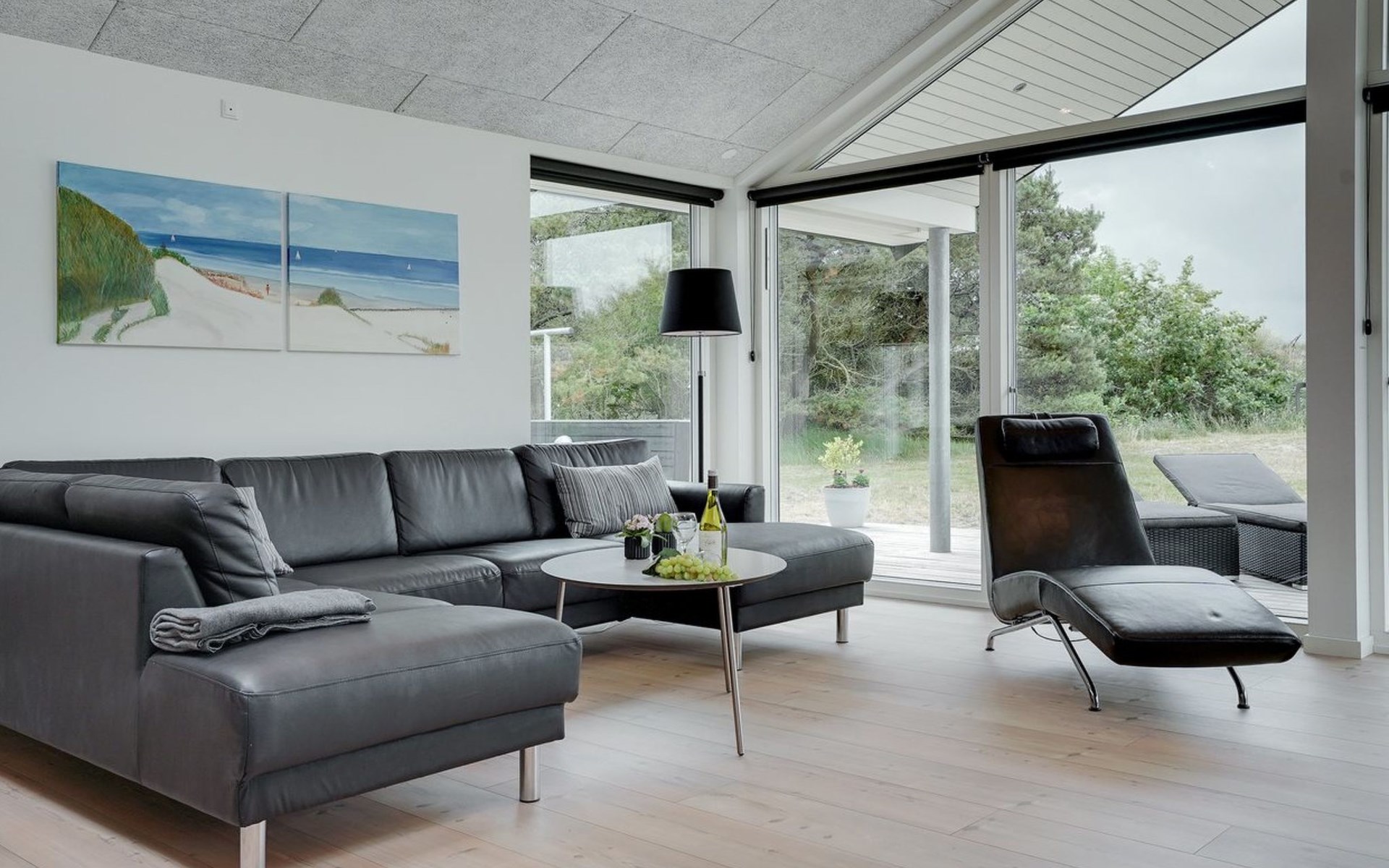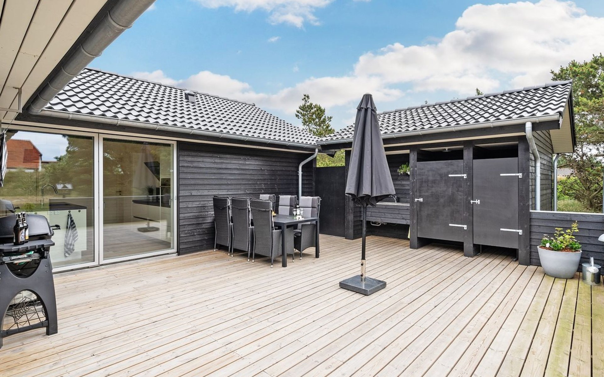 Einfamilienhaus, Baujahr 2018. 900 m vom Meer. Zur Alleinbenutzung: naturbelassenes Grundstück 1'955 m2. Aussendusche, Terrasse (110 m2), Grill, Kinderspielplatz (Schaukel). Im Hause: Sauna, Trampolin, Waschmaschine, Wäschetrockner. Parkplatz beim Haus. E-Ladestation. Lebensmittelgeschäft 1.5 km. Der Besitzer akzeptiert keine Jugendgruppen.