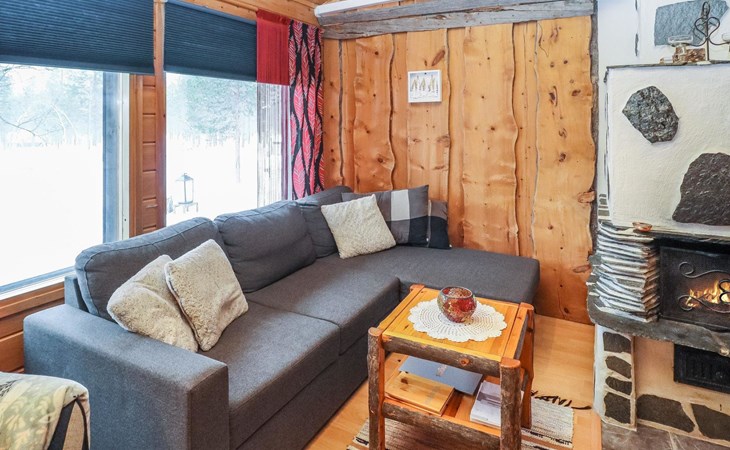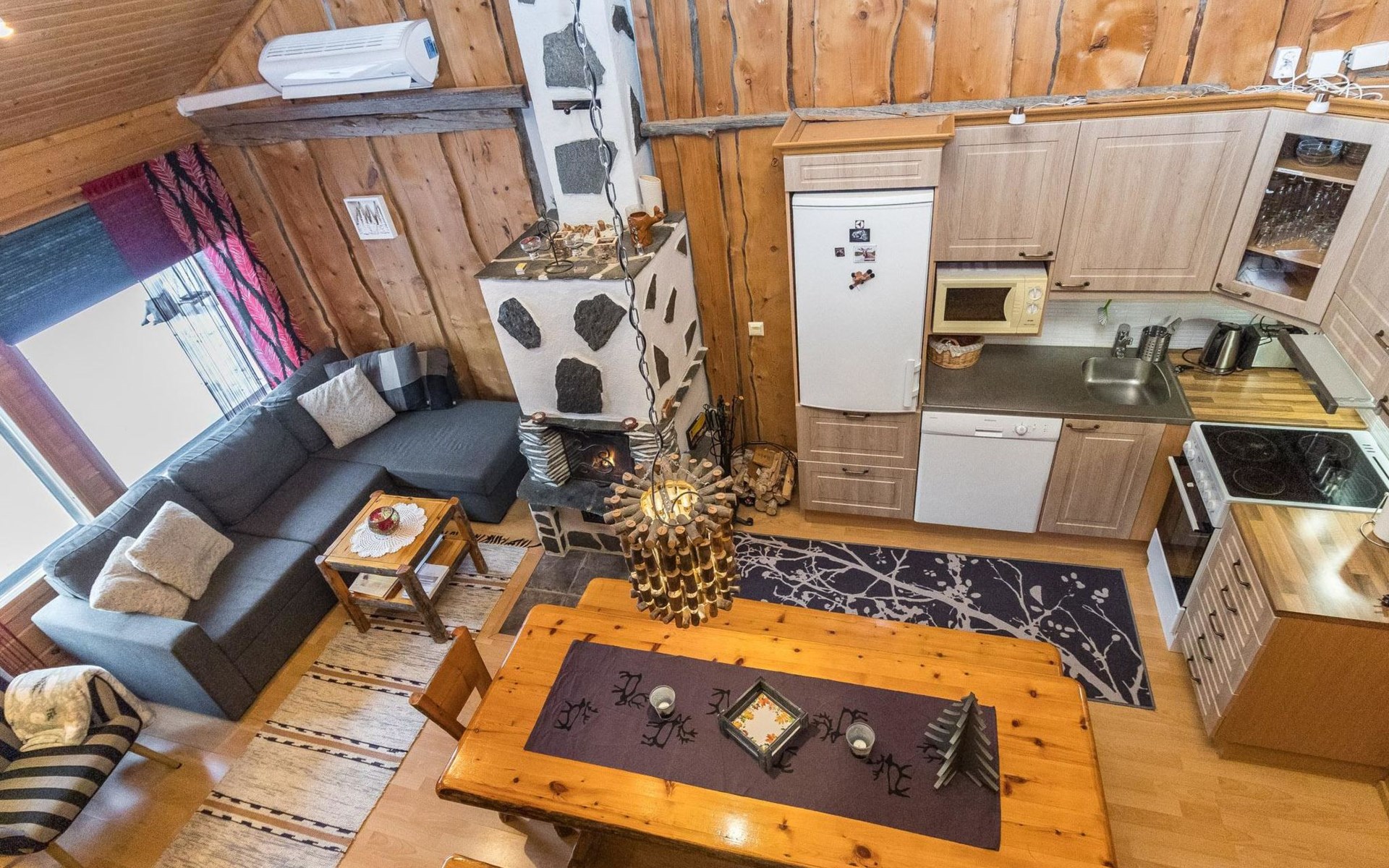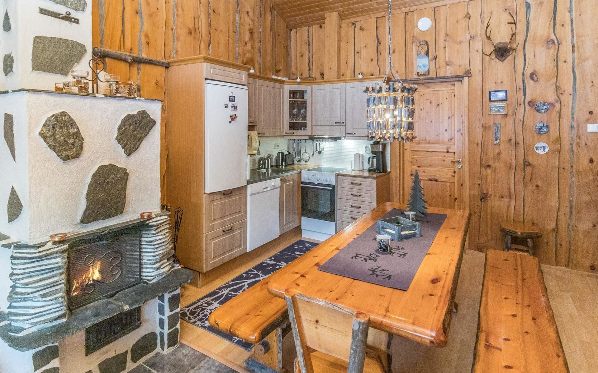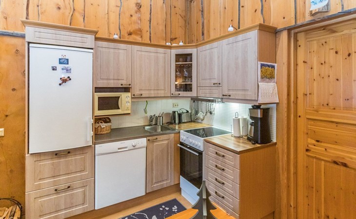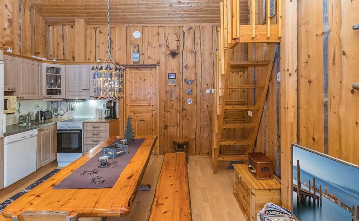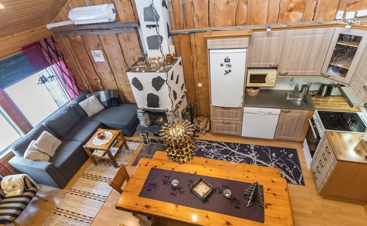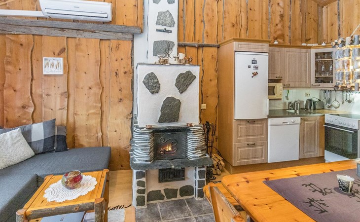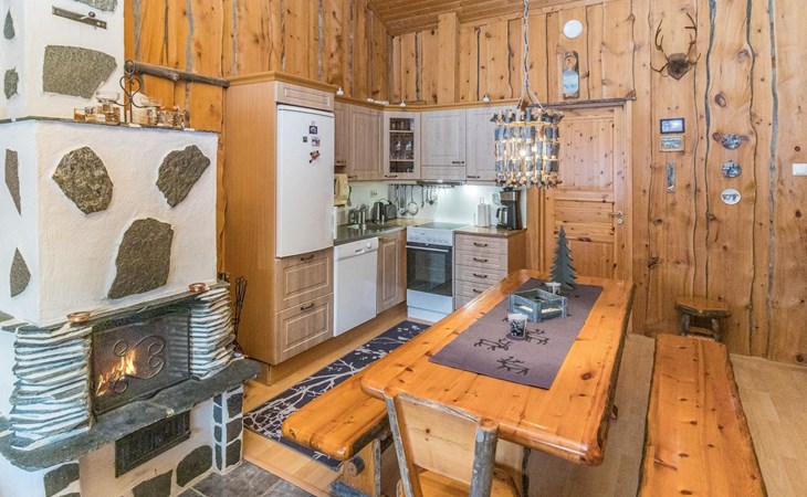The open-plan kitchen-living room allows for socialising and relaxed get-togethers while enjoying the warmth of the fireplace.