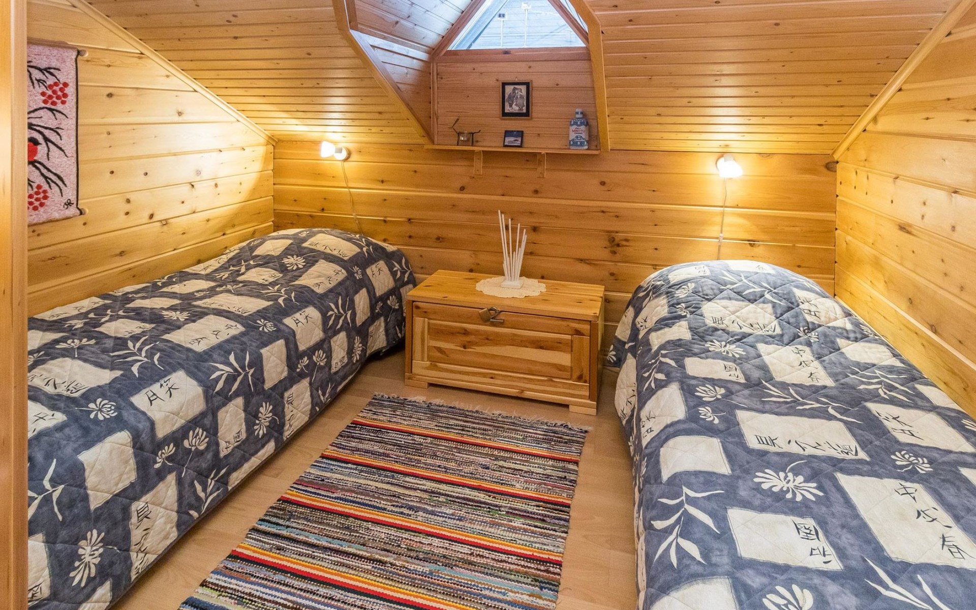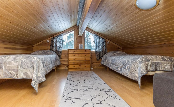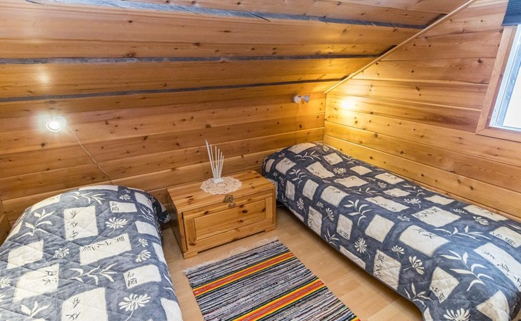 From the living room there are stairs to an open loft with two beds. One bedroom in the apartment has two single beds and its own shower and toilet. The second bedroom has two single beds.