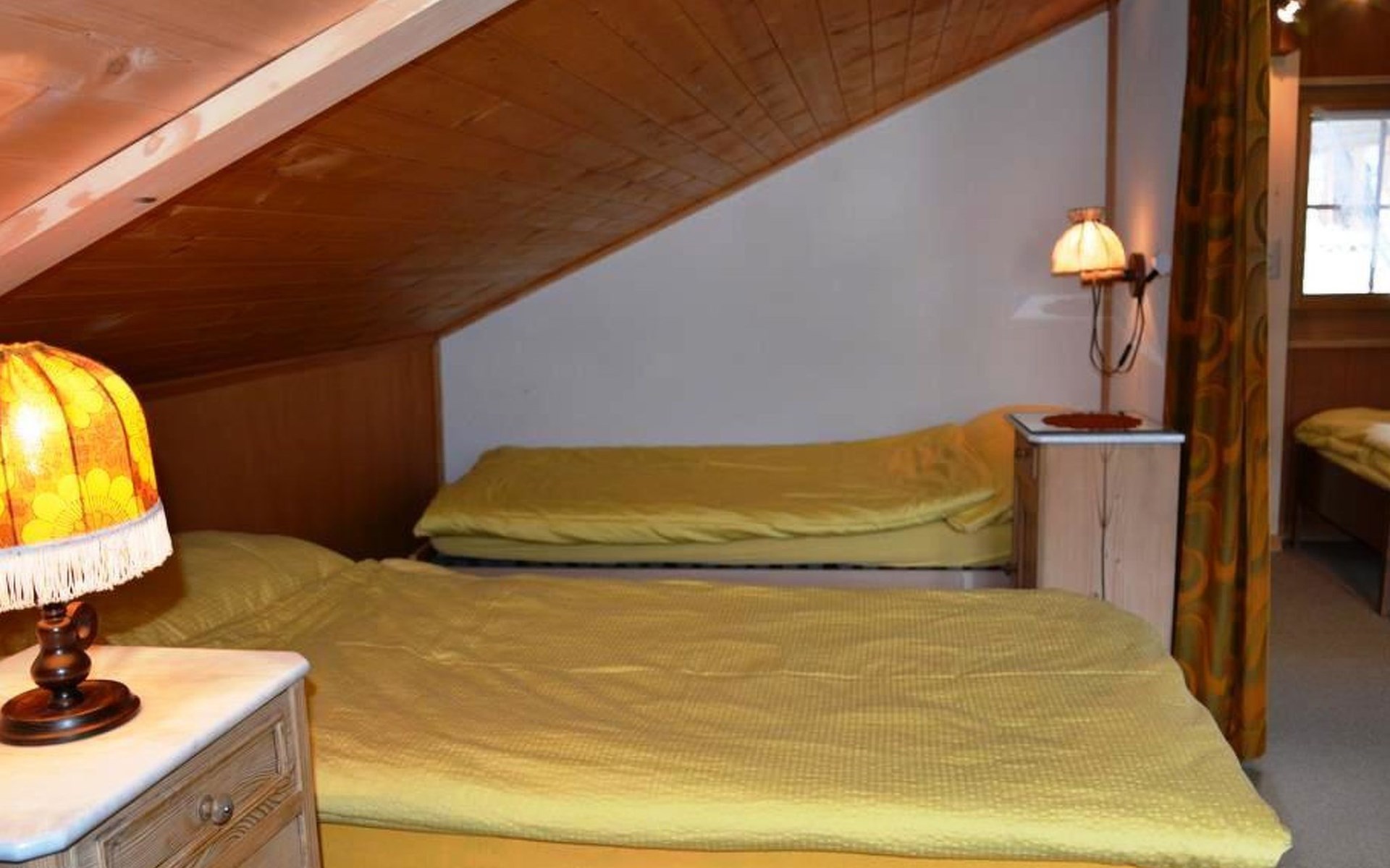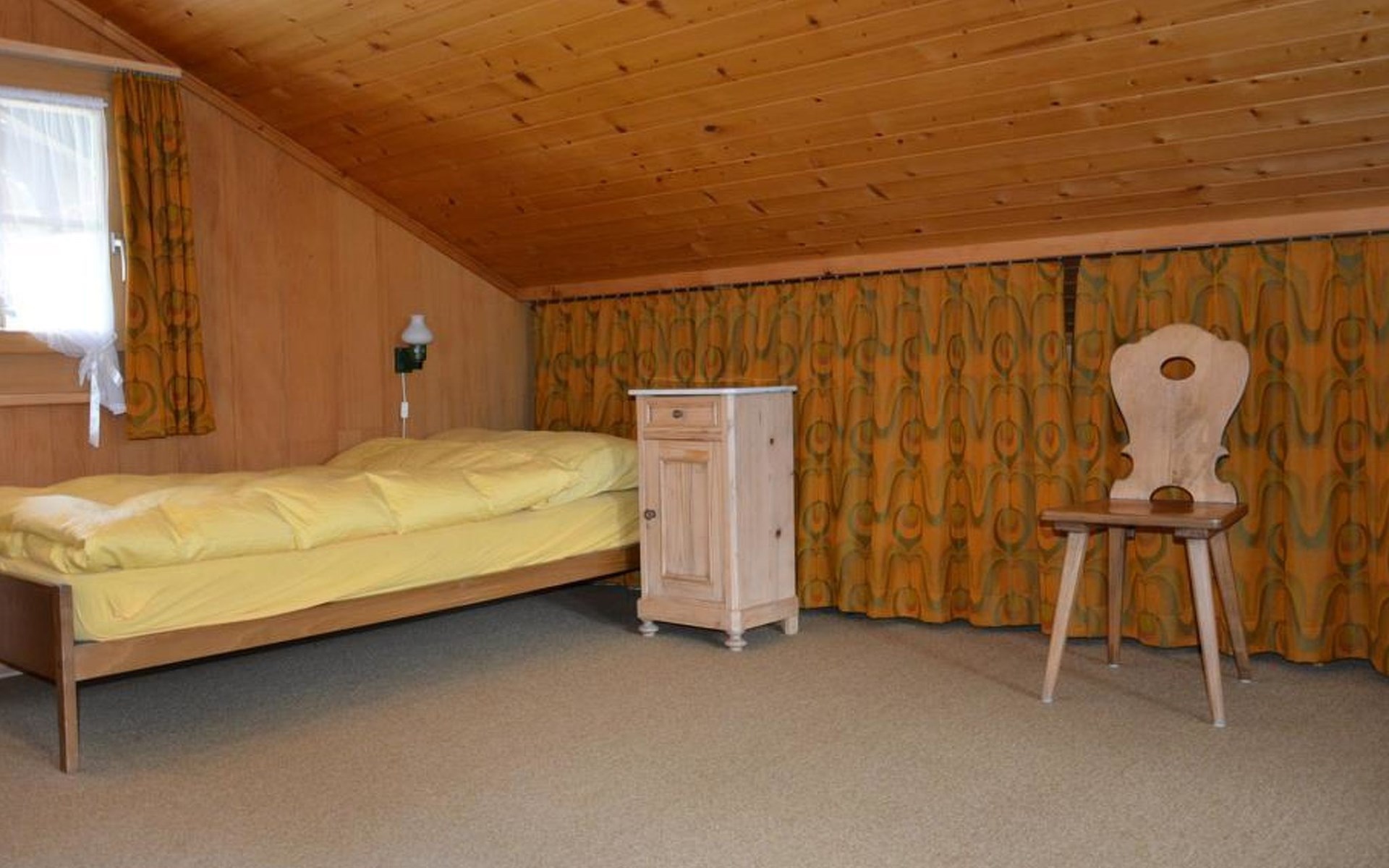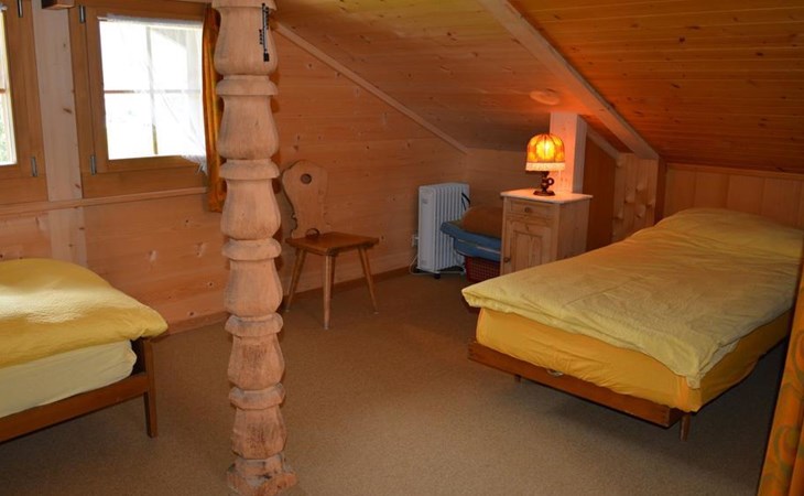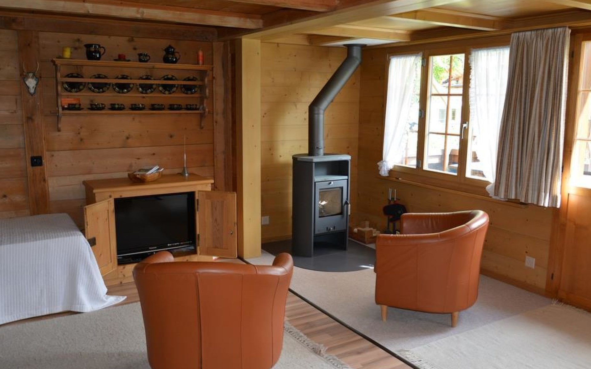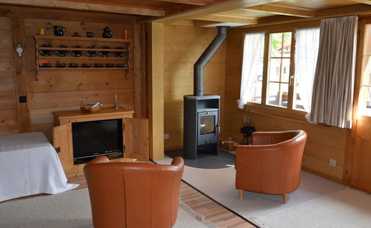 Wohnzimmer mit Schwedenofen, gemütlicher Sitz- und Essecke. Offene Küche mit Backofen und einem Kochherd mit 3 Kochplatten. Der Kühlschrank mit Gefrierfach befindet sich im Eingangsbereich. Fondue- und Raclette-Set, Kapsel-Kaffeemaschine (Nespresso), Radio, TV (nur 5 Sender), Telefon. 1 kleines Badezimmer mit Dusche/WC. 1 Schlafzimmer mit zwei Einzelbetten im Wohnzimmer (2x90x195cm) integriert. Eine steilere Treppe führt in die obere Etage zu 1 Schlafzimmer mit 4 Einzelbetten (je 90x195cm).