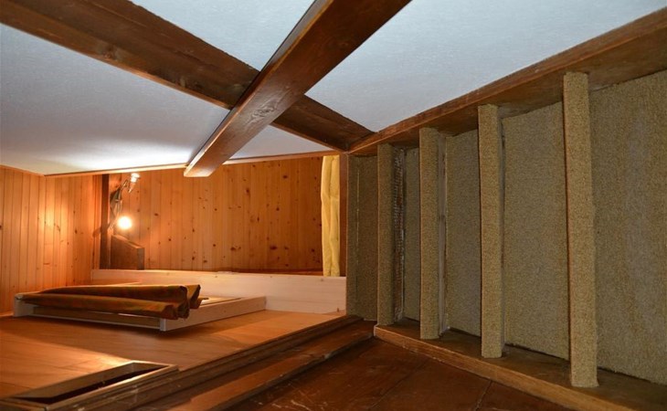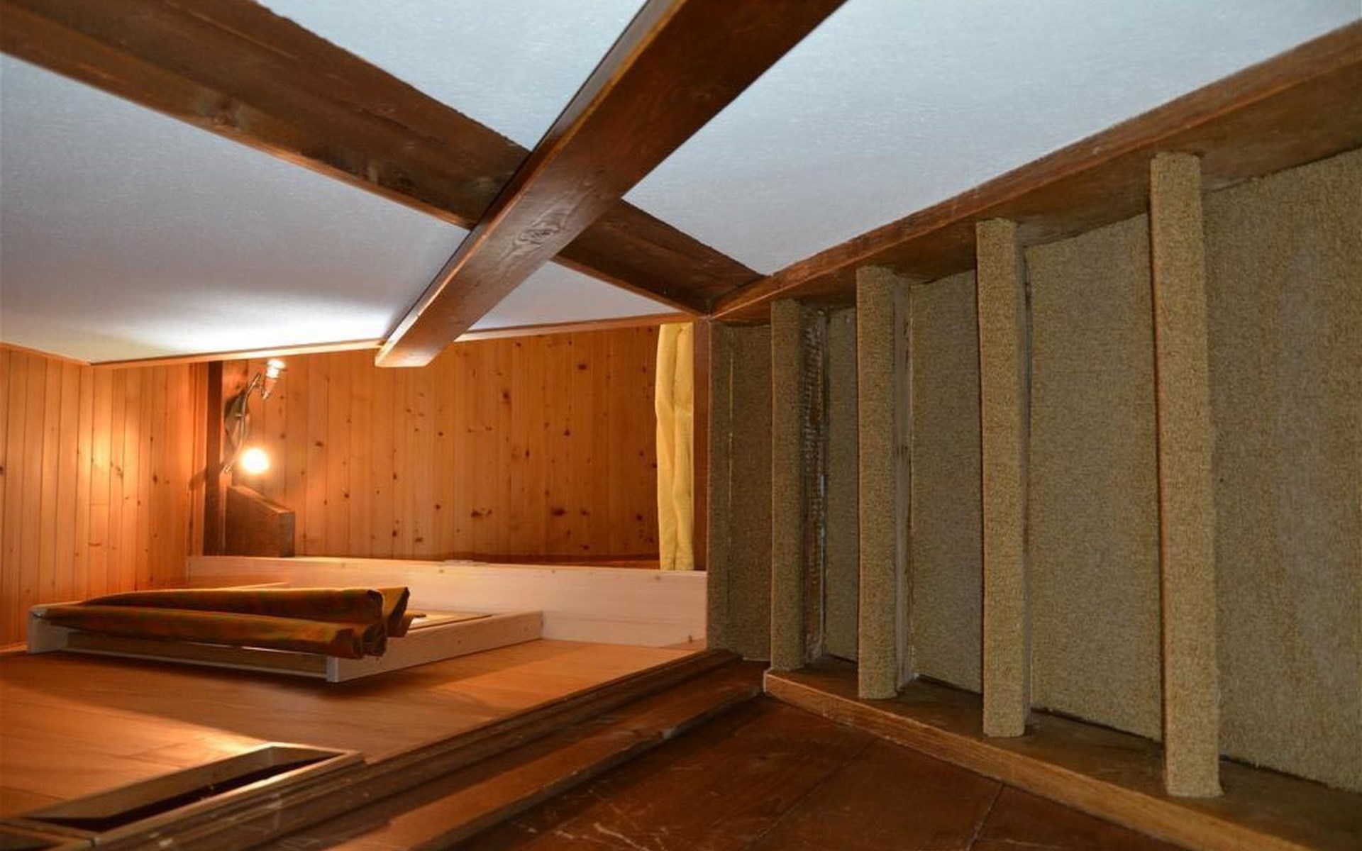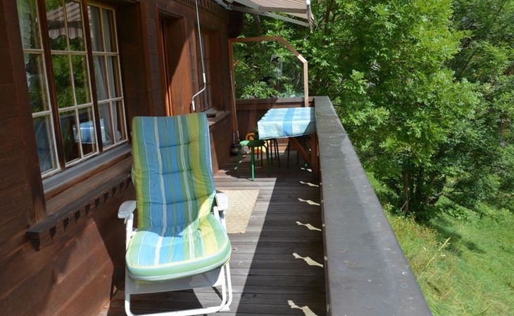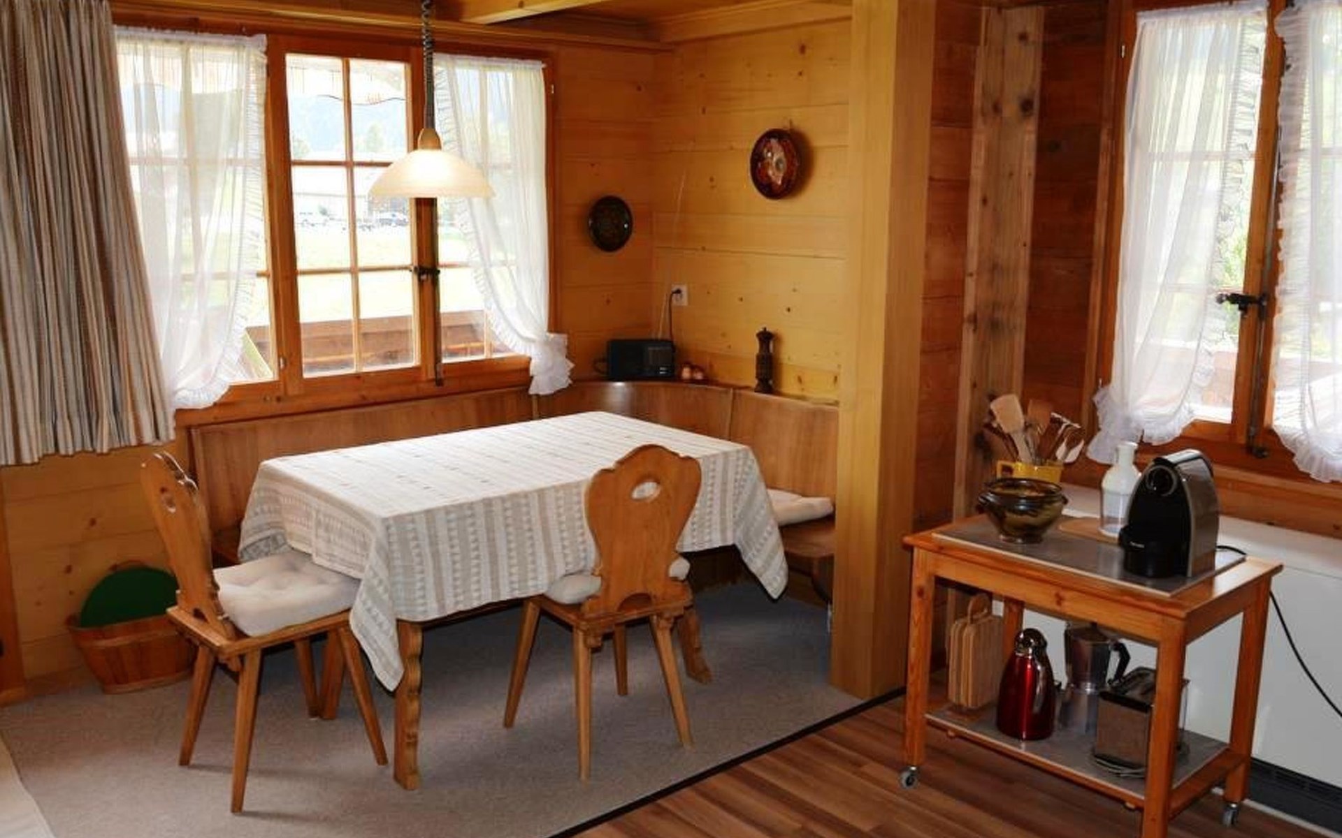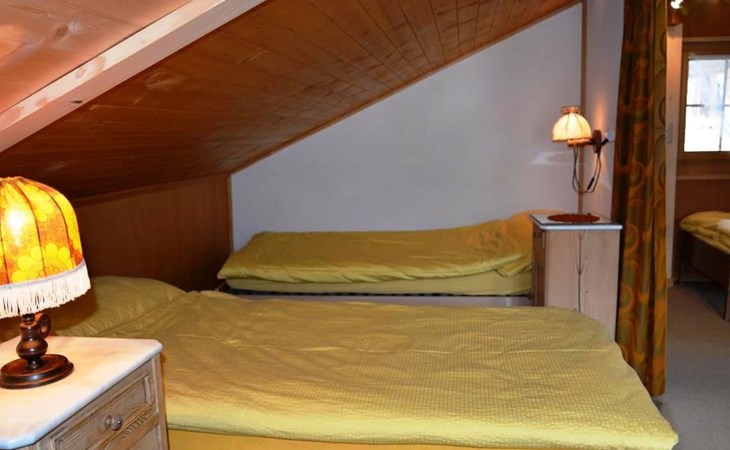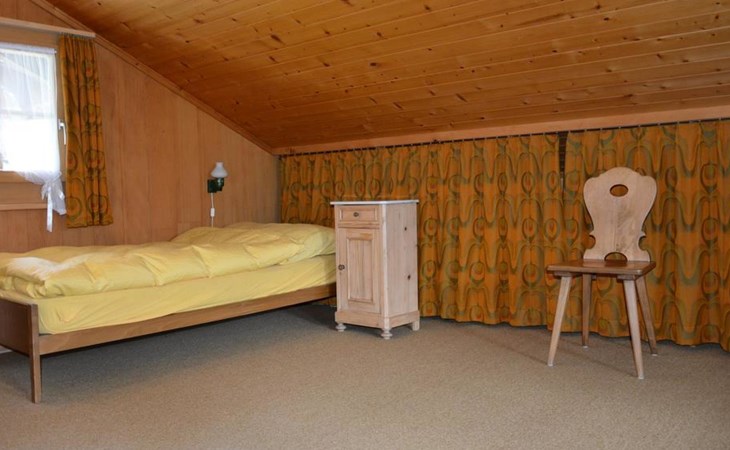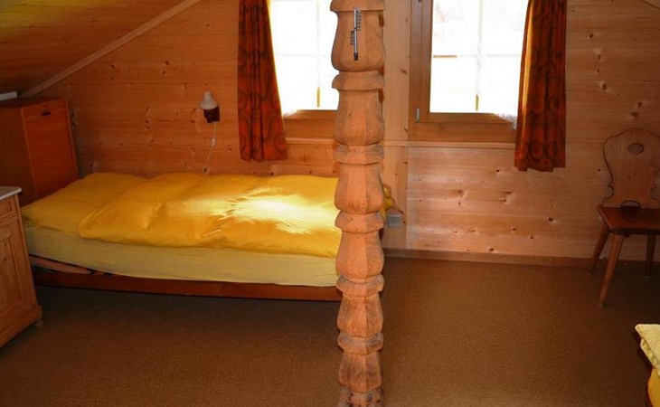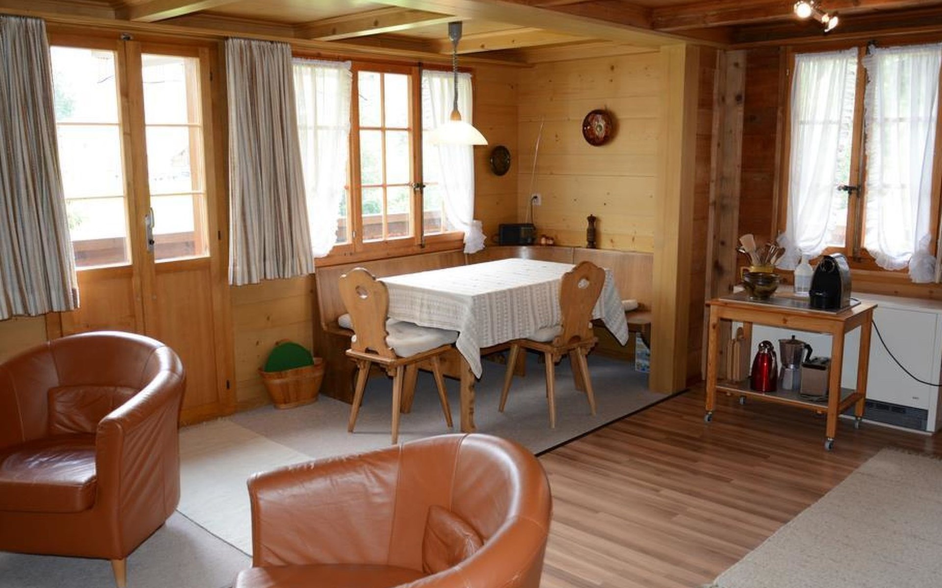 Wohnzimmer mit Schwedenofen, gemütlicher Sitz- und Essecke. Offene Küche mit Backofen und einem Kochherd mit 3 Kochplatten. Der Kühlschrank mit Gefrierfach befindet sich im Eingangsbereich. Fondue- und Raclette-Set, Kapsel-Kaffeemaschine (Nespresso), Radio, TV (nur 5 Sender), Telefon. 1 kleines Badezimmer mit Dusche/WC. 1 Schlafzimmer mit zwei Einzelbetten im Wohnzimmer (2x90x195cm) integriert. Eine steilere Treppe führt in die obere Etage zu 1 Schlafzimmer mit 4 Einzelbetten (je 90x195cm).