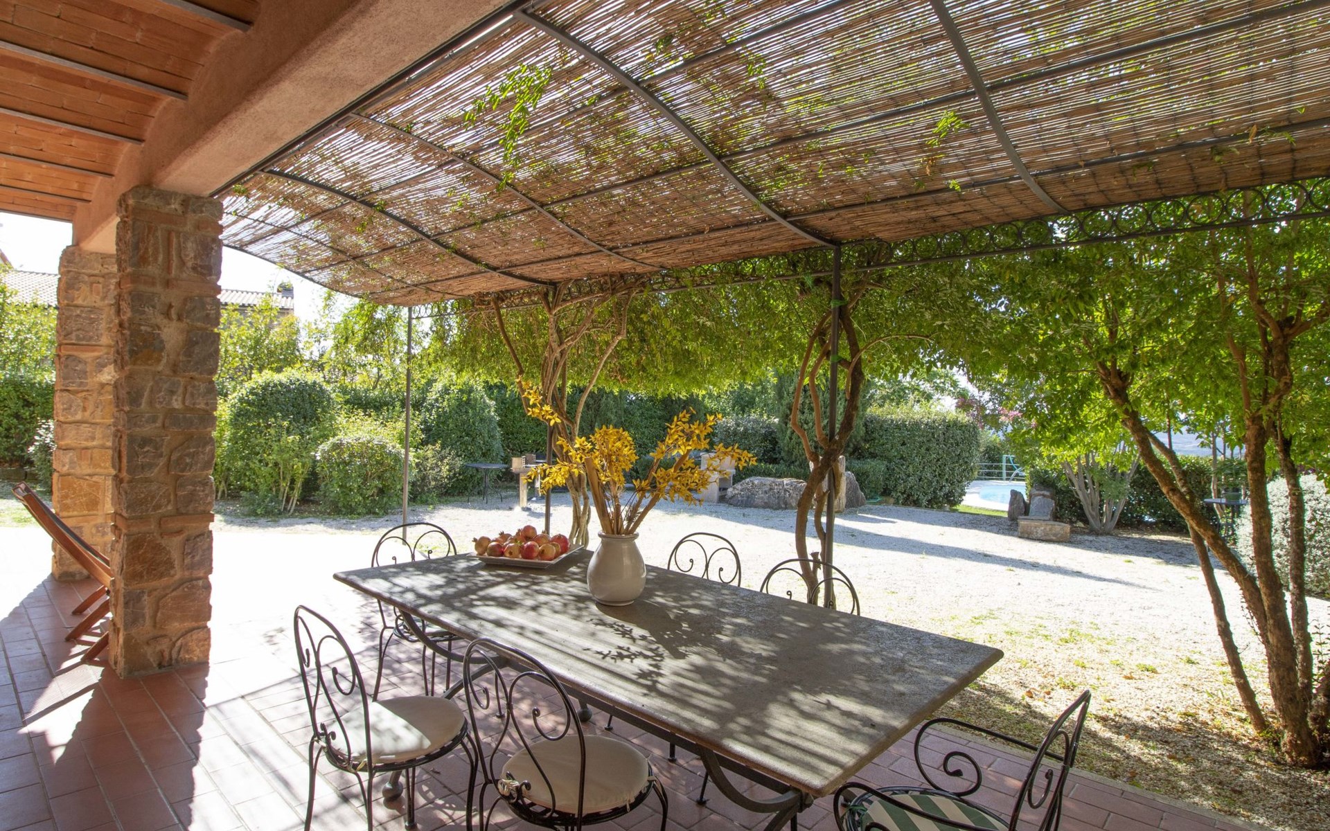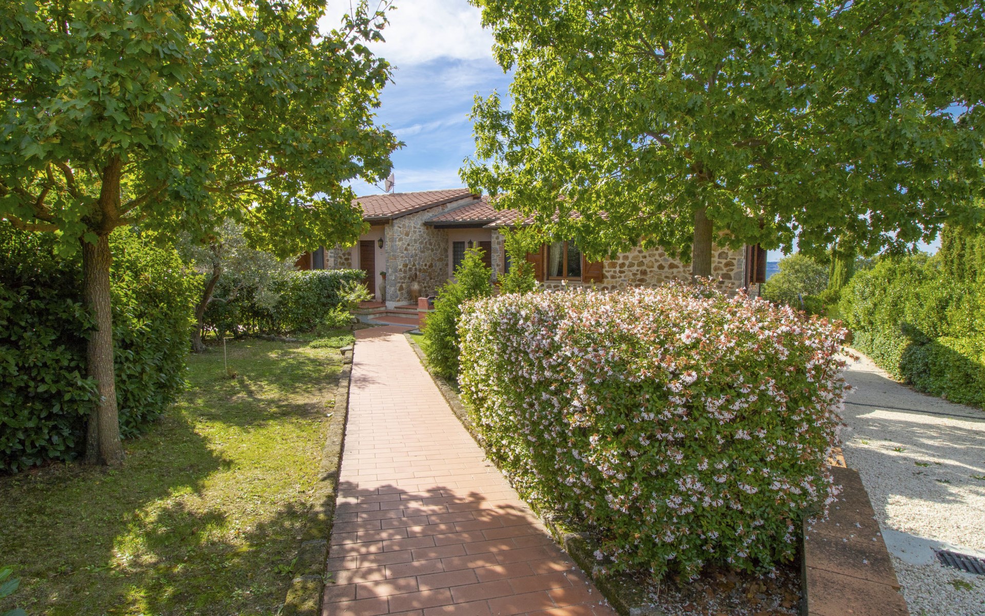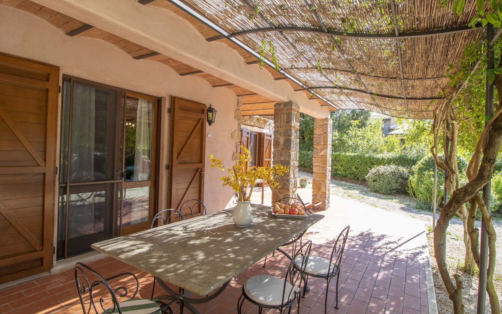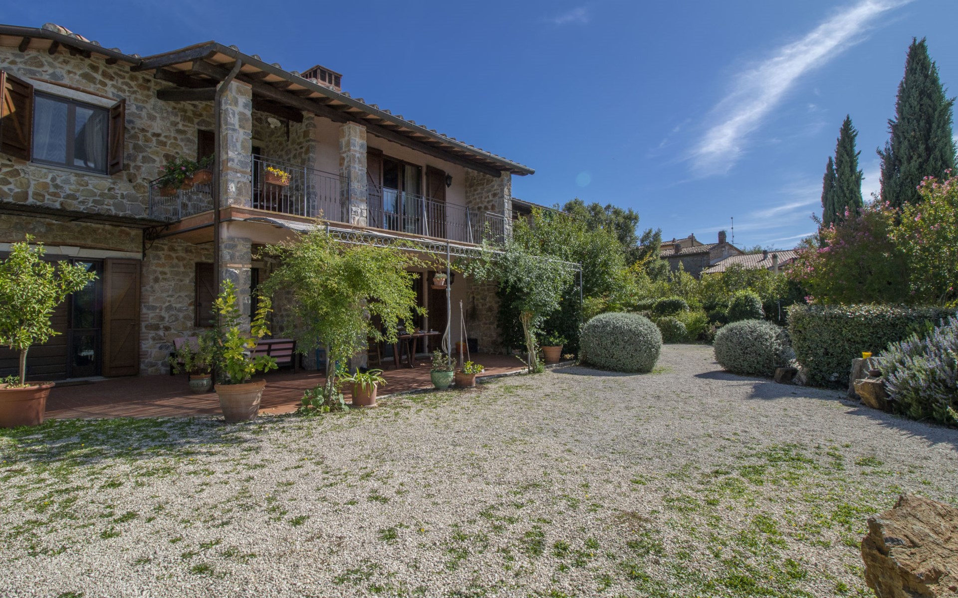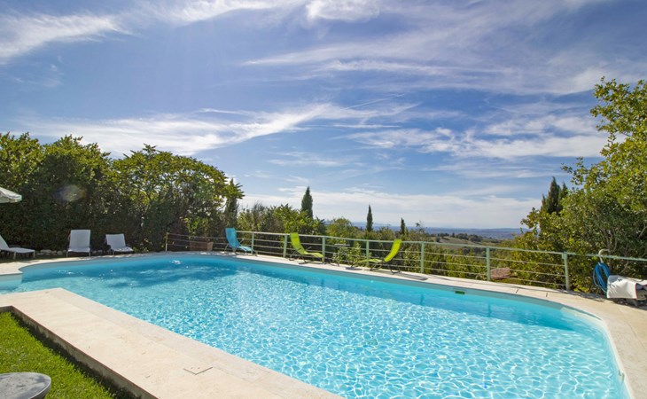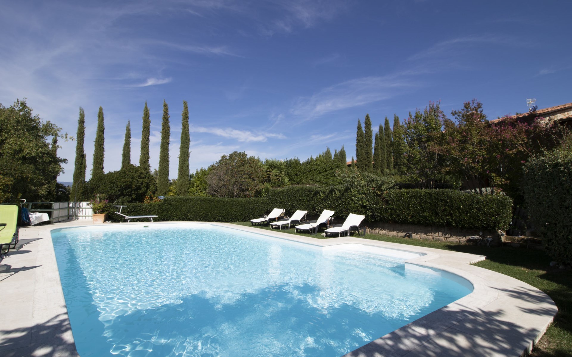 Das Anwesen liegt auf einem Hügel mit fantastischer Panoramasicht bis zum Meer und den Inseln Giglio und Montecristo (480 m.ü.M). Oberhalb der kleinen mittelalterlichen Dörfer Montemerano und Saturnia gelegen, bekannt für die warmen, natürlichen Wasserfälle und die Thermalbäder. Schöne, freistehende Villa 480 m.ü.M., auf 2 Stockwerken. Im Weiler Poderi, 7 km vom Zentrum von Saturnia, 3 km vom Zentrum von Montemerano, 3 km vom Zentrum von Manciano, ruhige, sonnige Lage auf einem Hügel, 50 m vom Waldrand, 3500 km vom Meer, 35 km vom Strand, im Grünen. Zur Alleinbenutzung: Grundstück 2'000 m2 (eingezäunt), wunderschöner Garten zum Entspannen, Schwimmbad (7 x 14 m, 110 - 170 cm tief, saisonale Verfügbarkeit: 01.Jun. - 30.Sep.) mit Innentreppe und Salzelektrolyse-Reinigungssystem. Aussendusche, Terrasse, Gartenmöbel, Grill, Poolpflege durch den Besitzer/Gärtner. Im Hause: Waschmaschine. Wohnungsreinigung möglich (extra). Parkplatz. Einkaufsgeschäft 2 km, Supermarkt 3 km, Restaurant 2 km, Bäckerei 2 km, Café 2 km, Fahrradverleih 4 km, Bushaltestelle 200 m, Bahnstation "Orbetello" 35 km, Sandstrand "Giannella - Feniglia" 37 km, Thermalbad "Saturnia" 8 km, Badesee "Bolsena" 46 km. Golfplatz (18 Loch) 8 km, Tennis 6 km, Reitstall 6 km, Wanderwege ab Haus 50 m. Nahe gelegene Sehenswürdigkeiten: Pitigliano 20 km, Scansano 25 km, Capalbio 30 km, Monte Argentario 35 km, Grosseto 55 km. Bekannte Seen in der Umgebung sind gut erreichbar: Bolsena 45 km. Bitte beachten: Fahrzeug empfohlen. Ein Teil des Hauses ist geschlossen und nicht bewohnt. Strände beim Monte Argentario und des Naturschutzparkes Parco d'Urcellina, 35 km. Mitten in der Maremma und nahe bei Etruskerausgrabungen gelegen. Siena und die übrige Toskana sind leicht erreichbar. Ausgestattete Terrasse mit Sicht auf das Tal, Garten mit Kräutern. Druckstrahlmassage in einer der Badewannen.