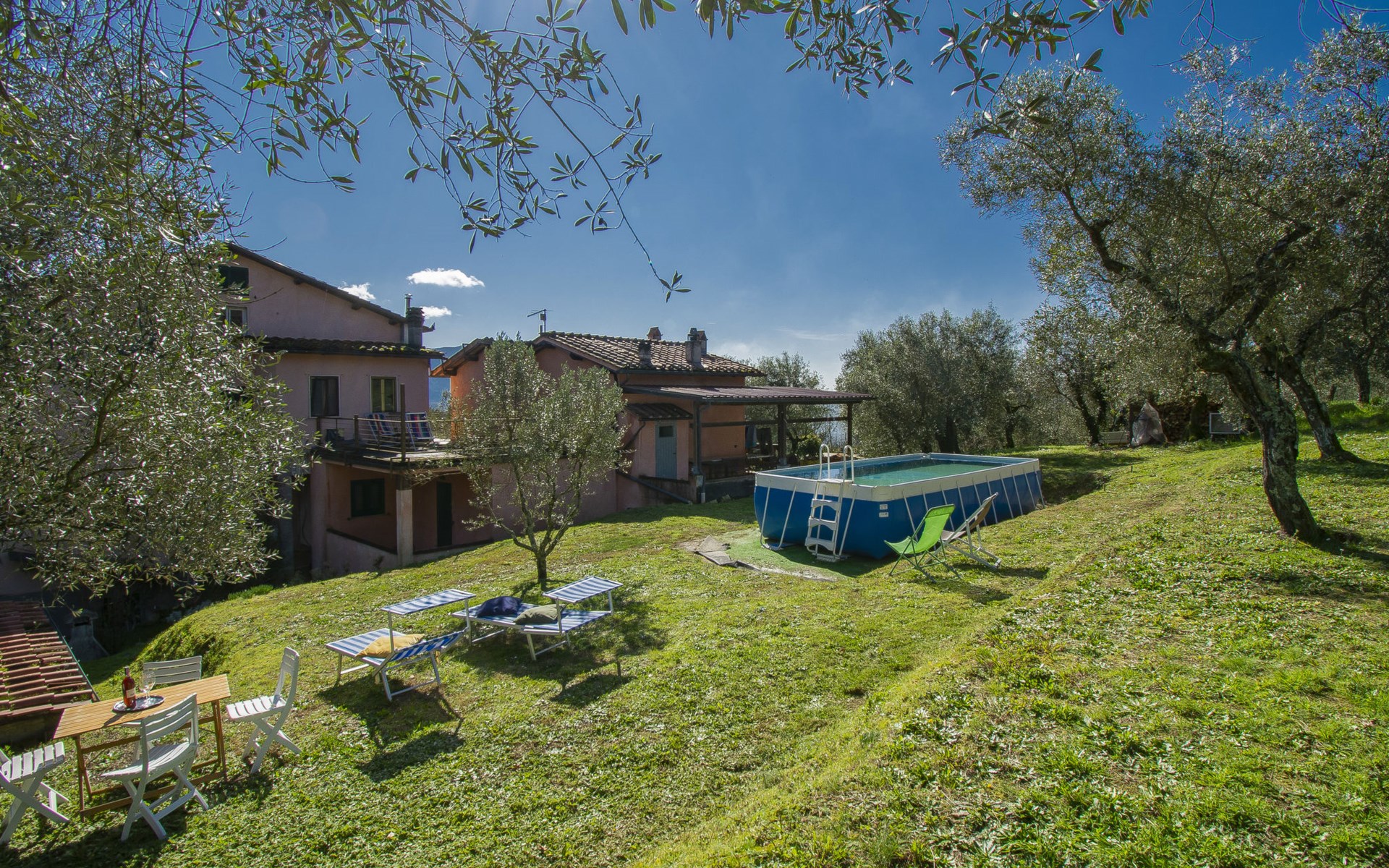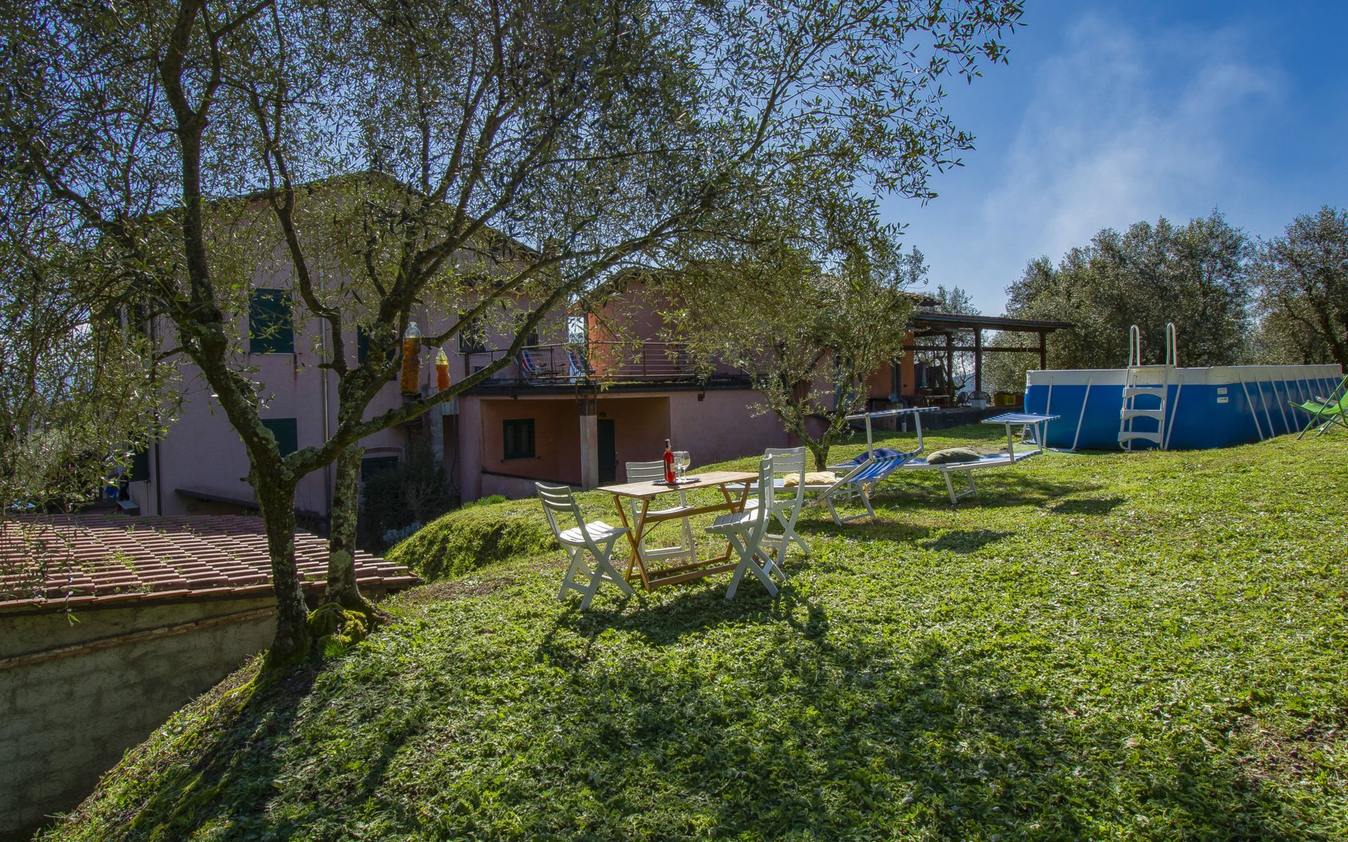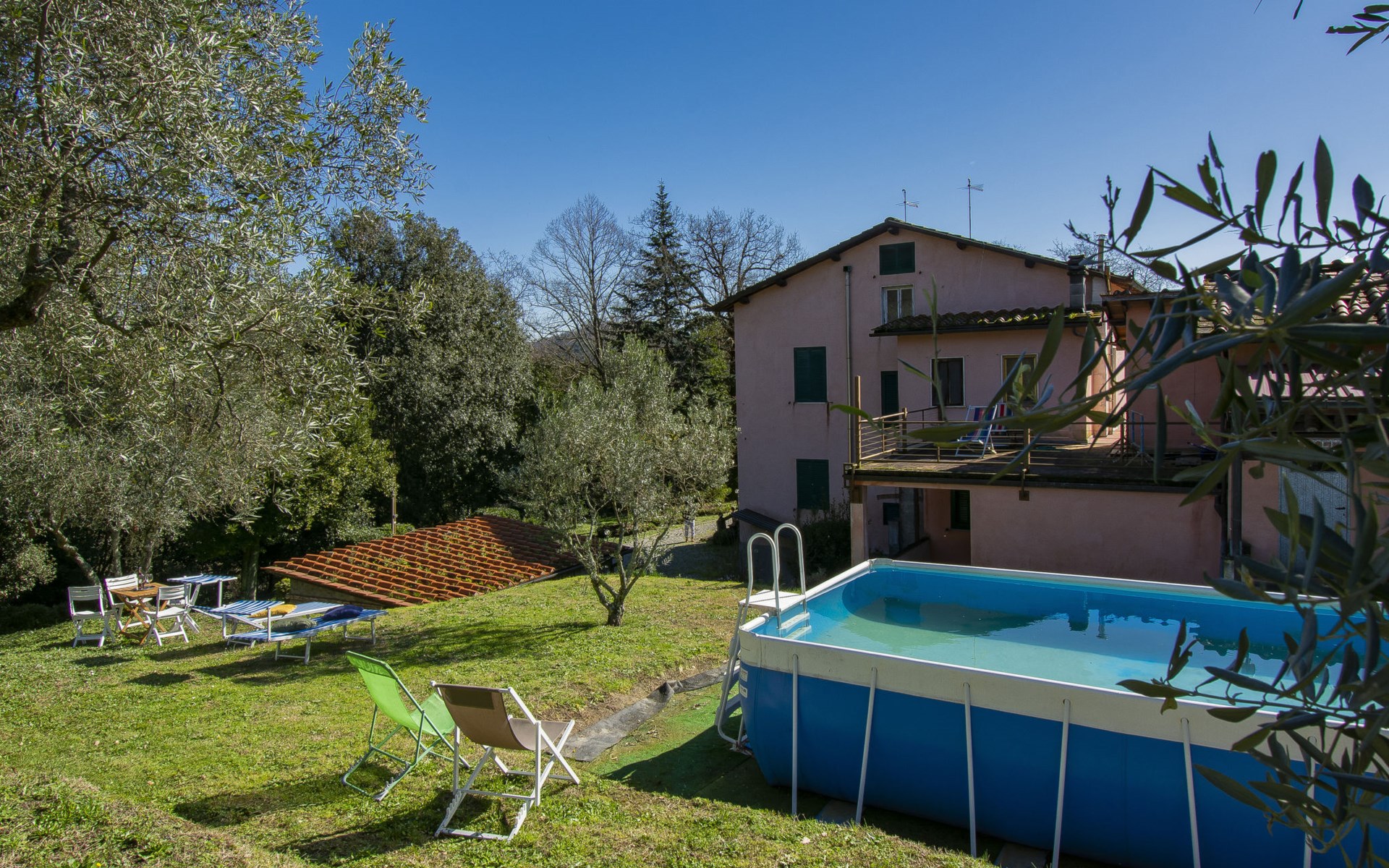 Gemütlicher, freistehender, komfortabler Landsitz "La Pergola", Baujahr 1888, renoviert im Jahre 2021, umgeben von Bäumen und Feldern. Im Ortsteil San Macario in Monte, ausserhalb des Ortes, 6 km vom Zentrum von Lucca. Zur Alleinbenutzung: Naturgarten 1'000 m2, wunderschöner Garten zum Entspannen, Teich, Aufstellpool nicht einsehbar (7 x 4 m, 120 - 120 cm tief, saisonale Verfügbarkeit: 01.Mai. - 30.Sep.). Gartenmöbel, Grill, Kinderspielplatz (Rutschbahn, Schaukel). Im Hause: Wireless LAN, Zentralheizung, Waschmaschine, Heizung nur verfügbar von 15.Nov. - 15.Apr.. Zufahrt (300 m Naturweg). Parkplatz (für 3 Autos). Lebensmittelgeschäft 1 km, Supermarkt 3 km, Restaurant 1 km, Bushaltestelle 450 m. Nahe gelegene Sehenswürdigkeiten: Lucca 6 km, Pisa 25 km, Viareggio 20 km, Firenze 85 km. Bitte beachten: Ein Teil des Hauses ist geschlossen und nicht bewohnt. Besitzer wohnt in separatem Hausteil. Eigentümer hat einen Hund.
